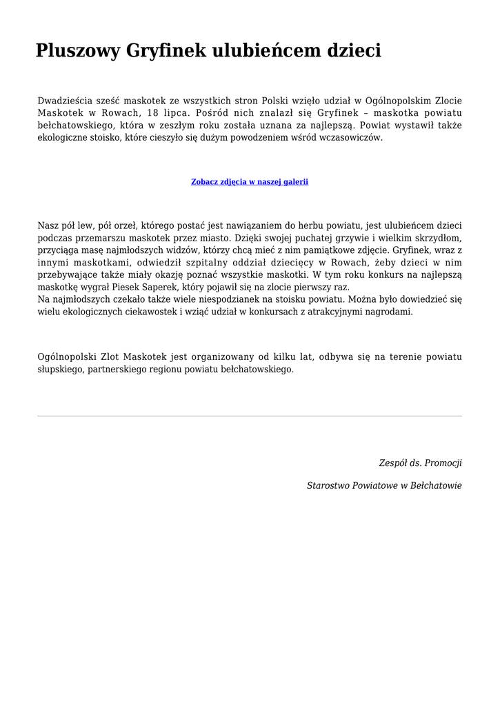 Pluszowy Gryfinek ulubieńcem dzieci Dwadzieścia sześć maskotek ze wszystkich stron Polski wzięło udział w Ogólnopolskim Zlocie Maskotek w Rowach, 18 lipca. Pośród nich znalazł się Gryfinek – maskotka powiatu bełchatowskiego, która w zeszłym roku została uznana za najlepszą. Powiat wystawił także ekologiczne stoisko, które cieszyło się dużym powodzeniem wśród wczasowiczów. Zobacz zdjęcia w naszej galerii Nasz pół lew, pół orzeł, którego postać jest nawiązaniem do herbu powiatu, jest ulubieńcem dzieci podczas przemarszu maskotek przez miasto. Dzięki swojej puchatej grzywie i wielkim skrzydłom, przyciąga masę najmłodszych widzów, którzy chcą mieć z nim pamiątkowe zdjęcie. Gryfinek, wraz z innymi maskotkami, odwiedził szpitalny oddział dziecięcy w Rowach, żeby dzieci w nim przebywające także miały okazję poznać wszystkie maskotki. W tym roku konkurs na najlepszą maskotkę wygrał Piesek Saperek, który pojawił się na zlocie pierwszy raz. Na najmłodszych czekało także wiele niespodzianek na stoisku powiatu. Można było dowiedzieć się wielu ekologicznych ciekawostek i wziąć udział w konkursach z atrakcyjnymi nagrodami. Ogólnopolski Zlot Maskotek jest organizowany od kilku lat, odbywa się na terenie powiatu słupskiego, partnerskiego regionu powiatu bełchatowskiego. Zespół ds. Promocji Starostwo Powiatowe w Bełchatowie