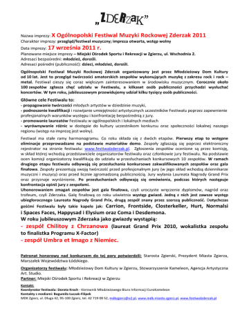 Nazwa imprezy: X Ogólnopolski Festiwal Muzyki Rockowej Zderzak Charakter imprezy: przegląd/festiwal muzyczny; impreza otwarta, wstęp wolny 2011 Data imprezy: 17 września 2011 r. Planowane miejsce imprezy – Miejski Ośrodek Sportu i Rekreacji w Zgierzu, ul. Wschodnia 2. Adresaci bezpośredni: młodzież, dorośli. Adresaci pośredni (publicznośd): dzieci, młodzież, dorośli. Ogólnopolski Festiwal Muzyki Rockowej Zderzak organizowany jest przez Młodzieżowy Dom Kultury od 10 lat. Jest to przegląd twórczości amatorskich zespołów wykonujących muzykę z zakresu rock i rock – metal. Festiwal cieszy się coraz większym zainteresowaniem w środowisku muzycznym. Corocznie około 100 zespołów zgłasza chęd udziału w Festiwalu, a kilkaset osób publiczności przychodzi wysłuchad koncertów. W tym roku, jubileuszowym przewidujemy udział kilku tysięcy osób publiczności. Główne cele Festiwalu to: - propagowanie twórczości młodych artystów w dziedzinie muzyki, - podnoszenie kwalifikacji i rozwijanie umiejętności artystycznych uczestników Festiwalu poprzez zapewnienie profesjonalnych warunków występu i konfrontację bezpośrednią z jury. - promowanie laureatów Festiwalu w ogólnopolskich i lokalnych mediach - wyrównywanie różnic w dostępie do kultury uczestnikom konkursu oraz społeczności lokalnej naszego regionu (wstęp na imprezę jest wolny). Festiwal ma stałe ramy harmonogramu. Co roku składa się z dwóch etapów. Pierwszy etap to wstępne eliminacje przeprowadzane na podstawie materiałów demo. Zespoły zgłaszają się poprzez elektroniczny rejestrator na stronie festiwalu: www.festiwalzderzak.pl. Zgłoszenia zespołów ocenione są przez komisję, w skład której wchodzą przedstawiciele organizatorów festiwalu oraz członkowie jury festiwalu. Na podstawie ocen komisji organizatorzy kwalifikują do udziału w przesłuchaniach konkursowych 10 zespołów. W ramach drugiego etapu festiwalu odbywają się przesłuchania konkursowe zakwalifikowanych zespołów oraz gala finałowa. Zespoły prezentują swoją twórczośd przed profesjonalnym jury (w jego skład wchodzą dziennikarze muzyczni i muzycy) oraz przed licznie zgromadzoną publicznością. Jury wyłania Laureata Nagrody Grand Prix oraz przyznaje wyróżnienie. Po przesłuchaniach odbywają się omówienia, podczas których następuje konfrontacja opinii jury z zespołami. Uhonorowaniem zmagao zespołów jest gala finałowa, czyli uroczyste wręczenie dyplomów, nagród oraz trofeum, czyli Zderzaka. Galę finałową co roku uświetnia występ gwiazd. Jedną z nich jest zawsze występ ubiegłorocznego Laureata Nagrody Grand Prix, drugą zespół znany przez szerszą publicznośd. Dotychczas gośdmi Festiwalu były takie kapele jak: Carrion, Frontside, Closterkeller, Hurt, Normalsi i Spaces Faces, Happysad i Elysium oraz Coma i Desdemona. W roku jubileuszowym Zderzaka jako gwiazdy wystąpią: - zespół Chilitoy z Chrzanowa (laureat Grand Prix 2010, wokalistka zespołu to finalistka Programu X-Factor) - zespół Umbra et Imago z Niemiec. Patronat honorowy nad konkursem do tej pory potwierdzili: Starosta Zgierski, Prezydent Miasta Zgierza, Marszałek Województwa Łódzkiego. Organizatorzy festiwalu: Młodzieżowy Dom Kultury w Zgierzu, Stowarzyszenie Kameleon, Agencja Artystyczna Art. Studio. Partner: Miejski Ośrodek Sportu i Rekreacji w Zgierzu Kontakt: Koordynator festiwalu: Dorota Krach - Kierownik Młodzieżowego Biura Informacji EuroKameleon Kontakty z mediami: Bogumiła Łuczak-Filipek MDK Zgierz, ul. Długa 42, 95-100 Zgierz, tel. 42 719 08 52, [email protected], www.mdk.miasto.zgierz.pl, www.festiwalzderzak.pl