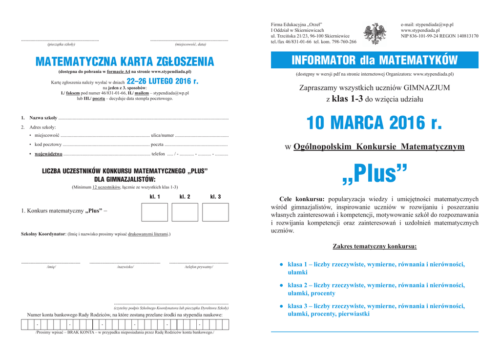 .................................................................. .................................................................. (pieczątka szkoły) (miejscowość, data) MATEMATYCZNA KARTA ZGŁOSZENIA (dostępna do pobrania w formacie A4 na stronie www.stypendiada.pl) 22–26 LUTEGO 2016 r. 2. INFORMATOR dla MATEMATYKÓW Zapraszamy wszystkich uczniów GIMNAZJUM z klas 1-3 do wzięcia udziału Nazwa szkoły ............................................................................................................................................... Adres szkoły: • miejscowość ........................................................................... ulica/numer ............................................. • kod pocztowy ......................................................................... poczta ..................................................... • województwo ......................................................................... telefon ..... / - ............ - ........... - ........... (Minimum 12 uczestników, łącznie ze wszystkich klas 1-3) kl. 2 10 MARCA 2016 r. w Ogólnopolskim Konkursie Matematycznym „Plus” LICZBA UCZESTNIKÓW KONKURSU MATEMATYCZNEGO „PLUS” DLA GIMNAZJALISTÓW: kl. 1 e-mail: [email protected] www.stypendiada.pl NIP 836-101-99-24 REGON 140813170 (dostępny w wersji pdf na stronie internetowej Organizatora: www.stypendiada.pl) Kartę zgłoszenia należy wysłać w dniach na jeden z 3. sposobów: I./ faksem pod numer 46/831-01-66, II./ mailem – [email protected] lub III./ pocztą – decyduje data stempla pocztowego. 1. Firma Edukacyjna „Orzeł” I Oddział w Skierniewicach ul. Trzcińska 21/23, 96-100 Skierniewice tel./fax 46/831-01-66 tel. kom. 798-760-266 kl. 3 1. Konkurs matematyczny „Plus” – Szkolny Koordynator: (Imię i nazwisko prosimy wpisać drukowanymi literami.) Cele konkursu: popularyzacja wiedzy i umiejętności matematycznych wśród gimnazjalistów, inspirowanie uczniów w rozwijaniu i poszerzaniu własnych zainteresowań i kompetencji, motywowanie szkół do rozpoznawania i rozwijania kompetencji oraz zainteresowań i uzdolnień matematycznych uczniów. Zakres tematyczny konkursu: .................................................. /imię/ ............................................................ .................................................. /nazwisko/ /telefon prywatny/ ● klasa 1 – liczby rzeczywiste, wymierne, równania i nierówności, ułamki ● klasa 2 – liczby rzeczywiste, wymierne, równania i nierówności, ułamki, procenty ................................................................................................. (czytelny podpis Szkolnego Koordynatora lub pieczątka Dyrektora Szkoły) Numer konta bankowego Rady Rodziców, na które zostaną przelane środki na stypendia naukowe: - - - - - - /Prosimy wpisać – BRAK KONTA – w przypadku nieposiadania przez Radę Rodziców konta bankowego./ ● klasa 3 – liczby rzeczywiste, wymierne, równania i nierówności, ułamki, procenty, pierwiastki REGULAMIN Konkurs matematyczny trwa 75 minut. Ma charakter testu wyboru. Każdy test zawiera łącznie 20 zadań zamkniętych i składa się z 4 części: A, B, C, D liczących po 5 zadań. Do każdego z 20. zadań podano cztery odpowiedzi: A, B, C, D. Karta odpowiedzi jest wkomponowana w arkusz konkursowy. Składa się z pięciu okienek: A, B, C, D, E. Uczeń zamalowuje na karcie odpowiedzi, pod numerem danego zadania, zawsze tylko jedno okienko: A, B, C lub D, jeżeli w danym zadaniu wystąpi jedna prawidłowa odpowiedź, E – jeżeli w zadaniu stwierdzi więcej niż jedną prawidłową odpowiedź lub jej brak. Punktacja: w części A za poprawną odpowiedź uczeń otrzymuje 1 punkt (łącznie 5 pkt), w części B – 2 punkty (łącznie 10 pkt), C – 3 punkty (łącznie 15 pkt), zaś D – 4 punkty (łącznie 20 pkt). W sumie można zdobyć 50 punktów. Terminarz: Konkurs należy przeprowadzić w szkole w ściśle wyznaczonym terminie. Godzinę rozpoczęcia konkursu ustala Szkolny Koordynator, którego należy powołać spośród wszystkich matematyków przygotowujących uczniów do konkursu. Opłata za udział w konkursie wynosi 7,50 zł. Za zgłoszonych uczestników należy dokonać zbiorowej płatności na konto Organizatora: 02 1020 4580 0000 1102 0100 2310 najpóźniej do 11 marca 2016 r. Warunki udziału: I./ Powołanie jednego Szkolnego Koordynatora – niezależnie od liczby matematyków organizujących konkurs w danej szkole. II./ Przesłanie Firmie Edukacyjnej „Orzeł” w dniach 22-26 LUTEGO 2016 r. KARTY ZGŁOSZENIA: faksem, mailem lub pocztą (decyduje data stempla pocztowego). III./ Zgłoszenie na konkurs matematyczny powinno zawierać łącznie nie mniej niż 12 uczestników z klas 1-3. Komplet zestawów z kartami odpowiedzi, wzór protokołu oraz wytyczne do przeprowadzenia konkursu dla gimnazjalistów Szkolny Koordynator otrzyma listem poleconym do 8 marca 2016 r. Po przeprowadzeniu konkursu, nie później niż 11 marca 2016 r., Koordynator odsyła wszystkie prace konkursowe na adres Organizatora. Ten powoła własną komisję, która sprawdzi wszystkie prace konkursowe, ustali wyniki poszczególnych uczestników oraz wyłoni spośród nich laureatów i finalistów, a także zdobywców nagród specjalnych (gwarantowanych bonusów). W sprawach nieuregulowanych ostateczną decyzję podejmuje Organizator. WYKAZ NAGRÓD: I. NAGRODY GŁÓWNE: /to przyznawane ex aequo książki, dyplomy i medale/ 1. Dla laureatów – za zajęcie: I miejsca (50 p.) – książka, dyplom oraz złoty medal laureata, II miejsca (49 p.) – dyplom i srebrny medal laureata, III miejsca (48 p.) – dyplom i brązowy medal laureata. 2. Dla finalistów – za zajęcie miejsc IV-VIII (47 – 43 p.) – wyróżnienie w postaci dyplomu oraz medalu finalisty. 3. Dla uczestników – za zajęcie miejsca od IX do LI (42 – 0 p.) – dyplom uczestnika. II. NAGRODY SPECJALNE: /to stypendia naukowe, 