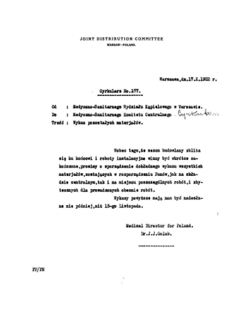 JOINT DISTRIBUTION COMMITTEE WARSAW—POLAND. Warszawa,dn.l7.X.1922 r. Oyrkularz No. 197. Od : Madyozno-Sanitarnago Wydziaiu Kapialowago w Warszawia. Do s Madyozno-Sanitarnago Komitetu Cantralnego • U.^^Vf'^-%v;\-., Tr add : Wykaz pozostaiyoh matarjaidw. Wobeo tago.za sazon budowlany zbliza sie ku korioowi 1 roboty instalaoyjna winny byd wkrdtoa zakoriozona.prosimy o sporzadzania dokiadnago wykaza wszystkioh materjaidw.zostajaoych w rozporzadzaniu Pandw.jak na sk*adzia oantralnym.tak i na miajscu poszozagdlnych robdt.i zbytaoznyoh dla prowadzonyoh obaonia robdt. Wykazy powyzsza maja nam byd nadesiana nia pdzniaj.niz 15-go Listopada. Madioal Director for Poland. Dr.J.J.Golub, FP/PN r