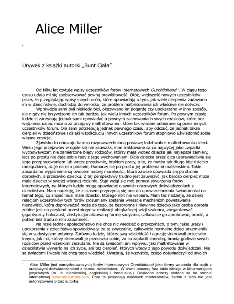 Alice Miller Urywek z ksi ki autorki „Bunt Ciaøa” Od kilku lat czytuj wpisy uczestników forów internetowych Ourchildhood . W ci gu tego czasu udaøo mi si zaobserwowa pewn prawidøowo . Otó , wi kszo nowych uczestników pisze, e przegl daj c wpisy innych osób, które opowiadaj o tym, jak wiele cierpienia zadawano im w dzieci stwie, dochodz do wniosku, e problem maltretowania ich wøa ciwe nie dotyczy. Wprawdzie sami byli niekiedy bici, okazywano im pogard czy upokarzano w inny sposób, ale nigdy nie krzywdzono ich tak bardzo, jak wielu innych uczestników forum. Po pewnym czasie ludzie ci zaczynaj jednak sami opowiada o pewnych zachowaniach swych rodziców, które bez w tpienia uzna mo na za przejawy maltretowania i które tak wøa nie odbierane s przez innych uczestników forum. Oni sami potrzebuj jednak pewnego czasu, aby odczu , e jednak tak e cierpieli w dzieci stwie i dzi ki wspóøczuciu innych uczestników forum stopniowo u wiadomi sobie wøasne emocje. Zjawisko to obrazuje bardzo rozpowszechnion postaw ludzi wobec maltretowania dzieci. Wielu jego przejawów w ogóle si nie zauwa a, inne traktowane s co najwy ej jako „wpadki wychowawcze”, nie zamierzone bø dy rodziców, którzy maj wobec dziecka jak najlepsze zamiary, lecz po prostu nie daj sobie rady z jego wychowaniem. Bicie dziecka przez ojca usprawiedliwia si jego przepracowaniem lub wr cz przeciwnie, brakiem pracy, a to, e matka tak døugo bije dziecko rami czkiem, a je na nim poøamie, tøumaczy si po prostu jej problemami maø e skimi. Takie absurdalne wyja nienia s owocem naszej moralno ci, która zawsze opowiada si po stronie dorosøych, a przeciwko dziecku. Z tej perspektywy trudno jest zauwa y , jak bardzo cierpie mo e maøe dziecko w swojej wøasnej rodzinie. St d wzi ø si mój pomysø stworzenia forów internetowych, na których ludzie mog opowiada o swoich urazowych do wiadczeniach z dzieci stwa. Mam nadziej , e z czasem przyczyni si one do upowszechnienia wiadomo ci na temat tego, co znosi musi maøe dziecko, którego nikt nie wspiera. Mam te nadziej , e dzi ki relacjom uczestników tych forów zrozumiany zostanie wreszcie mechanizm powstawania nienawi ci, która doprowadzi mo e do tego, e bezbronne i niewinne dziecko jako osoba dorosøa zdolne jest na przykøad uczestniczy w realizacji obø ka czej wizji szale ca, zorganizowa gigantyczny holocaust, zinstytucjonalizowan form sadyzmu, caøkowicie go aprobowa , broni , a potem bez trudu o nim zapomnie . Na razie jednak spoøecze stwo nie chce nic wiedzie o przyczynach, o tym, jakie urazy i upokorzenia z dzieci stwa spowodowaøy, e te zwyczajne, caøkowicie normalne dzieci przemieniøy si w sadystyczne potwory. Zarówno ludzie, którzy sw w ciekøo i agresj skierowali przeciwko innym, jak i ci, którzy skierowali je przeciwko sobie, za co zapøacili chorob , broni gorliwie swych rodziców przed wszelkimi zarzutami. Nie s wiadomi ani wpøywu, jaki maltretowanie w dzieci stwie wywarøo na ich ycie, ani te cierpie , których wtedy z jego powodu do wiadczali. Nie s wiadomi i wcale nie chc tego wiedzie . Uwa aj , e wszystko, czego do wiadczyli od swoich Alice Miller jest pomysøodawczyni forów internetowych Ourchildhood jako formy wsparcia dla osób z urazowymi do wiadczeniami z okresu dzieci stwa. W chwili obecnej fora takie istniej w kilku wersjach j zykowych (m. in. niemieckiej, angielskiej i francuskiej). Dokøadne adresy podane s na stronie internetowej www.alice-miller.com. Fora te posiadaj wøasnych moderatorów, adne z nich nie jest autoryzowane przez autork . rodziców wyszøo im tylko na dobre. W ró nego rodzaju poradnikach autoterapii i w innej literaturze psychoterapeutycznej trudno znale jednoznaczne zalecenie, by udzieli wsparcia tkwi cemu w czøowieku dorosøym skrzywdzonemu dziecku. Czytelnikowi zaleca si , aby porzuciø rol ofiary, nikogo nie obwiniaø za swoje yciowe problemy, pozostaø wierny sobie i w ten sposób uwolniø si od przeszøo ci, a przy tym zachowaø dobre stosunki z rodzicami. W radach tych, zgodnych z duchem „czarnej pedagogiki” i tradycyjnej moralno ci, tkwi gø boka sprzeczno . Mog one wywoøa w czøowieku tak wielki zam t, e w niektórych okoliczno ciach do ko ca ycia nie uda mu si opu ci pozycji zale nego dziecka, nie uda mu si dorosn . Czøowiek dorosøy ma bowiem odwag stawi czoøo swej prawdzie, zamiast si jej zapiera , ma odwag odczu wiadomie caøe swoje przeszøe cierpienie, przywoøa do wiadomo ci swoje emocje, swoj histori zapisan w pami ci ciaøa, zintegrowa j i przyj , zamiast ignorowa . To, czy b dzie on mógø utrzymywa stosunki z rodzicami, czy te nie, zale y od konkretnych okoliczno ci. Musi on jednak bezwzgl dnie uniezale ni si od nich emocjonalnie, czego cz sto nie da si osi gn bez cisøej fizycznej separacji. Musi zerwa chorobliw wi z uwewn trznionymi rodzicami z dzieci stwa, któr nazywa si miøo ci , cho ona w adnym wypadku miøo ci nie jest. Wi t buduj takie czynniki, jak wdzi czno , wspóøczucie, oczekiwania, iluzje, zamykanie oczu na prawd , posøusze stwo, l k i strach przed kar . Przez døugi czas zastanawiaøam si , dlaczego dzieje si tak, e terapia pewnych ludzie czasami bardzo szybko ko czy si sukcesem, a inni ludzie caøymi latami poddaj si psychoanalizie czy psychoterapii, a mimo to nie potrafi uwolni si od swych dolegliwo ci. Doszøam do wniosku, e ludziom, których terapia zako czyøa si sukcesem, udaøo si spotka osob , która towarzyszyøa im w ich historii, staøa si dla nich empatycznym wiadkiem, podzielaj cym ich oburzenie z powodu zachowania rodziców. Pomogøa im ona uniezale ni si emocjonalnie od rodziców, zerwa destrukcyjn wi , opu ci pozycj zale nego, krzywdzonego dziecka. Ludziom tym udaøo si dorosn , mogli zacz y w zgodzie ze sob , nie odczuwali wi c potrzeby nienawidzenia swych rodziców. Inaczej byøo w przypadku ludzi, którym podczas terapii wmówiono, e samo przebaczenie przyniesie im wyzdrowienie. Zostali oni uwi zieni na pozycji maøego dziecka, które wierzy, e ko