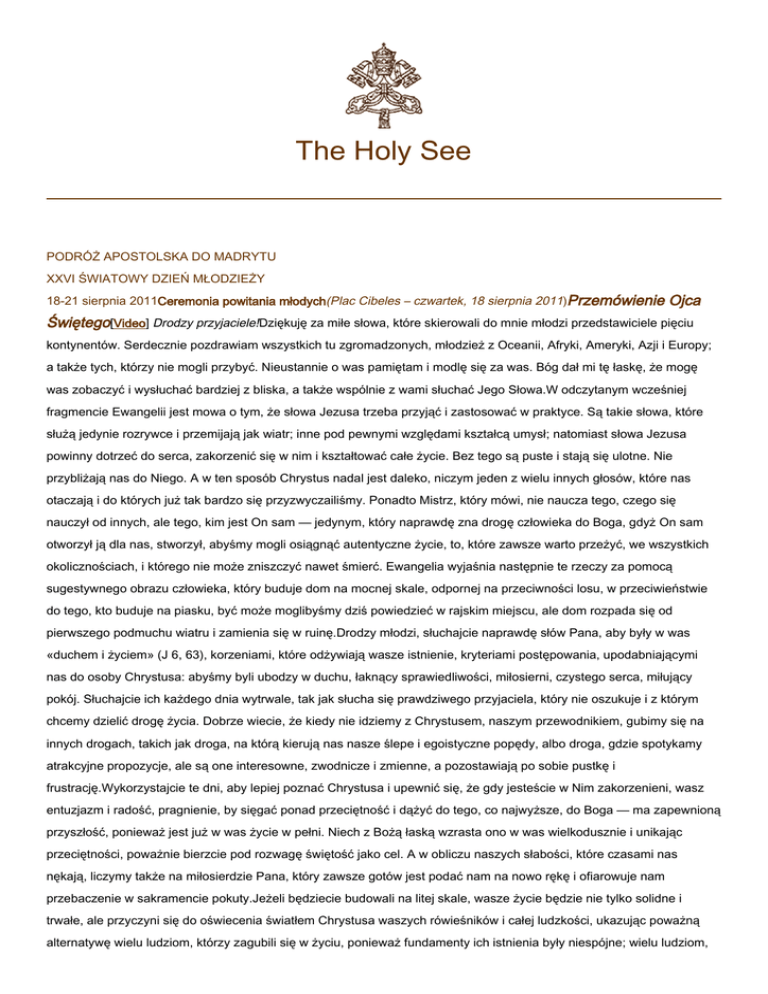 The Holy See PODRÓŻ APOSTOLSKA DO MADRYTU XXVI ŚWIATOWY DZIEŃ MŁODZIEŻY 18-21 sierpnia 2011Ceremonia powitania młodych(Plac Cibeles – czwartek, 18 sierpnia 2011)Przemówienie Ojca Świętego[Video] Drodzy przyjaciele!Dziękuję za miłe słowa, które skierowali do mnie młodzi przedstawiciele pięciu kontynentów. Serdecznie pozdrawiam wszystkich tu zgromadzonych, młodzież z Oceanii, Afryki, Ameryki, Azji i Europy; a także tych, którzy nie mogli przybyć. Nieustannie o was pamiętam i modlę się za was. Bóg dał mi tę łaskę, że mogę was zobaczyć i wysłuchać bardziej z bliska, a także wspólnie z wami słuchać Jego Słowa.W odczytanym wcześniej fragmencie Ewangelii jest mowa o tym, że słowa Jezusa trzeba przyjąć i zastosować w praktyce. Są takie słowa, które służą jedynie rozrywce i przemijają jak wiatr; inne pod pewnymi względami kształcą umysł; natomiast słowa Jezusa powinny dotrzeć do serca, zakorzenić się w nim i kształtować całe życie. Bez tego są puste i stają się ulotne. Nie przybliżają nas do Niego. A w ten sposób Chrystus nadal jest daleko, niczym jeden z wielu innych głosów, które nas otaczają i do których już tak bardzo się przyzwyczailiśmy. Ponadto Mistrz, który mówi, nie naucza tego, czego się nauczył od innych, ale tego, kim jest On sam — jedynym, który naprawdę zna drogę człowieka do Boga, gdyż On sam otworzył ją dla nas, stworzył, abyśmy mogli osiągnąć autentyczne życie, to, które zawsze warto przeżyć, we wszystkich okolicznościach, i którego nie może zniszczyć nawet śmierć. Ewangelia wyjaśnia następnie te rzeczy za pomocą sugestywnego obrazu człowieka, który buduje dom na mocnej skale, odpornej na przeciwności losu, w przeciwieństwie do tego, kto buduje na piasku, być może moglibyśmy dziś powiedzieć w rajskim miejscu, ale dom rozpada się od pierwszego podmuchu wiatru i zamienia się w ruinę.Drodzy młodzi, słuchajcie naprawdę słów Pana, aby były w was «duchem i życiem» (J 6, 63), korzeniami, które odżywiają wasze istnienie, kryteriami postępowania, upodabniającymi nas do osoby Chrystusa: abyśmy byli ubodzy w duchu, łaknący sprawiedliwości, miłosierni, czystego serca, miłujący pokój. Słuchajcie ich każdego dnia wytrwale, tak jak słucha się prawdziwego przyjaciela, który nie oszukuje i z którym chcemy dzielić drogę życia. Dobrze wiecie, że kiedy nie idziemy z Chrystusem, naszym przewodnikiem, gubimy się na innych drogach, takich jak droga, na którą kierują nas nasze ślepe i egoistyczne popędy, albo droga, gdzie spotykamy atrakcyjne propozycje, ale są one interesowne, zwodnicze i zmienne, a pozostawiają po sobie pustkę i frustrację.Wykorzystajcie te dni, aby lepiej poznać Chrystusa i upewnić się, że gdy jesteście w Nim zakorzenieni, wasz entuzjazm i radość, pragnienie, by sięgać ponad przeciętność i dążyć do tego, co najwyższe, do Boga — ma zapewnioną przyszłość, ponieważ jest już w was życie w pełni. Niech z Bożą łaską wzrasta ono w was wielkodusznie i unikając przeciętności, poważnie bierzcie pod rozwagę świętość jako cel. A w obliczu naszych słabości, które czasami nas nękają, liczymy także na miłosierdzie Pana, który zawsze gotów jest podać nam na nowo rękę i ofiarowuje nam przebaczenie w sakramencie pokuty.Jeżeli będziecie budowali na litej skale, wasze życie będzie nie tylko solidne i trwałe, ale przyczyni się do oświecenia światłem Chrystusa waszych rówieśników i całej ludzkości, ukazując poważną alternatywę wielu ludziom, którzy zagubili się w życiu, ponieważ fundamenty ich istnienia były niespójne; wielu ludziom, 2 którzy zadowalają się gonieniem za modnymi trendami, zabiegają o natychmiastową korzyść, zapominając o prawdziwej sprawiedliwości, lub szukają oparcia we własnych opiniach, zamiast szukać po prostu prawdy.Tak, wielu ludzi, siebie uważając za bogów, sądzi, że nie potrzebuje korzeni ani fundamentów poza samymi sobą. Chcieliby sami decydować o tym, co jest prawdą, a co nie, co jest dobre, a co złe, słuszne i niesłuszne; decydować, kto zasługuje na to, by żyć, a kogo można poświęcić w imię innych perspektyw; za każdym razem zdawać się na przypadek, pod wpływem chwili, bez wytyczonego kursu. Te pokusy czają się wszędzie. Ważne jest, żeby im nie ulec, bo w rzeczywistości prowadzą do czegoś nieuchwytnego, jak życie bez horyzontów, wolność bez Boga. My natomiast dobrze wiemy, że zostaliśmy stworzeni jako istoty wolne, na obraz Boga, właśnie po to, abyśmy poszukiwali prawdy i dobra; abyśmy byli odpowiedzialni za nasze czyny, a nie byli tylko ślepymi wykonawcami; abyśmy byli twórczymi współpracownikami w realizowaniu zadania uprawy i upiększania dzieła stworzenia. Bóg pragnie odpowiedzialnego rozmówcy, kogoś, kto może z Nim prowadzić dialog i Go miłować. Za pośrednictwem Chrystusa możemy to naprawdę osiągnąć, a zakorzenieni w Nim, dodajemy skrzydeł naszej wolności. Czyż nie jest to dla nas wielkim powodem do radości? Czyż nie to jest solidny grunt pod budowę cywilizacji miłości i życia, zdolnej do humanizacji każdego człowieka?Drodzy przyjaciele, bądźcie roztropni i mądrzy, budujcie wasze życie na solidnej podstawie, którą jest Chrystus. Ta mądrość i roztropność pokieruje waszymi krokami, nie będziecie niczego się lękać, a w waszych sercach zapanuje pokój. Będziecie wówczas błogosławieni, szczęśliwi, a wasza radość będzie się udzielać innym. Będą się zastanawiać, co jest tajemnicą waszego życia, i odkryją, że skałą, na której wspiera się cała budowla i na której spoczywa całe wasze życie, jest osoba samego Chrystusa, waszego przyjaciela, brata i Pana, Syna Bożego, który stał się człowiekiem, spajającego cały wszechświat. On umarł i zmartwychwstał za nas, abyśmy mieli życie, a teraz, zasiadając na tronie Ojc