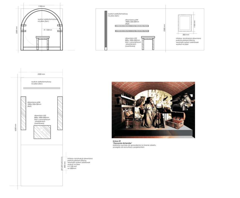 1100mm drewniane półki 1800x 350x 80mm (4szt) R 1100mm 2500 mm 2500 mm wydruk wielkoformatowy na plexi (3szt.) 1100 mm wydruk wielkoformatowy na plexi (3szt.) 800 mm drewniany stół 800x 1000x 800mm blat z wewnętrznym oświetleniem (swietlówka) 2500 mm wydruk wielkoformatowy na plexi (3szt.) drewniany stół 800x 1000x 800mm blat z wewnętrznym oświetleniem (swietlówka) Schron 29 “Pracownia Alchemika” dokladne wymiary do sprawdzenia na terenie obiektu szczegóły do konsultacji z projektantem 800 mm 6500 mm drewniane półki 1800x 350x 80mm (4szt) infobox- konstrukcja drewniana pokryta płatami blachy wewnątrz system swietlówek wydruk na plexi h=1100 mm w= 800mm infobox- konstrukcja drewniana pokryta płatami blachy wewnątrz system swietlówek wydruk na plexi