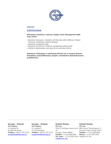 USŁUGI SZKOLENIA Oferujemy szkolenia z zakresu Supply Chain Management (JDA Scpo suite): ● ● ● ● Szkolenia funkcyjne z modułów: JDA Demand, JDA Fulfillment, Master Planning, Collaborate i Market Manager Szkolenia nawigacyjne JDA Szkolenia techniczne: instalacja, konfiguracja aplikacji JDA Szkolenia dedykowane, pod specyficzne potrzeby klienta Szkolenia realizujemy w lokalizacji klienta lub w naszych biurach Posiadamy wykwalifikowany zespół z wieloletnim doświadczeniem projektowym. Europe - Poland Europe - Poland United States United States CFT Polska ul. Ryżowa 49 02-495 Warszawa Telefon: +48 22 379 75 00 [email protected] CFT Polska Ul. Andersa 5 15-124 Białystok Telefon: +48 22 379 75 00 [email protected] CFT Inc. 1556 S. Michigan Avenue Unit 3A Chicago, Illinois 60605 Telefon: +1.312.588.0006 Tel. kom.: +1.312.420.1016 [email protected] CFT Inc. 6820 Lyons Technologies Cir Coconut Creek, Florida 33073 Telefon: +1.312.588.0006 Phone: +1.312.420.1016 [email protected]