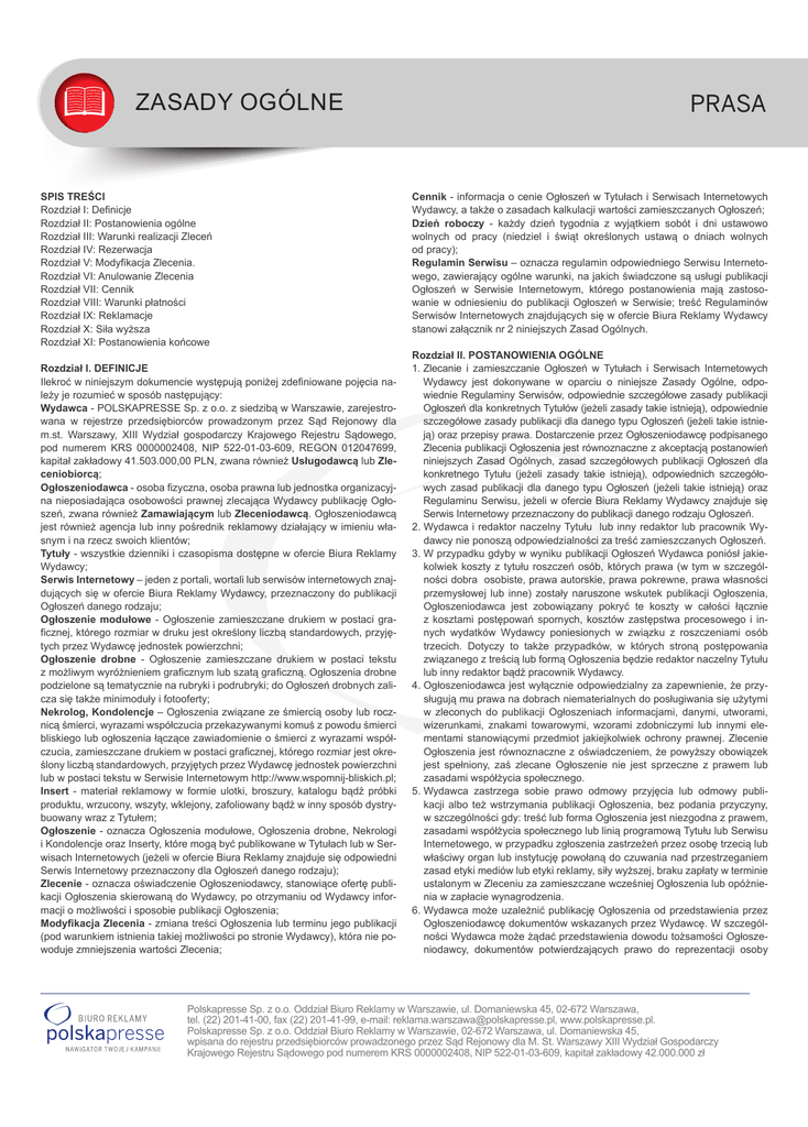 ZASADY OGÓLNE Wymagania techniczne SPIS TREŚCI Rozdział I: Definicje Rozdział II: Postanowienia ogólne Rozdział III: Warunki realizacji Zleceń Rozdział IV: Rezerwacja Rozdział V: Modyfikacja Zlecenia. Rozdział VI: Anulowanie Zlecenia Rozdział VII: Cennik Rozdział VIII: Warunki płatności Rozdział IX: Reklamacje Rozdział X: Siła wyższa Rozdział XI: Postanowienia końcowe Rozdział I. DEFINICJE Ilekroć w niniejszym dokumencie występują poniżej zdefiniowane pojęcia należy je rozumieć w sposób następujący: Wydawca - POLSKAPRESSE Sp. z o.o. z siedzibą w Warszawie, zarejestrowana w rejestrze przedsiębiorców prowadzonym przez Sąd Rejonowy dla m.st. Warszawy, XIII Wydział gospodarczy Krajowego Rejestru Sądowego, pod numerem KRS 0000002408, NIP 522-01-03-609, REGON 012047699, kapitał zakładowy 41.503.000,00 PLN, zwana również Usługodawcą lub Zleceniobiorcą; Ogłoszeniodawca - osoba fizyczna, osoba prawna lub jednostka organizacyjna nieposiadająca osobowości prawnej zlecająca Wydawcy publikację Ogłoszeń, zwana również Zamawiającym lub Zleceniodawcą. Ogłoszeniodawcą jest również agencja lub inny pośrednik reklamowy działający w imieniu własnym i na rzecz swoich klientów; Tytuły - wszystkie dzienniki i czasopisma dostępne w ofercie Biura Reklamy Wydawcy; Serwis Internetowy – jeden z portali, wortali lub serwisów internetowych znajdujących się w ofercie Biura Reklamy Wydawcy, przeznaczony do publikacji Ogłoszeń danego rodzaju; Ogłoszenie modułowe - Ogłoszenie zamieszczane drukiem w postaci graficznej, którego rozmiar w druku jest określony liczbą standardowych, przyjętych przez Wydawcę jednostek powierzchni; Ogłoszenie drobne - Ogłoszenie zamieszczane drukiem w postaci tekstu z możliwym wyróżnieniem graficznym lub szatą graficzną. Ogłoszenia drobne podzielone są tematycznie na rubryki i podrubryki; do Ogłoszeń drobnych zalicza się także minimoduły i fotooferty; Nekrolog, Kondolencje – Ogłoszenia związane ze śmiercią osoby lub rocznicą śmierci, wyrazami współczucia przekazywanymi komuś z powodu śmierci bliskiego lub ogłoszenia łączące zawiadomienie o śmierci z wyrazami współczucia, zamieszczane drukiem w postaci graficznej, którego rozmiar jest określony liczbą standardowych, przyjętych przez Wydawcę jednostek powierzchni lub w postaci tekstu w Serwisie Internetowym http://www.wspomnij-bliskich.pl; Insert - materiał reklamowy w formie ulotki, broszury, katalogu bądź próbki produktu, wrzucony, wszyty, wklejony, zafoliowany bądź w inny sposób dystrybuowany wraz z Tytułem; Ogłoszenie - oznacza Ogłoszenia modułowe, Ogłoszenia drobne, Nekrologi i Kondolencje oraz Inserty, które mogą być publikowane w Tytułach lub w Serwisach Internetowych (jeżeli w ofercie Biura Reklamy znajduje się odpowiedni Serwis Internetowy przeznaczony dla Ogłoszeń danego rodzaju); Zlecenie - oznacza oświadczenie Ogłoszeniodawcy, stanowiące ofertę publikacji Ogłoszenia skierowaną do Wydawcy, po otrzymaniu od Wydawcy informacji o możliwości i sposobie publikacji Ogłoszenia; Modyfikacja Zlecenia - zmiana treści Ogłoszenia lub terminu jego publikacji (pod warunkiem istnienia takiej możliwości po stronie Wydawcy), która nie powoduje zmniejszenia wartości Zlecenia; PRASA Cennik - informacja o cenie Ogłoszeń w Tytułach i Serwisach Internetowych Wydawcy, a także o zasadach kalkulacji wartości zamieszczanych Ogłoszeń; Dzień roboczy - każdy dzień tygodnia z wyjątkiem sobót i dni ustawowo wolnych od pracy (niedziel i świąt określonych ustawą o dniach wolnych od pracy); Regulamin Serwisu – oznacza regulamin odpowiedniego Serwisu Internetowego, zawierający ogólne warunki, na jakich świadczone są usługi publikacji Ogłoszeń w Serwisie Internetowym, którego postanowienia mają zastosowanie w odniesieniu do publikacji Ogłoszeń w Serwisie; treść Regulaminów Serwisów Internetowych znajdujących się w ofercie Biura Reklamy Wydawcy stanowi załącznik nr 2 niniejszych Zasad Ogólnych. Rozdział II. POSTANOWIENIA OGÓLNE 1. Z lecanie i zamieszczanie Ogłoszeń w Tytułach i Serwisach Internetowych Wydawcy jest dokonywane w oparciu o niniejsze Zasady Ogólne, odpowiednie Regulaminy Serwisów, odpowiednie szczegółowe zasady publikacji Ogłoszeń dla konkretnych Tytułów (jeżeli zasady takie istnieją), odpowiednie szczegółowe zasady publikacji dla danego typu Ogłoszeń (jeżeli takie istnieją) oraz przepisy prawa. Dostarczenie przez Ogłoszeniodawcę podpisanego Zlecenia publikacji Ogłoszenia jest równoznaczne z akceptacją postanowień niniejszych Zasad Ogólnych, zasad szczegółowych publikacji Ogłoszeń dla konkretnego Tytułu (jeżeli zasady takie istnieją), odpowiednich szczegółowych zasad publikacji dla danego typu Ogłoszeń (jeżeli takie istnieją) oraz Regulaminu Serwisu, jeżeli w ofercie Biura Reklamy Wydawcy znajduje się Serwis Internetowy przeznaczony do publikacji danego rodzaju Ogłoszeń. 2. Wydawca i redaktor naczelny Tytułu lub inny redaktor lub pracownik Wydawcy nie ponoszą odpowiedzialności za treść zamieszczanych Ogłoszeń. 3. W przypadku gdyby w wyniku publikacji Ogłoszeń Wydawca poniósł jakiekolwiek koszty z tytułu roszczeń osób, których prawa (w tym w szczególności dobra osobiste, prawa autorskie, prawa pokrewne, prawa własności przemysłowej lub inne) zostały naruszone wskutek publikacji Ogłoszenia, Ogłoszeniodawca jest zobowiązany pokryć te koszty w całości łącznie z kosztami postępowań spornych, kosztów zastępstwa procesowego i innych wydatków Wydawcy poniesionych w związku z roszczeniami osób trzecich. Dotyczy to także przypadków, w których stroną postępowania związanego z treścią lub formą Ogłoszenia będzie redaktor naczelny Tytułu lub inny redaktor bądź pracownik Wydawcy. 4. Ogłoszeniodawca jest wyłącznie odpowiedzialny za zapewnienie, że przysługują mu prawa na dobrach niemate