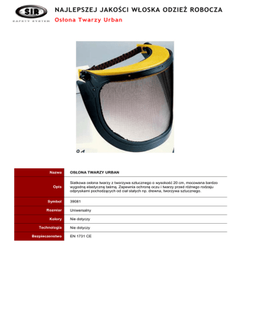 NAJLEPSZEJ JAKOŚCI WŁOSKA ODZIEŻ ROBOCZA Osłona Twarzy Urban 000,00 zł Nazwa Opis Symbol OSŁONA TWARZY URBAN Siatkowa osłona twarzy z tworzywa sztucznego o wysokość 20 cm, mocowana bardzo wygodną elastyczną taśmą. Zapewnia ochronę oczu i twarzy przed różnego rodzaju odpryskami pochodzących od ciał stałych np. drewna, tworzywa sztucznego. 39081 Rozmiar Uniwersalny Kolory Nie dotyczy Technologia Nie dotyczy Bezpieczenstwo EN 1731 CE