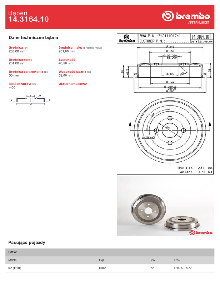 Bęben 14.3164.10 Dane techniczne bębna Średnica (Ø) 230,00 mm Średnica maks (Średnica maks) 231,00 mm Średnica maks 231,00 mm Szerokość 46,50 mm Średnica centrowania (B) 58 mm Wysokość łączna (C) 59,00 mm Ilość otworów (D) 4,00 Układ hamulcowy Pasujące pojazdy BMW Model Typ kW Rok 02 (E10) 1502 55 01/75 07/77 02 (E10) 1600 Ti 77 09/67 11/69 02 (E10) 1802 66 05/71 07/75 02 (E10) 2002 74 02/68 07/75 02 (E10) 2002 Ti 88 06/68 04/72 02 (E10) 2002 Tii 96 05/71 07/75 02 Convertible (E10) 1600-2 63 12/67 10/71 02 Convertible (E10) 2002 74 05/71 07/75 02 Touring (E6) 1802 66 05/71 07/75 02 Touring (E6) 2002 74 05/71 07/75 02 Touring (E6) 2002 Tii 96 01/71 07/75 1500-2000 (115, 116, 118, 121) 2000 Ti / Tilux 88 01/66 07/72 1500-2000 (115, 116, 118, 121) 2000 Tii 96 12/69 07/72 Numery OE Pasujące kody OE BMW 34211101741