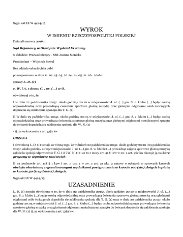 Sygn. akt IX W 4424/15 WYROK W IMIENIU RZECZYPOSPOLITEJ POLSKIEJ Dnia 28 czerwca 2016 r. Sąd Rejonowy w Olsztynie Wydział IX Karny w składzie: Przewodniczący - SSR Joanna Sienicka Protokolant – Wojciech Sowul Bez udziału oskarżyciela publ. po rozpoznaniu w dniu 11. 02, 15. 03, 26 .04, 24.05, 21 .06 . 2016 r. sprawy L. D. (1) c. W. i A. z domu C. , ur. (...) w O. obwinionej o to, że: I w dniu 22 października 2015r. około godziny 20:10 w miejscowości J. ul. (...) gm. S. z klubu (...) będąc osobą odpowiedzialną oraz prowadzącą ćwiczenia sportowe głośną muzyką oraz głośnymi odgłosami osób ćwiczących dopuściła się zakłócenia spokoju dla T. G. (1); II W dniu 29 października 2015r. około godziny 20:05 w miejscowości J. ul. (...) gm. S. z klubu (...) będąc osobą odpowiedzialną oraz prowadząca ćwiczenia sportowe głośną muzyką oraz głośnymi odgłosami metalicznymi sprzętu do ćwiczeń dopuściła się zakłócenia spokoju dla W. N. (1) - tj. za wykroczenie z art. 51§1 kw ORZEKA I obwinioną L. D. (1) uznaje za winną tego, że w dniach 22 października 2015r. około godziny 20:10 i 29 października 2015r. około godziny 20:05 w miejscowości J. ul. (...) gm. S. w klubie (...) prowadząc zajęcia sportowe głośną muzyką zakłóciła spokój odpowiednio T. G. (1) i W. N. (1) i za to z mocy art. 51 § 1kw w zw. z art. 9§2 kw skazuje ją na karę grzywny w wymiarze 100(sto)zł ; II na podstawie art. 118 § 1 kpw i art. 3 ust. 1 w zw. z art. 21 pkt. 2 ustawy o opłatach w sprawach karnych obciąża obwinioną zryczałtowanymi wydatkami postępowania w kwocie 100 (sto) złotych i opłatą w kwocie 30 (trzydzieści) złotych. Sygn akt IX W 4424/15 UZASADNIENIE L. D. (1) została obwiniona o to, że w dniu 22 października 2015r. około godziny 20:10 w miejscowości J. ul. (...) gm. S. z klubu (...) będąc osobą odpowiedzialną oraz prowadzącą ćwiczenia sportowe głośną muzyką oraz głośnymi odgłosami osób ćwiczących dopuściła się zakłócenia spokoju dla T. G. (1) oraz w dniu 29 października 2015r. około godziny 20:05 w miejscowości J. ul. (...) gm. S. z klubu (...) będąc osobą odpowiedzialną oraz prowadząca ćwiczenia sportowe głośną muzyką oraz głośnymi odgłosami metalicznymi sprzętu do ćwiczeń dopuściła się zakłócenia spokoju dla W. N. (1) tj. za wykroczenia z art. 51§1 kw. Obwiniona mieszka w O., jest panną, nie ma nikogo na swoim utrzymaniu, pracuje w spółce (...) osiągając miesięczny dochód około(...) złotych. Według oświadczenia w przeszłości nie była karana za wykroczenia. W O. przy ul. (...) na (...) budynku wielorodzinnego znajduje się lokal usługowy o powierzchni około 180 m( 2). Bezpośrednio nad lokalem znajdują się trzy lokale mieszkalne zajmowane przez T. G. (1), W. i K. N. (1) oraz S. M. (1) wraz z rodziną. Od marca 2015 r. w w/w lokalu usługowym prowadzenie działalności- siłowni oraz klubu (...) (...), rozpoczął B. O. (1). Obwiniona zatrudniona jest w tym klubie jako (...), prowadziła zajęcia (...). W klubie do ćwiczeń wykorzystywano sztangi, ciężarki, bieżnie. W czasie zajęć włączana była muzyka. Z uwagi na skargi mieszkańców bloku skierowanie bezpośrednio do najemców lokalu oraz do Wspólnoty Mieszkaniowej, sufit lokalu został wyciszony poprzez wyklejenie go (...). Ponadto we wrześniu 2015 r. właściciel (...) B. O. (1) z lokalu wywiózł sztangi, hantle oraz inne ciężkie przyrządy do ćwiczeń. W dniu 22.10.2015 r. zajęcia w klubie prowadziła obwiniona, były to zajęcia przy muzyce, która odtwarzana była z głośników umieszczonych przy suficie pomieszczenia. Dźwięki pochodzące z siłowni w postaci m.in. odgłosów muzyki , stuków dochodziły do mieszkania pokrzywdzonej T. G. (1). Około godz. 20:10 pokrzywdzona powiadomiła policję zgłaszając zakłócenie spokoju. Przybyli na miejsce funkcjonariusze S. M. (2) i J. L. na klatce schodowej zastali kilkoro mieszkańców bloku, który zgłaszali , iż z pomieszczenia na (...) budynku dochodzą odgłosy muzyki, śmiechy osób uczestniczących w zajęciach, odgłosy prowadzonych ćwiczeń, stuki. Mieszkańcy skarżyli się, iż odgłosy dochodzące z w/w lokalu zakłócają im spokój. Policjanci po rozmowie z mieszkańcami udali się do (...) . W czasie interwencji nie były już prowadzone zajęcia i z siłowni nie dochodziły żadne odgłosy. Obwiniona wraz z inną osoba sprzątała już pomieszczenie po zajęciach. W dniu 29.10.2015 r. około godz. 20:05 obwiniona ponownie prowadziła zajęcia w klubie. Odgłosy towarzyszące treningowi oraz muzyka odtwarzana podczas ćwiczeń dochodziła do mieszkań umieszczonych na piętrze. Pokrzywdzona W. N. (1) zawiadomiła policję o zakłócaniu spokoju. Funkcjonariusze R. K. (1) i D. J. po przybyciu na miejsce rozmawiali z mieszkańcami lokali znajdujących się nad siłownią. Mieszkańcy zgłaszali, iż podczas zajęć prowadzonych w lokalu dochodzą do ich mieszkań odgłosy osób tam ćwiczących, odgłosy używanego sprzętu oraz głośna muzyka. Funkcjonariusze udali się do klubu (...), gdzie zajęcia prowadziła obwiniona. L. D. przyznała, że podczas zajęć odtwarzana jest muzyka, a na sali ćwiczy około 15 osób. W czasie interwencji w lokalu nie było już osób ćwiczących, muzyka była wyłączona z uwagi na zakończenie treningu. (dowody: notatka urzędowa k. 1, k. 2, zdjęcie przedstawiające plan treningów k. 36, k. 59-63, dokumentacja Wspólnoty Mieszkaniowej związana z działalnością Klubu (...) k. 42-55, informacja o mieszkańcach k. 72, zdjęcia przedstawiające osoby ćwiczące k. 86-87, zeznania S. M. k. 38, zeznania J. L. k. 38, zeznania R. K. k. 38-38v., zeznania W. N. k. 13, k. 38v.-39, zeznania T. G. k. 16, k. 39, zeznania B. O. k. 64-65v., zeznania K. N. k. 65v.-66, zeznania M. N. k. 66, zeznania S. M. k. 88-89) Obwiniona L. D. (1) nie przyznała się do popełnienia zarzucanego jej wykroczenia. Wyjaśniła