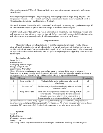 Maksymalna mana to 3*Umysł. (Startowy limit many powinien wynosić parenaście. Maksymalny paredziesiąt.) Mana regeneruje się w tempie 1 na godzinę przy pierwszym poziomie magii. Przy drugim – 1 na pół godziny. Trzecim – 1 na 15 minut. Czwarty to zmniejszenie kosztu many wszystkich spelli o 1 (Ewentualnie odnawianie 1 punktu many co 5 minut). Idea spelli jest taka, żeby miały wiele zastosowań, wiele opcji i skalowały się z poziomem maga. W ten sposób ten sam spell w rękach doświadczonego kolesia będzie mocniejszy. Warto by ustalić, jaki "demejdż" odpowiada jakim atakom fizycznym, oraz ile many powinien taki atak kosztować w tradycji agresywnej i w tradycji defensywnej. Jeśli uznamy, że k8 to już poważny atak mieczem, to w agresywnej tradycji, taki atak powinien kosztować ok. 2 many. -= Spelle wody =Magowie wody są o wiele potężniejsi w pobliżu przedmiotu ich magii – wody. Dlatego wiele ich spelli jest tańszych, niż ich odpowiedniki w innych aspektach, ale działają jedynie, gdy w pobliżu znajduje się woda (a w przypadku silniejszych zaklęć, bardzo dużo wody). Aby ci magowie nie byli całkowicie zdani na otoczenie, inne zaklęcia tworzą lub sprowadzają wodę, która może być potem użyta. Lewitacja wody Koszt: 1 - 3 Trudność testu: Wymagany poziom magii: 1 Zasięg: Umysł * 4 m Czas trwania: Umysł tur Efekt: W trakcie trwania czaru, mag manipuluje wodą w zasięgu, która może lewitować i formować się w różne kształty wedle jego woli. Wreszcie, może być użyta jako pocisk wysłany w stronę przeciwnika. Objętość wody i efekty trafień zależą od wydanej ilości many: Koszt Objętość Efekt Obrażenia 1 Duża butelka ~3l Trafienie kulą wody, traktowaną jako pocisk obuchowy k4 2 Beczka ~1m3 Woda formuje się w kształt długiej włóczni, zadając obrażenia kłute k8 3 Mały basen ~5m3 Taka ilość wody pozwala zabrać duże rzeczy, w tym 2k6 osoby ze sobą i przenieść je na dystans działania zaklęcia. Mag może uderzyć tym strumieniem o ścianę, zadając wszystkim podróżującym obrażenia. Obrażenia zadawane przez daną objętość wody, która nie podpada dokładnie pod przedział w tabeli powinny zostać przybliżone przez MG. Przykładowo: 0.6 m3 jest pomiędzy pierwszą a drugą wartością. MG może stwierdzić, że obrażenia zadawane przez taką masę wynoszą k6. Hydrant Koszt: 3 Trudność testu: Wymagany poziom magii: 1 Zasięg: 12 m Efekt: Mag strzela z rękawów strumieniem wody pod ciśnieniem. Trafiony cel otrzymuje k6 obrażeń obuchowych i musi wykonać test Siła + Budowa przeciw ilości sukcesów osiągniętych przez maga przy rzucaniu zaklęcia. Porażka oznacza, że jest odrzucony do tyłu o Umysł metrów i przewrócony. Zaklęcie tworzy 2m3 wody, która rozpryskuje się po okolicy. Sprowadzenie deszczu Koszt: 8 + / Trudność testu: Wymagany poziom magii: 2 Zasięg: Umysł km Efekt: Zaklęcie gromadzi chmury, z których po 6 godzinach zaczyna padać deszcz, który ustaje po kolejnej godzinie. To zaklęcie może być użyte ponownie po 12 godzinach na danym obszarze. Zależnie od aktualnego stanu pogody oraz pożądanych efektów, koszt oraz czas oczekiwania na efekt może zostać zmieniony: Aktualny stan pogody Zmiana Modyfikacja Zmiana Częściowe zachmurzenie -2 godziny -1 koszt Mżawka zamiast deszczu -3 koszt Znaczne zachmurzenie -4 godziny -2 koszt Burza z piorunami +3 koszt Czarne Chmury -6 godzin -2 godziny +2 koszt -4 koszt (Tak, w tej sytuacji sprowadzenie deszczu jest natychmiastowe i bardzo łatwe) Naturalnie nie każdy stan pogody podpada dokładnie pod dany przedział w tabeli. MG powinien przybliżyć go do najbliższej wartości. Przykład: Jedna chmurka nadal powinna być uznawana za czyste niebo. Ochrona przed deszczem Koszt: 1 - 4 Trudność testu: Wymagany poziom magii: 1 Zasięg: Dotyk Czas trwania: Umysł godzin Efekt: W takcie trwania zaklęcia, osoba lub przedmiot są otoczone magiczną barierą, chroniącą przed wszelkimi opadami. Cel pozostanie suchy nawet w największą nawałnicę. Za zwiększenie kosztu o 3, zaklęcie może również chronić budynek przed zmoknięciem, co może być przydatne w pewnych sytuacjach. MG może uznać, że wyjątkowo duże budowle, jak wille, czy zamki potrzebują jeszcze większego kosztu many bądź są poza zasięgiem działania tego zaklęcia. Ożywienie wody Koszt: 3 - 24 Trudność testu: Wymagany poziom magii: 1 Zasięg: Dotyk Czas trwania: Umysł godzin Efekt: Zaklęcie tworzy kulę stanowiącą świadomość nowego stworzenia. Kula musi zostać stworzona w wodzie, która stanowi ciało stworka. Jego płynne ciało może zmieniać kształt, choć ten domyślny może być zdefiniowany przez maga (lub MG, jeśli ten pierwszy nie ma pomysłu). Jedyny element, który jest podatny na obrażenia, to wspomniana kula. Przy większych stworach dostanie się do niej samo w sobie stanowi wyzwanie. Mag może telepatycznie komunikować się ze swoim sługą. Czas trwania może być odnowiony, płacąc odpowiadający koszt. Objętość definiuje statystyki i koszt zaklęcia: Koszt Rozmiar Opis Statystyki 3 Duża butelka ~3l Tak mały stworek posiada inteligencję nastolatka. Jego osobowość i wydawane dźwięki przypominają kota. Po 1 5 Beczka ~1m3 Istota tej wielkośći może stanowić znaczącą pomoc w walce. Jego umysł odpowiada mentalności dorosłego człowieka. Po 3 12 Mały basen ~5m3 Stwory tej wielkości mogą solować kilkuosobowe oddziały. Po 6 24 Jezioro ~500m3 O takich potworach krążą legendy. Mimo, że ich kula świadomości ma 2 metry średnicy, trudno się do niej dostać, co czyni je praktycznie niezniszczalnymi. Po 12 Lolololol Chodzenie po wodzie Koszt: Trudność testu: Wymagany poziom magii: Zasięg: Czas trwania: Efekt: Tsunami Koszt: 20 - 40 Trudność testu: Wymagany poziom magii: 3 Zasięg: 1 km Efekt: Mag przywołuje ogromną falę, zalewającą brzeg i wdzierającą się daleko w ląd. Każda osoba trafiona p