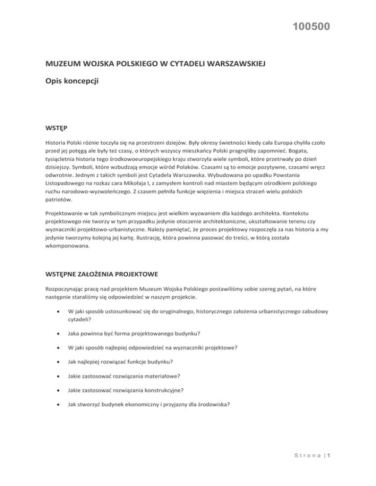 100500 MUZEUM WOJSKA POLSKIEGO W CYTADELI WARSZAWSKIEJ Opis koncepcji WSTĘP Historia Polski różnie toczyła się na przestrzeni dziejów. Były okresy świetności kiedy cała Europa chyliła czoło przed jej potęgą ale były też czasy, o których wszyscy mieszkańcy Polski pragnęliby zapomnieć. Bogata, tysiącletnia historia tego środkowoeuropejskiego kraju stworzyła wiele symboli, które przetrwały po dzień dzisiejszy. Symboli, które wzbudzają emocje wśród Polaków. Czasami są to emocje pozytywne, czasami wręcz odwrotnie. Jednym z takich symboli jest Cytadela Warszawska. Wybudowana po upadku Powstania Listopadowego na rozkaz cara Mikołaja I, z zamysłem kontroli nad miastem będącym ośrodkiem polskiego ruchu narodowo‐wyzwoleńczego. Z czasem pełniła funkcje więzienia i miejsca straceń wielu polskich patriotów. Projektowanie w tak symbolicznym miejscu jest wielkim wyzwaniem dla każdego architekta. Kontekstu projektowego nie tworzy w tym przypadku jedynie otoczenie architektoniczne, ukształtowanie terenu czy wyznaczniki projektowo‐urbanistyczne. Należy pamiętać, że proces projektowy rozpoczęła za nas historia a my jedynie tworzymy kolejną jej kartę. Ilustrację, która powinna pasować do treści, w którą została wkomponowana. WSTĘPNE ZAŁOŻENIA PROJEKTOWE Rozpoczynając pracę nad projektem Muzeum Wojska Polskiego postawiliśmy sobie szereg pytań, na które następnie staraliśmy się odpowiedzieć w naszym projekcie. W jaki sposób ustosunkować się do oryginalnego, historycznego założenia urbanistycznego zabudowy cytadeli? Jaka powinna być forma projektowanego budynku? W jaki sposób najlepiej odpowiedzieć na wyznaczniki projektowe? Jak najlepiej rozwiązać funkcje budynku? Jakie zastosować rozwiązania materiałowe? Jakie zastosować rozwiązania konstrukcyjne? Jak stworzyć budynek ekonomiczny i przyjazny dla środowiska? Strona |1 100500 KONCEPCJA ZAGOSPODAROWANIA TERENU Projektowane założenie muzealne swym układem nawiązuje do historycznego zespołu koszarowego zlokalizowanego na terenie cytadeli. Cytadela Warszawska rok 1921 Budynek Muzeum Główny budynek muzeum zaprojektowany został w miejscu gdzie kiedyś znajdował się gmach Pawilonów III – IX. Wejście do kompleksu usytuowane jest na osi przebiegającej od Bramy Straceń przez środek dawnego Placu Gwardii i dalej przez nowoprojektowaną kładkę pieszą pomiędzy bastionami II i III, wzdłuż Alei Wojska Polskiego aż do Placu Inwalidów – jednego z głównych węzłów komunikacyjnych w okolicy cytadeli. Plac Wejściowy Przedpolem dla budynku jest rozległy plac, (dawny Plac Gwardii) na którym przecinają się kierunki ciągów pieszych łączących dojścia do parkingu podziemnego, zewnętrzne ekspozycje oraz parking dla autokarów. Północną i południową pierzeję placu tworzą zadaszone ekspozycje zewnętrzne, zaprojektowane w miejscu gdzie dawniej znajdowały się koszarowe Pawilony I i II. Centralna część placu, posiadająca twardą nawierzchnię, zaprojektowana została jako miejsce gdzie mogą odbywać się okolicznościowe imprezy zewnętrzne. Plac, wyznaczający poziom porównawczy ±0.00 (Rzędna +22.00) oddziela od głównego budynku muzeum Ulica Gwardii. Została ona obniżona na szerokości placu do poziomu ‐2.5 aby podkreślić główne wejście do muzeum. Zwiedzający z placu wchodzą do budynku pokonując ciąg schodów przewieszonych nad Ulicą Gwardii. Nadaje to głównemu wejściu doniosły, odpowiedni dla Muzeum Wojska Polskiego charakter. Przy schodach zaprojektowana została rampa wkomponowana w teren, nawiązująca swym kształtem do charakteru placu. Parkingi Pod placem muzealnym usytuowany został parking podziemny na 515 stanowisk dla zwiedzających oraz dla pracowników muzeum. Dodatkowy parking dla autokarów znajduje się po północnej stronie placu. Dojście z parkingu dla autokarów do muzeum prowadzi poprzez rozcięcie w bryle ekspozycji zewnętrznej. Rozcięcie to zapewnia otwarcie widokowe na wejście główne do budynku muzeum. Z parkingu podziemnego prowadzą dwa wyjścia wyposażone w zadaszone schody ruchome oraz windy. Ich lokalizacja podkreślona została przez Strona |2 100500 zaprojektowaną na poziomie parkingu zieleń, stanowiącą wizualny łącznik z placem. Wyjścia zostały ukierunkowane na wejście główne do budynku muzeum oraz na południowy pawilon ekspozycji zewnętrznej. Dojazdy Główny wjazd do kompleksu Muzeum Wojska Polskiego zaprojektowany został z zachodniej nitki Wisłostrady. Portal wjazdowy tworzy tunel w skarpie cytadeli po północnej stronie Bramy Bielańskiej nawiązujący swą formą do architektury nowego gmachu muzeum. Istniejący wjazd przez Bramę Bielańską został utrzymany jako dodatkowy wjazd dla samochodów obsługi muzeum. Ciągi pieszo‐rowerowe Ponadto na teren muzeum prowadzi kilka ciągów pieszo‐rowerowych. Dominujący wśród nich jest wspomniany wcześniej ciąg znajdujący się na osi wejścia głównego do muzeum, prowadzący z Placu Inwalidów poprzez nowoprojektowaną kładkę pomiędzy bastionami II i III. Piesi nadchodzący od południa od strony Starego Miasta mogą wykorzystać wejście poprzez istniejącą Kaponierę Południową. Stamtąd kierując się ciągiem pieszym wzdłuż wschodniej części murów dochodzą do umieszczonego na osi Bramy Straceń wejścia na dolny poziom holu muzealnego. Muszla koncertowa Na południe od głównego budynku muzeum w otoczeniu zieleni zaprojektowany został zewnętrzny amfiteatr, „muszla koncertowa” wraz z wkomponowanymi w teren miejscami do siedzenia. Otoczenie „muszli koncertowej” przewidziane zostało na park, gdzie istniejąca obecnie zieleń została uzupełniona nowo projektowaną, tworząc relaksacyjną przestrzeń z miejscami zabaw dla dzieci. Zatopione w zieleni place mogą zostać użyte na organizowane wszelkiego rodzaju imprez i spotkań. Na terenie parku, na zamknięciu ulicy Levittoux biegn