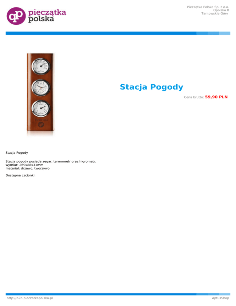 Pieczątka Polska Sp. z o.o. Opolska 8 Tarnowskie Góry Stacja Pogody Cena brutto: 59,90 PLN Stacja Pogody Stacja pogody posiada zegar, termometr oraz higrometr. wymiar: 269x88x31mm materiał: drzewo, tworzywo Dostępne czcionki: http://b2b.pieczatkapolska.pl AptusShop