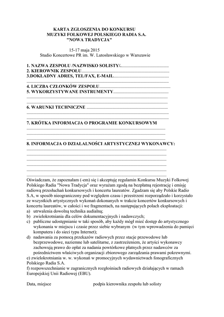 KARTA ZGŁOSZENIA DO KONKURSU MUZYKI FOLKOWEJ POLSKIEGO RADIA S.A. "NOWA TRADYCJA" 15-17 maja 2015 Studio Koncertowe PR im. W. Lutosławskiego w Warszawie 1. NAZWA ZESPOŁU /NAZWISKO SOLISTY/........................................... 2. KIEROWNIK ZESPOŁU.............................................................................. 3.DOKŁADNY ADRES, TEL/FAX, E-MAIL................................................. .............................................................................................................................. 4. LICZBA CZŁONKÓW ZESPOŁU............................................................... 5. WYKORZYSTYWANE INSTRUMENTY................................................. ............................................................................................................................. ............................................................................................................................. 6. WARUNKI TECHNICZNE ........................................................................ .............................................................................................................................. .............................................................................................................................. 7. KRÓTKA INFORMACJA O PROGRAMIE KONKURSOWYM ........................................................................................................................... ........................................................................................................................... ........................................................................................................................... 8. INFORMACJA O DZIAŁALNOŚCI ARTYSTYCZNEJ WYKONAWCY: ............................................................................................................................ ............................................................................................................................ ............................................................................................................................ ............................................................................................................................ ............................................................................................................................ ............................................................................................................................ Oświadczam, że zapoznałam (-em) się i akceptuję regulamin Konkursu Muzyki Folkowej Polskiego Radia "Nowa Tradycja" oraz wyrażam zgodą na bezpłatną rejestrację i emisję radiową przesłuchań konkursowych i koncertu laureatów. Zgadzam się aby Polskie Radio S.A, w sposób nieograniczony pod względem czasu i przestrzeni rozporządzało i korzystało ze wszystkich artystycznych wykonań dokonanych w trakcie koncertów konkursowych i koncertu laureatów, w całości i we fragmentach, na następujących polach eksploatacji: a) utrwalenia dowolną technika audialną; b) zwielokrotniania dla celów dokumentacyjnych i nadawczych; c) publiczne udostępnianie w taki sposób, aby każdy mógł mieć dostęp do artystycznego wykonania w miejscu i czasie przez siebie wybranym (w tym wprowadzenia do pamięci komputera i do sieci typu Internet); d) nadawania za pomocą przekazów radiowych przez stacje przewodowe lub bezprzewodowe, naziemne lub satelitarne, z zastrzeżeniem, że artyści wykonawcy zachowują prawo do opłat za nadania powtórkowe płatnych przez nadawców za pośrednictwem właściwych organizacji zbiorowego zarządzania prawami pokrewnymi. e) zwielokrotniania w. w. wykonań w promocyjnych wydawnictwach fonograficznych Polskiego Radia S.A. f) rozpowszechnianie w zagranicznych rozgłośniach radiowych działających w ramach Europejskiej Unii Radiowej (EBU). Data, miejsce podpis kierownika zespołu lub solisty