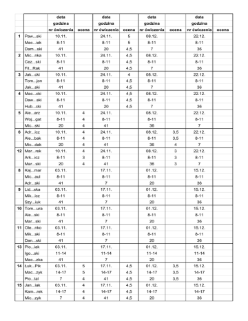 data data data data godzina godzina godzina godzina nr ćwiczenia 1 ocena nr ćwiczenia ocena nr ćwiczenia ocena nr ćwiczenia Paw...ski 10.11. 24.11. 5 08.12. 22.12. Mac...iak 8-11 8-11 5 8-11 8-11 Dam...ski 41 20 4,5 7 36 Mic...nka 10.11. 24.11. 4,5 08.12. 22.12. Cez...ski 8-11 8-11 4,5 8-11 8-11 Fil...Rak 41 20 4,5 7 36 Jak...cki 10.11. 24.11. 4 08.12. 22.12. Tom...jon 8-11 8-11 4,5 8-11 8-11 Jak...ski 41 20 4,5 7 36 Mac...cki 10.11. 24.11. 4,5 08.12. 22.12. Daw...ski 8-11 8-11 4,5 8-11 8-11 Hub...cki 41 20 4,5 7 36 Ale...arz 10.11. 4 24.11. 08.12. 22.12. Woj...gat 8-11 4 8-11 8-11 8-11 Mic...ski 20 4 41 36 7 Adr...icz 10.11. 4 24.11. 08.12. 3,5 22.12. Ale...bak 8-11 4 8-11 8-11 3,5 8-11 Mic...dak 20 4 41 36 4 7 10.11. 4 24.11. 08.12. 3 22.12. Ark...icz 8-11 3 8-11 8-11 3 8-11 Mar...ski 20 4 41 36 3 7 Kaj...mar 03.11. 17.11. 01.12. 15.12. Mic...aul 8-11 8-11 8-11 8-11 Adr...ski 41 7 20 36 Lid...ska 03.11. 17.11. 01.12. 15.12. Mik...icz 8-11 8-11 8-11 8-11 Szy...iuk 41 7 20 36 03.11. 17.11. 01.12. 15.12. Ale...ski 8-11 8-11 8-11 8-11 Mar...ski 41 7 20 36 03.11. 17.11. 01.12. 15.12. Mik...ski 8-11 8-11 8-11 8-11 Dan...ski 41 7 20 36 13 Pio...iak 03.11. 17.11. 01.12. 15.12. Igo...ski 11-14 11-14 11-14 11-14 41 7 20 36 2 3 4 5 6 12 Mar...rek 8 9 10 Tom...ura 11 Ole...nko Mac...zka 14 Łuk...Pik 03.11. 5 17.11. 4,5 01.12. 3,5 15.12. 14-17 5 14-17 4,5 14-17 3,5 14-17 7 4 41 4,5 20 3,5 36 03.11. 4 17.11. 4,5 01.12. 15.12. Kam...rek 14-17 4 14-17 4,5 14-17 14-17 Mic...zyk 7 4 41 4,5 20 36 Mac...zyk Pio...tal 15 Jan...iak ocena 16 Grz...zuk 03.11. 4,5 17.11. 5 01.12. 15.12. Prz...zek 14-17 4,5 14-17 4,5 14-17 14-17 Aga...icz 7 4,5 41 5 20 36 17 Łuk...zły 03.11. 4,5 17.11. 4,5 01.12. 15.12. Pio...ski 14-17 4,5 14-17 4,5 14-17 14-17 7 4,5 41 4,5 20 36 18 Luk...ius 03.11. 5 17.11. 4 01.12. 4,5 15.12. Mik...bak 14-17 5 14-17 4 14-17 4,5 14-17 Pav...huk 41 5 7 4 36 4,5 20 03.11. 4,5 17.11. 5 01.12. 5 15.12. Mic...sta 14-17 4 14-17 5 14-17 4,5 14-17 Mat...icz 41 5 7 5 36 5 20 20 Mic...iak 03.11. 3,5 17.11. 01.12. 3 15.12. Jan...ski 14-17 3,5 14-17 14-17 3 14-17 Tom...cki 41 3 7 36 3 20 21 Kat...ska 03.11. 5 17.11. 4 01.12. 4 15.12. Krz...iak 14-17 5 14-17 4 14-17 4 14-17 Mic...iuk 41 5 7 4 36 3 20 Dam...łak 19 Paw...zyk