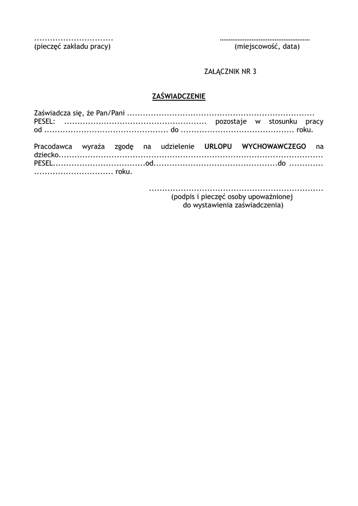 .............................. (pieczęć zakładu pracy) …………………………………………… (miejscowość, data) ZAŁĄCZNIK NR 3 ZAŚWIADCZENIE Zaświadcza się, że Pan/Pani ....................................................................... PESEL: ...................................................... pozostaje w stosunku pracy od ............................................... do ........................................... roku. Pracodawca wyraża zgodę na udzielenie URLOPU WYCHOWAWCZEGO na dziecko.................................................................................................... PESEL...................................od...............................................do ............. .............................. roku. .................................................................. (podpis i pieczęć osoby upoważnionej do wystawienia zaświadczenia)