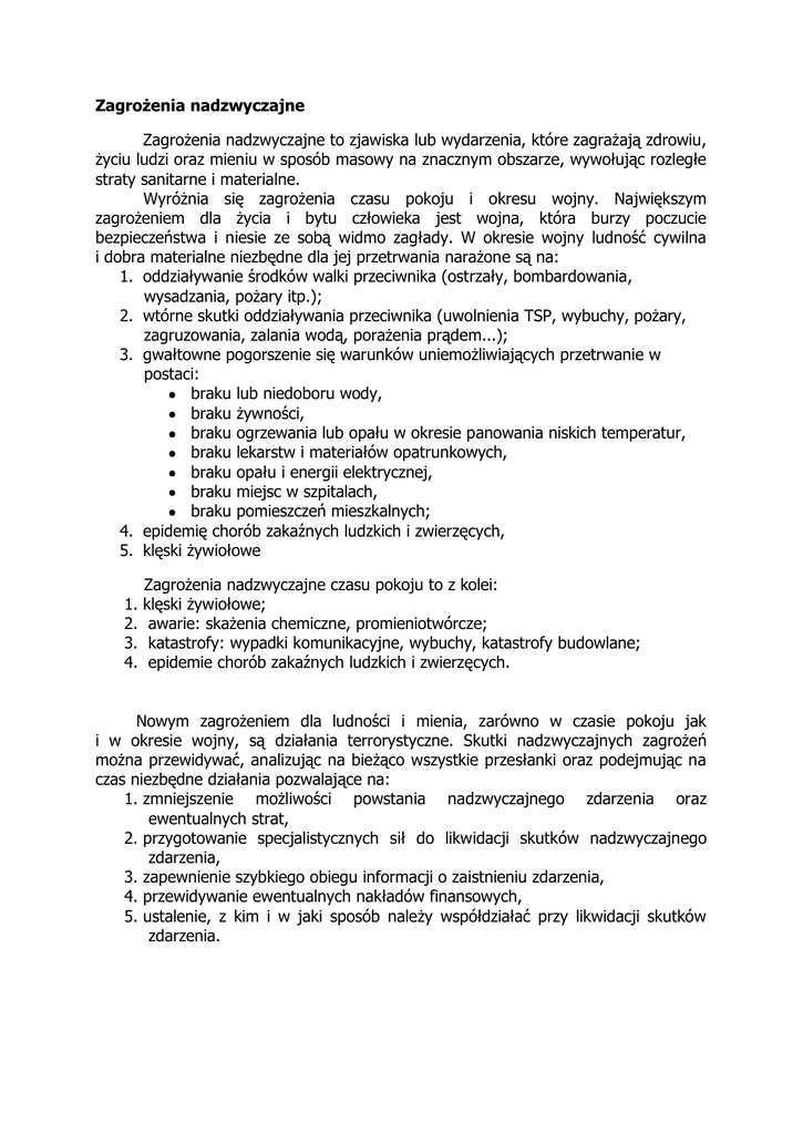 Zagrożenia nadzwyczajne Zagrożenia nadzwyczajne to zjawiska lub wydarzenia, które zagrażają zdrowiu, życiu ludzi oraz mieniu w sposób masowy na znacznym obszarze, wywołując rozległe straty sanitarne i materialne. Wyróżnia się zagrożenia czasu pokoju i okresu wojny. Największym zagrożeniem dla życia i bytu człowieka jest wojna, która burzy poczucie bezpieczeństwa i niesie ze sobą widmo zagłady. W okresie wojny ludność cywilna i dobra materialne niezbędne dla jej przetrwania narażone są na: 1. oddziaływanie środków walki przeciwnika (ostrzały, bombardowania, wysadzania, pożary itp.); 2. wtórne skutki oddziaływania przeciwnika (uwolnienia TSP, wybuchy, pożary, zagruzowania, zalania wodą, porażenia prądem...); 3. gwałtowne pogorszenie się warunków uniemożliwiających przetrwanie w postaci: braku lub niedoboru wody, braku żywności, braku ogrzewania lub opału w okresie panowania niskich temperatur, braku lekarstw i materiałów opatrunkowych, braku opału i energii elektrycznej, braku miejsc w szpitalach, braku pomieszczeń mieszkalnych; 4. epidemię chorób zakaźnych ludzkich i zwierzęcych, 5. klęski żywiołowe 1. 2. 3. 4. Zagrożenia nadzwyczajne czasu pokoju to z kolei: klęski żywiołowe; awarie: skażenia chemiczne, promieniotwórcze; katastrofy: wypadki komunikacyjne, wybuchy, katastrofy budowlane; epidemie chorób zakaźnych ludzkich i zwierzęcych. Nowym zagrożeniem dla ludności i mienia, zarówno w czasie pokoju jak i w okresie wojny, są działania terrorystyczne. Skutki nadzwyczajnych zagrożeń można przewidywać, analizując na bieżąco wszystkie przesłanki oraz podejmując na czas niezbędne działania pozwalające na: 1. zmniejszenie możliwości powstania nadzwyczajnego zdarzenia oraz ewentualnych strat, 2. przygotowanie specjalistycznych sił do likwidacji skutków nadzwyczajnego zdarzenia, 3. zapewnienie szybkiego obiegu informacji o zaistnieniu zdarzenia, 4. przewidywanie ewentualnych nakładów finansowych, 5. ustalenie, z kim i w jaki sposób należy współdziałać przy likwidacji skutków zdarzenia. Do likwidacji lokalnych zagrożeń w okresie pokoju zobowiązane są etatowe siły ratownicze (PSP, Policja, służby: medyczne, sanitarno –epidemiologiczne, weterynaryjne, ochrony środowiska i inne) oraz wydzielone pododdziały sił zbrojnych, a także (przy dużych rozmiarach zagrożenia) ludność cywilna. Działaniami ratowniczymi w okresie pokoju kieruje wyznaczona osoba z PSP, koordynując swoje działania z właściwym miejscowo organem samorządu terytorialnego (wójtem, burmistrzem, starostą, wojewodą – w zależności od rozmiaru zagrożenia). W okresie wojny likwidacją nadzwyczajnych zagrożeń zajmą się wszystkie siły i środki, będące w dyspozycji na danym obszarze, pod kierownictwem właściwego miejscowo organu do spraw obrony cywilnej (wójtem, burmistrzem, starostą, wojewodą – w zależności od rozmiaru zagrożenia). W przypadku niedostatecznych predyspozycji przez te osoby, organy zwierzchnie mogą wyznaczyć inną, merytorycznie kompetentną, osobę. Zagrożenia toksycznymi środkami przemysłowymi (TSP) Jednym z największych zagrożeń w czasie pokoju, a także w okresie wojny, jest skażenie toksycznymi środkami przemysłowymi. Spośród 450 stosowanych w gospodarce substancji chemicznych około 170 zaliczone zostało przez komisję gospodarczą ONZ do TSP. Spośród nich: fosgen, chlor i cyjanowodór, (które jeszcze w czasie I wojny światowej stosowane były jako bojowe środki trujące) są wykorzystywane powszechnie w przemyśle. A oto podstawowe dane o niektórych toksycznych środkach przemysłowych: Akrylonitryl CH2=CH-CN działanie: działanie akrylonitrylu przypomina zatrucie człowieka kwasem pruskim, od którego akrylonitryl jest tylko dwukrotnie mniej toksyczny. Zatrucie następuje przez drogi oddechowe, przewód pokarmowy i skórę. Podczas wdychania akrylonitryl działa przez blokadę wewnątrzkomórkowych enzymów oddechowych zawierających żelazo, co utrudnia przyswajanie przez organizm tlenu dostarczanego przez krew. Ulega zakłóceniu funkcja centralnego układu nerwowego. Podczas działania przez skórę wywołuje silne oparzenia, które gojąc się tworzą blizny. objawy zatrucia: podczas wdychania par akrylonitrylu początkowo możliwe jest pieczenie błon śluzowych i łzawienie, następnie pojawia się ból głowy, ucisk w klatce piersiowej, podniecenie i uczucie strachu, swędzenie skóry. Podczas ostrego zatrucia: ból głowy, osłabienie, nudności, wymioty, zawroty głowy duszność, pocenie się, biegunka. W szczególnie ciężkich przypadkach oprócz tego możliwe są drgawki, sinica, tachykardia, obniżenie temperatury ciała, utrata świadomości. Przy bardzo krótkim kontakcie i szybkim usunięciu niewielkiej ilości ze skóry nie obserwuje się wyraźnych objawów. Jednak jeśli nie usunie się go ze skóry od razu, pojawia się intensywne zaczerwienienie, pieczenie oraz powstają oparzenia drugiego i trzeciego stopnia. zasady udzielania pierwszej pomocy: wynieść natychmiast porażonego ze strefy skażenia. Natychmiast podać do wdychania azotan amylu (na wacie) przez 15 – 30 sekund, powtarzając po 2 - 3 minutach. Zapewnić świeże powietrze, ciepło, spokój. Zmienić skażoną odzież. Skórę przemyć wodą z mydłem. W razie konieczności wykonać sztuczne oddychanie, a następnie podać tlen. Przy utrzymywaniu się lub ponownym występowaniu objawów zatrucia powtórzyć terapię antidotową. Po spożyciu akrylonitrylu natychmiast spowodować wymioty (podać do wypicia roztwór soli kuchennej –jedna łyżka stołową na szklankę wody), wykonać płukanie żołądka roztworem nadmanganianu potasu (2g na 1 l wody) lub wprowadzić do żołądka zawiesiny węgla aktywnego albo 2% roztworu sody. Stosować terapię antidotową. W przypadku trafienia akrylonitrylu na skórę należy przemyć ją dużą ilością ciepłej wody z mydłem. Miej
