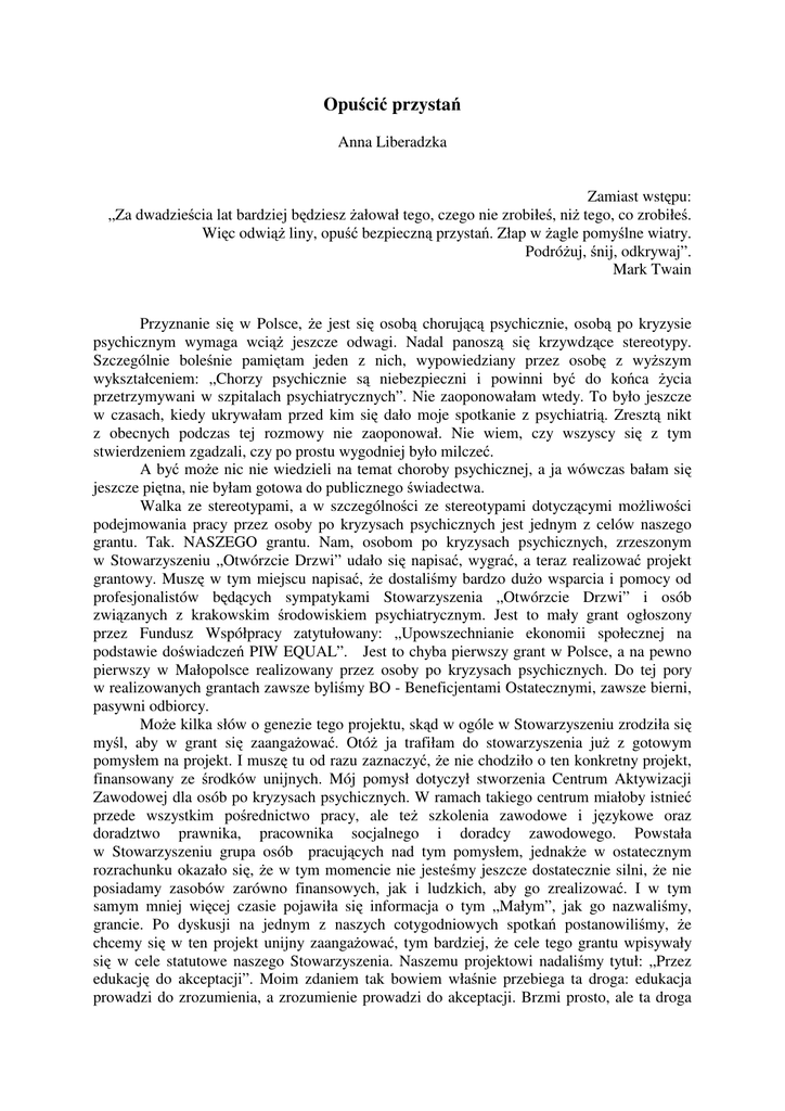 Opuścić przystań Anna Liberadzka Zamiast wstępu: „Za dwadzieścia lat bardziej będziesz żałował tego, czego nie zrobiłeś, niż tego, co zrobiłeś. Więc odwiąż liny, opuść bezpieczną przystań. Złap w żagle pomyślne wiatry. Podróżuj, śnij, odkrywaj”. Mark Twain Przyznanie się w Polsce, że jest się osobą chorującą psychicznie, osobą po kryzysie psychicznym wymaga wciąż jeszcze odwagi. Nadal panoszą się krzywdzące stereotypy. Szczególnie boleśnie pamiętam jeden z nich, wypowiedziany przez osobę z wyższym wykształceniem: „Chorzy psychicznie są niebezpieczni i powinni być do końca życia przetrzymywani w szpitalach psychiatrycznych”. Nie zaoponowałam wtedy. To było jeszcze w czasach, kiedy ukrywałam przed kim się dało moje spotkanie z psychiatrią. Zresztą nikt z obecnych podczas tej rozmowy nie zaoponował. Nie wiem, czy wszyscy się z tym stwierdzeniem zgadzali, czy po prostu wygodniej było milczeć. A być może nic nie wiedzieli na temat choroby psychicznej, a ja wówczas bałam się jeszcze piętna, nie byłam gotowa do publicznego świadectwa. Walka ze stereotypami, a w szczególności ze stereotypami dotyczącymi możliwości podejmowania pracy przez osoby po kryzysach psychicznych jest jednym z celów naszego grantu. Tak. NASZEGO grantu. Nam, osobom po kryzysach psychicznych, zrzeszonym w Stowarzyszeniu „Otwórzcie Drzwi” udało się napisać, wygrać, a teraz realizować projekt grantowy. Muszę w tym miejscu napisać, że dostaliśmy bardzo dużo wsparcia i pomocy od profesjonalistów będących sympatykami Stowarzyszenia „Otwórzcie Drzwi” i osób związanych z krakowskim środowiskiem psychiatrycznym. Jest to mały grant ogłoszony przez Fundusz Współpracy zatytułowany: „Upowszechnianie ekonomii społecznej na podstawie doświadczeń PIW EQUAL”. Jest to chyba pierwszy grant w Polsce, a na pewno pierwszy w Małopolsce realizowany przez osoby po kryzysach psychicznych. Do tej pory w realizowanych grantach zawsze byliśmy BO - Beneficjentami Ostatecznymi, zawsze bierni, pasywni odbiorcy. Może kilka słów o genezie tego projektu, skąd w ogóle w Stowarzyszeniu zrodziła się myśl, aby w grant się zaangażować. Otóż ja trafiłam do stowarzyszenia już z gotowym pomysłem na projekt. I muszę tu od razu zaznaczyć, że nie chodziło o ten konkretny projekt, finansowany ze środków unijnych. Mój pomysł dotyczył stworzenia Centrum Aktywizacji Zawodowej dla osób po kryzysach psychicznych. W ramach takiego centrum miałoby istnieć przede wszystkim pośrednictwo pracy, ale też szkolenia zawodowe i językowe oraz doradztwo prawnika, pracownika socjalnego i doradcy zawodowego. Powstała w Stowarzyszeniu grupa osób pracujących nad tym pomysłem, jednakże w ostatecznym rozrachunku okazało się, że w tym momencie nie jesteśmy jeszcze dostatecznie silni, że nie posiadamy zasobów zarówno finansowych, jak i ludzkich, aby go zrealizować. I w tym samym mniej więcej czasie pojawiła się informacja o tym „Małym”, jak go nazwaliśmy, grancie. Po dyskusji na jednym z naszych cotygodniowych spotkań postanowiliśmy, że chcemy się w ten projekt unijny zaangażować, tym bardziej, że cele tego grantu wpisywały się w cele statutowe naszego Stowarzyszenia. Naszemu projektowi nadaliśmy tytuł: „Przez edukację do akceptacji”. Moim zdaniem tak bowiem właśnie przebiega ta droga: edukacja prowadzi do zrozumienia, a zrozumienie prowadzi do akceptacji. Brzmi prosto, ale ta droga prosta nie jest. Mamy świadomość tego, że nie każdy edukowany zrozumie i nie każdy, kto zrozumie zaakceptuje. Przykład? Pani wicedyrektor Instytutu krakowskiego, gdzie studiowałam, kobieta z dużym doświadczeniem, wykształcona. Podpisując zgodę na mój drugi urlop dziekański związany z moją chorobą, stwierdziła, że i tak nie skończę tej psychologii, ale jeżeli ma mi to pomóc wyzdrowieć, to ona mi tą „dziekankę” podpisze. Pomogło. A pracę magisterską obroniłam na ocenę bardzo dobrą. Nie wiem, czy wspomniana przeze mnie Pani wicedyrektor miała wcześniej jakiś kontakt z osobami chorującymi psychicznie, ale tu zabrakło nie tylko akceptacji i zrozumienia. Tu przede wszystkim zabrakło zwykłej wiary w drugiego człowieka. Wracając do grantu, napisałam, że jednym z jego głównych celów jest walka ze stereotypami. Były na ten temat prowadzone badania w Izraelu. Tam pojawiły się m.in. takie wypowiedzi, że osoby chorujące psychicznie wyglądają inaczej, co jest zupełnie absurdalne. W tych badaniach uczestniczyli miedzy innymi studenci i wyniki wskazały, że: „23% z nich było zaskoczonych odkryciem, iż ludzie chorujący psychicznie są zdolni do normalnego funkcjonowania. Osoby chorujące psychicznie były początkowo postrzegane przez studentów jako ludzie niezdolni do podjęcia podstawowych czynności życiowych, takich jak poprawne komunikowanie się, decydowanie o kształcie własnego życia czy samodzielne funkcjonowanie.” (Ron Shror, J. Sykes, Israel). Cóż tutaj dopiero mówić o możliwości podjęcia pracy przez osoby chorujące psychicznie. Drugi cel grantu to promowanie idei przedsiębiorczości społecznej. Firmy społeczne to instytucje, które nie są nastawione tylko i wyłącznie na zysk. Tam główną wartością jest rehabilitacja osób chorujących psychicznie, ale też przełamywanie stereotypów, przeciwdziałanie wykluczeniu społecznemu, czy wreszcie reintegracja osób już wykluczonych. Jest to możliwe dzięki tworzeniu takich naturalnych relacji jak: pracownik pracodawca czy sprzedający - kupujący. Ale ideę przedsiębiorczości społecznej można rozumieć nieco głębiej, patrząc oczami beneficjenta, jako postawę, postawę motywacji, postawę zaangażowania czy zmiany własnej niekorzystnej sytuacji na lepszą. I wreszcie trzeci cel projektu to przeciwdziałanie dyskryminacji osób chorujących psychicznie na rynku pracy. Sytuacja tych osób je