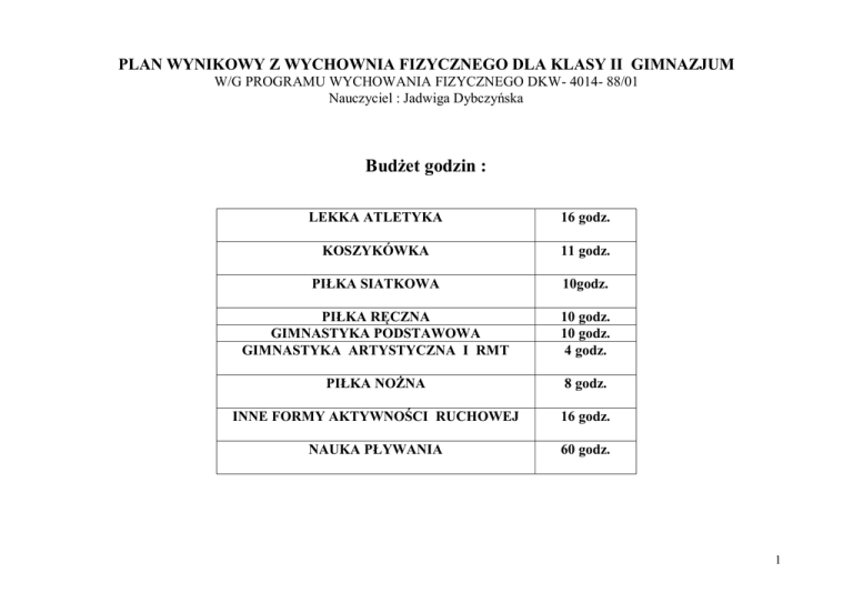 PLAN WYNIKOWY Z WYCHOWNIA FIZYCZNEGO DLA KLASY II GIMNAZJUM W/G PROGRAMU WYCHOWANIA FIZYCZNEGO DKW- 4014- 88/01 Nauczyciel : Jadwiga Dybczyńska Budżet godzin : LEKKA ATLETYKA 16 godz. KOSZYKÓWKA 11 godz. PIŁKA SIATKOWA 10godz. PIŁKA RĘCZNA GIMNASTYKA PODSTAWOWA GIMNASTYKA ARTYSTYCZNA I RMT 10 godz. 10 godz. 4 godz. PIŁKA NOŻNA 8 godz. INNE FORMY AKTYWNOŚCI RUCHOWEJ 16 godz. NAUKA PŁYWANIA 60 godz. 1 LEKKA ATLETYKA – 16 godz. TEMATYKA I TREŚĆ ZADANIA WYMAGANIA PROGRAMOWE Wykonuje start z różnych pozycji wyjściowych po uprzedniej demonstracji. Wykonanie startu niskiego po korekcie nauczyciela. Przebiega dystans w wolnym tempie, start niski z małymi błędami technicznymi. Przebiegnie dystans w wolnym tempie. Przebiegnie dystans w wolnym tempie. PONADPODSTAWOWE Przestrzega zasady bezpieczeństwa na lekcji w- f i zna podstawowe zasady oceniania. Samodzielnie wykonuje starty z różnych pozycji wyjściowych na komendę nauczyciela. Bezbłędnie wykona start niski. Zna komendy do startu. Przebiegł dystansie w szybkim tempie, start poprawny technicznie. Przebiegnie dystans w szybkim tempie. Potrafi rozłożyć siły i przebiec dystans w szybkim tempie. Biegi wytrzymałościowe 12’,20’,30’ Przebiegnie dystans w wolnym tempie. Potrafi rozłożyć siły i przebiec dystans w szybkim tempie Pokonywanie przeszkód terenowych. Bezpiecznie pokonuje przeszkody terenowe w wolnym tempie. Bezpiecznie pokonuje przeszkody terenowe w szybkim tempie. Marszobiegi, wykorzystanie terenu naturalnego. Pokona dystans w wolnym tempie. Marszobieg w większości jest pokonany w biegu i w szybkim tempie. Walory turystyczny regionuwykorzystanie terenu naturalnego do biegania, Rzut piłką lekarską oburącz. Przestrzeganie zasad bezpieczeństwa w czasie rzutów. Wykonanie rzutu po pokazie nauczyciela, na bliską odległość. Wykona prawidłowo technicznie rzut, na dużą odległość. Przestrzeganie zasad bezpieczeństwa w czasie rzutów. Zasady prawidłowego odżywiania a rozwój fizyczny. Lekcje organizacyjne: przedstawienie zasad bezpieczeństwa BHP oraz przedmiotowego systemu oceniania. Zaprawa ogólnorozwojowa z akcentem szybkości , starty z różnych pozycji wyjściowych. Bieg na krótkim odcinku ze startu niskiego. Doskonalenie startu niskiego. Bieg na dystansie 60m. Doskonalenie techniki biegowej. Bieg średni na dystansie 300m i 400m. Bieg wytrzymałościowy- 600m, 1000m. PODSTAWOWE Przestrzega zasad bezpieczeństwa na lekcji wychowania fizycznego. WIADOMOŚCI ORAZ DZIAŁANIA WYCHOWAWCZE Wdrażanie do przestrzegania zasad higieny osobistej i bezpieczeństwa w czasie zajęć. Ćwiczenia kształtujące szybkość. Zasady pielęgnacji ciała oraz hartowanie organizmu. Technika wykonania i komendy do startu. Samodyscyplina. Mój wynik - moim sukcesem. Pomiar czasu. Samodoskonalenie umiejętności ruchowych. Rozkładanie sił w biegach średnich. Aktywność ruchowa w różnych okresach życia. Umiejętność rozłożenia sił na długich dystansach. Składniki pokarmowe i ich rola. Bezpieczne miejsce do ćwiczeń. Wykorzystanie terenu do pokonywania przeszkód . 2 Skok w dal z rozbiegu, technika naturalną. Znaczenie wysiłku fizycznego dla prawidłowego funkcjonowania organizmu. Skok wzwyż techniką nożycową lub dowolnie wybraną przez nauczyciela. Biegi sztafetowe . Zmiany pałeczki sztafetowej. Technika skoku wymaga korekty nauczyciela. Skok wykonany na bliską odległość. Wykona skok techniką nożycowa na niedużą wysokość. Potrafi przekazać pałeczkę w strefie zmian i przebiec dystans w tempie wolnym. Wykona prawidłowy technicznie skok, na dużą odległość. Wykona skok poprawnie technicznie i na dużą wysokość. Opanował prawidłowo technikę zmiany pałeczki sztafetowej i przebiec dystans w szybkim tempie. Znaczenie wysiłku fizycznego dla prawidłowego funkcjonowania organizmu. Ćwiczenia i działania wpływające na sprawność fizyczną. Przepisy poszczególnych konkurencji technicznych. KOSZYKÓWKA – 11 godz. TEMATYKA I TREŚĆ ZADANIA Doskonalenie poznanych elementów technicznych i taktyczne z klasy I. Podania i chwyty w miejscu, w marszu , w biegu, po podaniu i kozłowaniu, ze zmiana kierunku tempa i pozycji. Kozłowanie piłki ręką prawą i lewą po prostej, slalomem, ze zmianą kierunku biegu. Przechwytywanie piłki w locie i przy kozłowaniu. Rzuty do kosza oburącz i jednorącz z miejsca, z zbiegu, po dwutakcie., po kozłowaniu i zatrzymaniu. Doskonalenie zwodów, uwalnianie się od przeciwnika. Technika obrotów (pivot). Nauka obrony w grze. Krycie „każdy swego” w grze 2x2, 3x3, asekuracja w obronie. WYMAGANIA PROGRAMOWE PODSTAWOWE Poprawnie wykonuje elementy techniczne i taktyczne. PONADPODSTAWOWE Potrafi skutecznie stosować poznane elementy techniczne. gry. Wykonuje podania i chwyty z niewielkimi błędami. Wykonuje kozłowanie prawą i lewa ręką z małymi błędami w miejscu i w biegu. Potrafi przechwycić piłkę z niewielkimi błędami. Potrafi swobodnie przemieszczać się po boisku wykonując prawidłowo podania i chwyty. Dokładnie wykonuje kozłowanie prawą i lewą ręką w miejscu, w biegu i slalomem. Potrafi dokładnie przechwycić piłkę . Wykona rzut celny z różnych pozycji z niewielkimi błędami. Wykona prawidłowo technicznie rzut celny z różnych pozycji . Wykona obrót i zwód przed podaniem i rzutem. Potrafi pokryć przeciwnika, poruszać się w obronie. Skutecznie wykorzystuje elementy w grze. Potrafi skutecznie pokryć przeciwnika i stworzyć sytuację korzystna dla zespołu. WIADOMPOŚCI ORAZ DZIAŁANIA WYCHOWAWCZE Ćwiczenia rozwijające określone zdolności ruchowe. Samoocena umiejętności. Przepisy gry. Współpraca w zespole. Zachowanie się w różnych sytuacjach codziennego życia. Samodyscyplina. Zasady bezpieczeństwa podczas ćwiczeń. Przepisy gry. Ćwiczenie rozwijające określone zdolności ruchowe. Samodoskonalenie się - korzyści płynące z samodoskonalenia. Zasada „ fair play” w grach zespoł