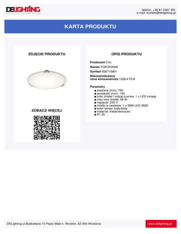 telefon: +48 61 4367 481 e-mail: [email protected] KARTA PRODUKTU ZDJĘCIE PRODUKTU OPIS PRODUKTU Producent Trio Nazwa YOKOHAMA Symbol 658715801 Rekomendowana cena konsumencka 1328.4 PLN ZOBACZ WIĘCEJ Parametry ● średnica (mm): 750 ● wysokość (mm): 140 ● ilość źródeł / rodzaj trzonka: 1 x LED zintegr. ● max moc źródła: 58 W ● napięcie: 230 V ● źródło w zestawie: 1 x 58W LED SMD ● kolor lampy: biały/biały ● materiał: metal/tworzywo ● IP: 20 DELighting ul.Budowlana 10 Psary Małe k. Wrześni, 62-300 Września www.delighting.pl