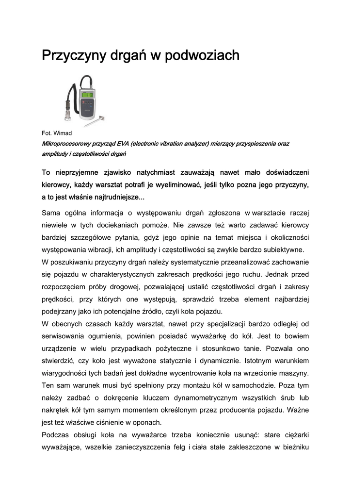 Przyczyny drgań w podwoziach Fot. Wimad Mikroprocesorowy przyrząd EVA (electronic vibration analyzer) mierzący przyspieszenia oraz amplitudy i częstotliwości drgań To nieprzyjemne zjawisko natychmiast zauważają nawet mało doświadczeni kierowcy, każdy warsztat potrafi je wyeliminować, jeśli tylko pozna jego przyczyny, a to jest właśnie najtrudniejsze... Sama ogólna informacja o występowaniu drgań zgłoszona w warsztacie raczej niewiele w tych dociekaniach pomoże. Nie zawsze też warto zadawać kierowcy bardziej szczegółowe pytania, gdyż jego opinie na temat miejsca i okoliczności występowania wibracji, ich amplitudy i częstotliwości są zwykle bardzo subiektywne. W poszukiwaniu przyczyny drgań należy systematycznie przeanalizować zachowanie się pojazdu w charakterystycznych zakresach prędkości jego ruchu. Jednak przed rozpoczęciem próby drogowej, pozwalającej ustalić częstotliwości drgań i zakresy prędkości, przy których one występują, sprawdzić trzeba element najbardziej podejrzany jako ich potencjalne źródło, czyli koła pojazdu. W obecnych czasach każdy warsztat, nawet przy specjalizacji bardzo odległej od serwisowania ogumienia, powinien posiadać wyważarkę do kół. Jest to bowiem urządzenie w wielu przypadkach pożyteczne i stosunkowo tanie. Pozwala ono stwierdzić, czy koło jest wyważone statycznie i dynamicznie. Istotnym warunkiem wiarygodności tych badań jest dokładne wycentrowanie koła na wrzecionie maszyny. Ten sam warunek musi być spełniony przy montażu kół w samochodzie. Poza tym należy zadbać o dokręcenie kluczem dynamometrycznym wszystkich śrub lub nakrętek kół tym samym momentem określonym przez producenta pojazdu. Ważne jest też właściwe ciśnienie w oponach. Podczas obsługi koła na wyważarce trzeba koniecznie usunąć: stare ciężarki wyważające, wszelkie zanieczyszczenia felg i ciała stałe zakleszczone w bieżniku opony, a także dokonać oceny wizualnej stanu bieżnika i boków opon. Jeśli lokalne, promieniowe lub osiowe zagięcie obręczy przekracza wartość 1mm, felgę należy wymienić. Prostowanie jest tutaj sprawą dyskusyjną, gdyż jego poprawne wykonanie zależy od spełnienia kilku dodatkowych warunków, co dla większości warsztatów jest niedostępne. Po zamontowaniu wyważonych, „prostych”, czystych i właściwie napompowanych kół w pojeździe można przystąpić do jazdy próbnej. Należy do tego wybrać trasę, której nawierzchnia nie będzie dodatkowym źródłem drgań przenoszonych na podwozie samochodu, czyli musi być ona płaska i równa! Test należy przeprowadzić na dystansie co najmniej 3 x 15 km. Tak długie odcinki są wymagane w celu rozgrzania opon i amortyzatorów. Wszelkie objawy powinny być notowane dla stałej prędkości powyżej 70 km/h. Najlepiej przejechać dłuższe odcinki (>2km) z prędkościami stałymi stopniowanymi co 10 km/h. Dla wykluczenia subiektywnych odczuć diagnosty do rejestracji drgań należy użyć ich elektronicznego analizatora (EVA), pokazanego na ilustracji. Przyrządy te rejestrują przyspieszenia pionowe w procentach przyspieszenia ziemskiego [% g ] i częstotliwości. Podczas pomiarów należy zarejestrować, przy jakiej prędkości występują hałasy (drgania wysokoczęstotliwościowe), a przy jakiej drgania odczuwalne na fotelu kierowcy, na podłodze i kole kierownicy. Rejestracji dokonuje się dla trzech punktów zamocowania sondy pomiarowej: na kolumnie kierownicy, na dachu kabiny pasażerskiej, na prowadnicy fotela. Czujnik musi opierać się bezpośrednio o te elementy pojazdu, aby wykluczyć dodatkowe tłumienia zakłócające pomiar. Jeśli maksimum amplitudy przyspieszenia pionowego wypada w zakresie częstotliwości 35-50 Hz, generatorem drgań są obracające się elementy układu napędowego (od wału korbowego do piasty koła). Gdy maksimum tej amplitudy występuje w zakresie 10-20 Hz, przyczyny drgań należy szukać w samym kole (opona + obręcz) lub w elemencie obrotowym bezpośrednio z nim związanym (np. tarcza hamulcowa o dużej średnicy). Drgania związane z kołem mogą być odczuwalne w zakresie prędkości pojazdu: 70-90 km/h jako drgania pionowe kierownicy lub podłogi pojazdu (przyczyna: spłaszczenie opon po długotrwałym postoju, np. podczas transportu oceanicznego samochodów, statyczne niewyważenie tarczy hamulcowej lub koła; 110-130 km/h jako drgania oscylacyjne kierownicy (przyczyna: niewyważenie dynamiczne kół); powyżej 130 km/h (przyczyna: przekroczenie limitów niejednorodności sztywności promieniowej niejednorodności opon sztywności lub zestawienia promieniowej z opony o nadmiernej obręczą o nadmiernej niejednorodności kształtu, czyli z biciem promieniowym i osiowym). Obydwa przypadki postaram się omówić na przykładzie nietuzinkowych samochodów o zaawansowanej technice, a pochodzących z dwóch „krańców świata”. Będą to: Aston Martin V12 Vantage i DBS (jeden z najlepiej ocenianych samochodów sportowych przez redaktorów Top Gear) oraz Subaru Outback (jeden z najlepiej jeżdżących samochodów kombi ze stałym napędem na 4 koła). Procedura eliminacji drgań w przypadku Aston Martina ogranicza się do kół i tarcz hamulcowych, gdyż drgania odczuwalne mogą tu występować w zakresie 80-170 km/h przy częstotliwości 10-20 Hz. Procedura ta dzieli się na cztery etapy: godzinna jazda próbna w celu zdiagnozowania drgań; kontrola spłaszczeń opon (Flat Spots), czas trwania 1 roboczogodzina; sprawdzanie niewyważeń oraz niejednorodności siły promieniowej (RFV) oraz ewentualna optymalizacja lub wymiana opon lub obręczy, czas trwania 1,6 roboczogodziny; kontrola i ewentualna eliminacja statycznego niewyważenia tarcz hamulcowych o dużej średnicy (475 lub 500 mm), czas trwania 1,05 roboczogodziny. W przypadku Subaru Outback (2010) prawdopodobieństwo wystąpienia rozmaitych drgań dotyczy całego zakresu prędkości i w całym tym zakresie mogą 
