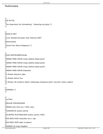 yanina.art.pl Multimedia KUP PŁYTĘ "The Searchers For Something" Posłuchaj tej płyty PRASA & NET Kurier Ateński-Europen Jazz Festival 2007 Narkomanka Yanina Free Wave-Diapazon MUZA INSTRUMENTALNA YANINA FREE WAVE-moja siódma klasa-part1 YANINA FREE WAVE-moja siódma klasa-part2 YANINA FREE WAVE-moja siódma klasa-part3 YANINA FREE WAVE-białystok Tie Break-sztywna ręka Tie Break-Arhus-live Tie Break-18 urodziny teatru witkacego-zkopanie-part1 (są tam cztery części) PIOSENKI YouTube WIELKIE PODZIELENIE YANINA solo intro zp z 1991 roku TOLERANCJA soyka yanina ZACZEPKA PLATONICZNA soyka yanina 1991r WOO BOO DOO-wszystko leci z rąk WOO BOO DOO-atak na głowe MAANAM do kogo biegłam http://yanina.art.pl Kreator PDF Utworzono 7 March, 2017, 21:29 yanina.art.pl YANINA - motyli noc - wideoteka dorosłego czlowieka TVS-view z Y 47:04 min YANINA FREE WAVE - Białystok http://yanina.art.pl Kreator PDF Utworzono 7 March, 2017, 21:29