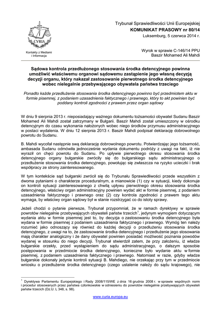 Trybunał Sprawiedliwości Unii Europejskiej KOMUNIKAT PRASOWY nr 80/14 Luksemburg, 5 czerwca 2014 r. Wyrok w sprawie C-146/14 PPU Baszir Mohamed Ali Mahdi Kontakty z Mediami i Informacja Sądowa kontrola przedłużonego stosowania środka detencyjnego powinna umożliwić właściwemu organowi sądowemu zastąpienie jego własną decyzją decyzji organu, który nakazał zastosowanie pierwotnego środka detencyjnego wobec nielegalnie przebywającego obywatela państwa trzeciego Ponadto każde przedłużenie stosowania środka detencyjnego powinno być przedmiotem aktu w formie pisemnej, z podaniem uzasadnienia faktycznego i prawnego, który to akt powinien być poddany kontroli zgodności z prawem przez organ sądowy W dniu 9 sierpnia 2013 r. nieposiadający ważnego dokumentu tożsamości obywatel Sudanu Baszir Mohamed Ali Mahdi został zatrzymany w Bułgarii. Baszir Mahdi został umieszczony w ośrodku detencyjnym do czasu wykonania nałożonych wobec niego środków przymusu administracyjnego w postaci wydalenia. W dniu 12 sierpnia 2013 r. Baszir Mahdi podpisał deklarację dobrowolnego powrotu do Sudanu. B. Mahdi wycofał następnie swą deklarację dobrowolnego powrotu. Potwierdzając jego tożsamość, ambasada Sudanu odmówiła jednocześnie wydania dokumentu podróży z uwagi na fakt, iż nie wyraził on chęci powrotu do Sudanu. Po upływie pierwotnego okresu stosowania środka detencyjnego organy bułgarskie zwróciły się do bułgarskiego sądu administracyjnego o przedłużenie stosowania środka detencyjnego, powołując się zwłaszcza na ryzyko ucieczki i brak współpracy ze strony zainteresowanego. W tym kontekście sąd bułgarski zwrócił się do Trybunału Sprawiedliwości przede wszystkim z dwoma pytaniami o charakterze proceduralnym, a mianowicie (1) czy w sytuacji, kiedy dokonuje on kontroli sytuacji zainteresowanego z chwilą upływu pierwotnego okresu stosowania środka detencyjnego, właściwy organ administracyjny powinien wydać akt w formie pisemnej, z podaniem uzasadnienia faktycznego i prawnego oraz (2) czy kontrola zgodności z prawem tego aktu wymaga, by właściwy organ sądowy był w stanie rozstrzygać co do istoty sprawy. Jeżeli chodzi o pytanie pierwsze, Trybunał przypomniał, że w ramach dyrektywy w sprawie powrotów nielegalnie przebywających obywateli państw trzecich1, jedynym wymogiem dotyczącym wydania aktu w formie pisemnej jest to, by decyzja o zastosowaniu środka detencyjnego była wydana w formie pisemnej z podaniem uzasadnienia faktycznego i prawnego. Wymóg ten należy rozumieć jako odnoszący się również do każdej decyzji o przedłużeniu stosowania środka detencyjnego, z uwagi na to, że zastosowanie środka detencyjnego i przedłużenie jego stosowania mają charakter analogiczny i że dany obywatel powinien posiadać możliwość poznania powodów wydanej w stosunku do niego decyzji. Trybunał stwierdził zatem, że przy założeniu, iż władze bułgarskie orzekły, przed wystąpieniem do sądu administracyjnego, o dalszym sposobie postępowania w przedmiocie środka detencyjnego, konieczne było wydanie aktu w formie pisemnej, z podaniem uzasadnienia faktycznego i prawnego. Natomiast w razie, gdyby władze bułgarskie dokonały jedynie kontroli sytuacji B. Mahdiego, nie orzekając przy tym w przedmiocie wniosku o przedłużenie środka detencyjnego (czego ustalenie należy do sądu krajowego), nie 1 Dyrektywa Parlamentu Europejskiego i Rady 2008/115/WE z dnia 16 grudnia 2008 r. w sprawie wspólnych norm i procedur stosowanych przez państwa członkowskie w odniesieniu do powrotów nielegalnie przebywających obywateli państw trzecich (Dz.U. L 348, s. 98). www.curia.europa.eu byłyby one zobowiązane do wydania wyraźnego aktu wobec braku w tym względzie przepisów w dyrektywie. Jeżeli chodzi o pytanie drugie, Trybunał stwierdził, że organ sądowy orzekający w przedmiocie wniosku o przedłużenie stosowania pierwotnego środka detencyjnego powinien koniecznie posiadać możliwość rozpatrzenia każdej istotnej okoliczności faktycznej i prawnej w celu ustalenia, czy przedłużenie to jest uzasadnione, co wymaga dogłębnego zbadania właściwych w danym przypadku okoliczności faktycznych. Organ ten powinien posiadać możliwość zastąpienia pierwotnie wydanej decyzji o zastosowaniu środka detencyjnego swą własną decyzją i bądź wydać decyzję o przedłużeniu stosowania środka detencyjnego, bądź zastosować mniej represyjny środek zastępczy, bądź, jeżeli jest to uzasadnione, wydać decyzję o zwolnieniu danego obywatela. Organ sądowy powinien wziąć pod uwagę każdą okoliczność istotną dla wydania takiej decyzji. Wynika stąd, że uprawnienia, jakimi dysponuje w ramach takiej kontroli organ sądowy nie mogą być w żadnym wypadku ograniczone jedynie do okoliczności przedstawionych przez organ administracyjny. Ponadto sąd krajowy zwrócił się do Trybunału z pytaniem, czy pierwotny okres stosowania środka detencyjnego może zostać przedłużony jedynie z tego względu, że obywatel państwa trzeciego nie posiada dokumentów tożsamości i że istnieje w związku z tym ryzyko ucieczki danego obywatela. Trybunał przypomniał w tym względzie, że ryzyko ucieczki powinno być również brane pod uwagę w ramach stosowania pierwotnego środka detencyjnego. Jeżeli chodzi jednak o przedłużenie stosowania środka detencyjnego, ryzyko ucieczki nie stanowi jednego z dwóch zawartych w dyrektywie warunków przedłużenia tego stosowania. Ryzyko to jest zatem istotne jedynie w kontekście kontroli przesłanek, które pierwotnie doprowadziły do zastosowania środka detencyjnego. Wymaga to zatem dokonania oceny okoliczności faktycznych towarzyszących sytuacji B. Mahdiego celem zbadania, czy nie można skutecznie zastosować wobec niego mniej represyjnego środka. Dokumenty tożsamości mogą być brane pod uwagę jedynie w przypadku utrzymywania się ryzyka ucieczki. Wynika stąd, iż bra