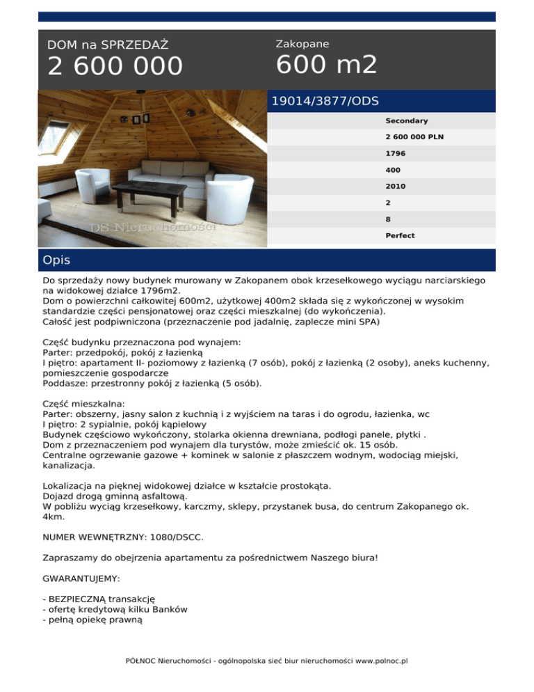 DOM na SPRZEDAŻ 2 600 000 Zakopane 600 m2 19014/3877/ODS Secondary 2 600 000 PLN 1796 400 2010 2 8 Perfect Opis Do sprzedaży nowy budynek murowany w Zakopanem obok krzesełkowego wyciągu narciarskiego na widokowej działce 1796m2. Dom o powierzchni całkowitej 600m2, użytkowej 400m2 składa się z wykończonej w wysokim standardzie części pensjonatowej oraz części mieszkalnej (do wykończenia). Całość jest podpiwniczona (przeznaczenie pod jadalnię, zaplecze mini SPA) Część budynku przeznaczona pod wynajem: Parter: przedpokój, pokój z łazienką I piętro: apartament II- poziomowy z łazienką (7 osób), pokój z łazienką (2 osoby), aneks kuchenny, pomieszczenie gospodarcze Poddasze: przestronny pokój z łazienką (5 osób). Część mieszkalna: Parter: obszerny, jasny salon z kuchnią i z wyjściem na taras i do ogrodu, łazienka, wc I piętro: 2 sypialnie, pokój kąpielowy Budynek częściowo wykończony, stolarka okienna drewniana, podłogi panele, płytki . Dom z przeznaczeniem pod wynajem dla turystów, może zmieścić ok. 15 osób. Centralne ogrzewanie gazowe + kominek w salonie z płaszczem wodnym, wodociąg miejski, kanalizacja. Lokalizacja na pięknej widokowej działce w kształcie prostokąta. Dojazd drogą gminną asfaltową. W pobliżu wyciąg krzesełkowy, karczmy, sklepy, przystanek busa, do centrum Zakopanego ok. 4km. NUMER WEWNĘTRZNY: 1080/DSCC. Zapraszamy do obejrzenia apartamentu za pośrednictwem Naszego biura! GWARANTUJEMY: - BEZPIECZNĄ transakcję - ofertę kredytową kilku Banków - pełną opiekę prawną PÓŁNOC Nieruchomości - ogólnopolska sieć biur nieruchomości www.polnoc.pl Więcej ofert znajdziesz na naszej stronie www.polnoc.pl * UWAGA! Zamieszczone na naszych stronach oferty nie stanowią oferty w rozumieniu Kodeksu Cywilnego, a dane w nich zawarte mają jedynie charakter informacyjny. Dariusz Siewierski tel. 506-131-463 email: [email protected] PÓŁNOC Nieruchomości - ogólnopolska sieć biur nieruchomości www.polnoc.pl Powered by TCPDF (www.tcpdf.org)
