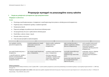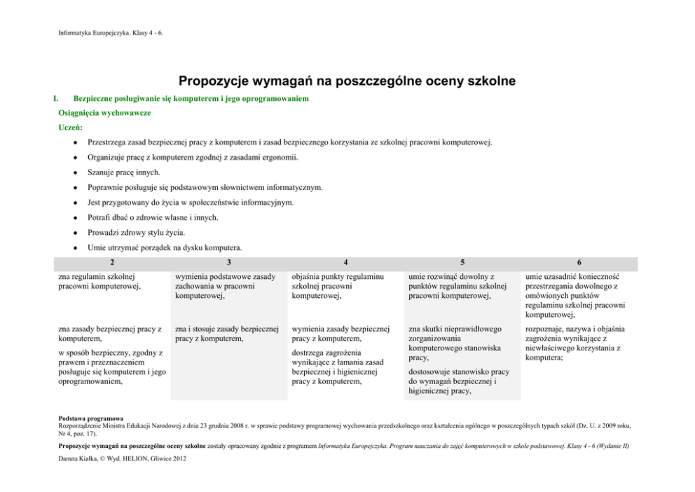 Informatyka Europejczyka. Klasy 4 - 6. Propozycje wymagań na poszczególne oceny szkolne I. Bezpieczne posługiwanie się komputerem i jego oprogramowaniem Osiągnięcia wychowawcze Uczeń: Przestrzega zasad bezpiecznej pracy z komputerem i zasad bezpiecznego korzystania ze szkolnej pracowni komputerowej. Organizuje pracę z komputerem zgodnej z zasadami ergonomii. Szanuje pracę innych. Poprawnie posługuje się podstawowym słownictwem informatycznym. Jest przygotowany do życia w społeczeństwie informacyjnym. Potrafi dbać o zdrowie własne i innych. Prowadzi zdrowy stylu życia. Umie utrzymać porządek na dysku komputera. 2 3 4 5 6 zna regulamin szkolnej pracowni komputerowej, wymienia podstawowe zasady zachowania w pracowni komputerowej, objaśnia punkty regulaminu szkolnej pracowni komputerowej, umie rozwinąć dowolny z punktów regulaminu szkolnej pracowni komputerowej, umie uzasadnić konieczność przestrzegania dowolnego z omówionych punktów regulaminu szkolnej pracowni komputerowej, zna zasady bezpiecznej pracy z komputerem, zna i stosuje zasady bezpiecznej pracy z komputerem, wymienia zasady bezpiecznej pracy z komputerem, zna skutki nieprawidłowego zorganizowania komputerowego stanowiska pracy, rozpoznaje, nazywa i objaśnia zagrożenia wynikające z niewłaściwego korzystania z komputera; w sposób bezpieczny, zgodny z prawem i przeznaczeniem posługuje się komputerem i jego oprogramowaniem, dostrzega zagrożenia wynikające z łamania zasad bezpiecznej i higienicznej pracy z komputerem, dostosowuje stanowisko pracy do wymagań bezpiecznej i higienicznej pracy, Podstawa programowa Rozporządzenie Ministra Edukacji Narodowej z dnia 23 grudnia 2008 r. w sprawie podstawy programowej wychowania przedszkolnego oraz kształcenia ogólnego w poszczególnych typach szkół (Dz. U. z 2009 roku, Nr 4, poz. 17). Propozycje wymagań na poszczególne oceny szkolne zostały opracowany zgodnie z programem Informatyka Europejczyka. Program nauczania do zajęć komputerowych w szkole podstawowej. Klasy 4 - 6 (Wydanie II) Danuta Kiałka, © Wyd. HELION, Gliwice 2012 Informatyka Europejczyka. Klasy 4 - 6. zachowuje prawidłową postawę podczas pracy z komputerem, zna przeznaczenie poszczególnych klawiszy, nazywa podstawowe klawisze i określa ich funkcje, prawidłowo posługuje się myszą i klawiaturą komputerową, prezentuje prawidłowy układ rąk na klawiaturze, omawia przeznaczenie poszczególnych klawiszy, wie, jak się wpisuje wielkie litery i polskie znaki, sprawnie posługuje się klawiaturą, zna przeznaczenie klawiszy: Page Up, Page Down, Home, End oraz klawiszy sterowania kursorem, popełnia nieliczne błędy, wprowadzając tekst z klawiatury, stosuje metodę przeciągnij i upuść, zna budowę klawiatury, nazywa podstawowe klawisze, przy pomocy nauczyciela obsługuje program do nauki pisania na klawiaturze komputera, korzysta z płyty CD dołączonej do podręcznika, odnajduje na niej właściwy plik według wskazówek nauczyciela, komunikuje się z komputerem za pomocą ikon, przycisków, menu i okien dialogowych, w prawidłowy sposób wprowadza z klawiatury litery z użyciem lewej i prawej ręki, obsługuje program do nauki pisania na klawiaturze komputera, świadomie korzysta z programów do nauki pisania na klawiaturze komputera; samodzielnie obsługuje płytę CD dołączoną do podręcznika, odnajduje właściwy plik potrzebny do wykonania zadania, samodzielnie pobiera, instaluje i uruchamia program do nauki pisania na klawiaturze komputera wykorzystywany na lekcji, samodzielnie zapisuje plik z płyty CD na dysku komputera bez zmiany nazwy oraz ze zmianą nazwy; stara się nie popełniać błędów przy wprowadzaniu tekstu z klawiatury, z niewielką pomocą nauczyciela obsługuje program do nauki pisania na klawiaturze komputera, przy pomocy nauczyciela zapisuje plik z płyty CD na dysku komputera bez zmiany nazwy oraz ze zmianą nazwy, zna pojęcie sieci komputerowej, przy pomocy nauczyciela poprawnie loguje się do szkolnej sieci komputerowej, prawidłowo rozpoczyna i kończy rozumie pojęcie sieci komputerowej, samodzielnie loguje się do szkolnej sieci komputerowej, wie, czym jest sieć komputerowa, wymienia zalety połączenia komputerów w sieć, przy niewielkiej pomocy nauczyciela loguje się do szkolnej sieci komputerowej, Podstawa programowa Rozporządzenie Ministra Edukacji Narodowej z dnia 23 grudnia 2008 r. w sprawie podstawy programowej wychowania przedszkolnego oraz kształcenia ogólnego w poszczególnych typach szkół (Dz. U. z 2009 roku, Nr 4, poz. 17). Propozycje wymagań na poszczególne oceny szkolne zostały opracowany zgodnie z programem Informatyka Europejczyka. Program nauczania do zajęć komputerowych w szkole podstawowej. Klasy 4 - 6 (Wydanie II) Danuta Kiałka, © Wyd. HELION, Gliwice 2012 Informatyka Europejczyka. Klasy 4 - 6. pracę w sieci; wskazuje miejsce Pomocy w programie, przy pomocy nauczyciela korzysta z Pomocy dostępnej w programie, przy pomocy nauczyciela poprawnie loguje się i obsługuje program z płyty CD dołączonej do podręcznika, według wskazówek nauczyciela uruchamia i obsługuje komputer oraz program z płyty CD dołączonej do podręcznika, samodzielnie obsługuje komputer oraz program z płyty CD dołączonej do podręcznika, rozróżnia podstawowe elementy zestawu komputerowego, wymienia elementy zestawu komputerowego, określa zastosowanie poszczególnych elementów zestawu komputerowego, zna pojęcie stanu uśpienia komputera, rozumie pojęcie stanu uśpienia komputera, wyjaśnia różnicę między całkowitym wyłączeniem komputera a jego przejściem w stan uśpienia; umie prawidłowo rozpocząć i zakończyć pracę z komputerem, samodzielnie korzysta z Pomocy dostępnej w programie, dostosowuje elementy okna programu do własnych potrzeb, jeżeli program daje taką możliwość, opisuje przyciski rozmieszczone na komputerze, prawidłowo rozpoczyna i kończy pracę z systemami Windows, Linux i Mac O