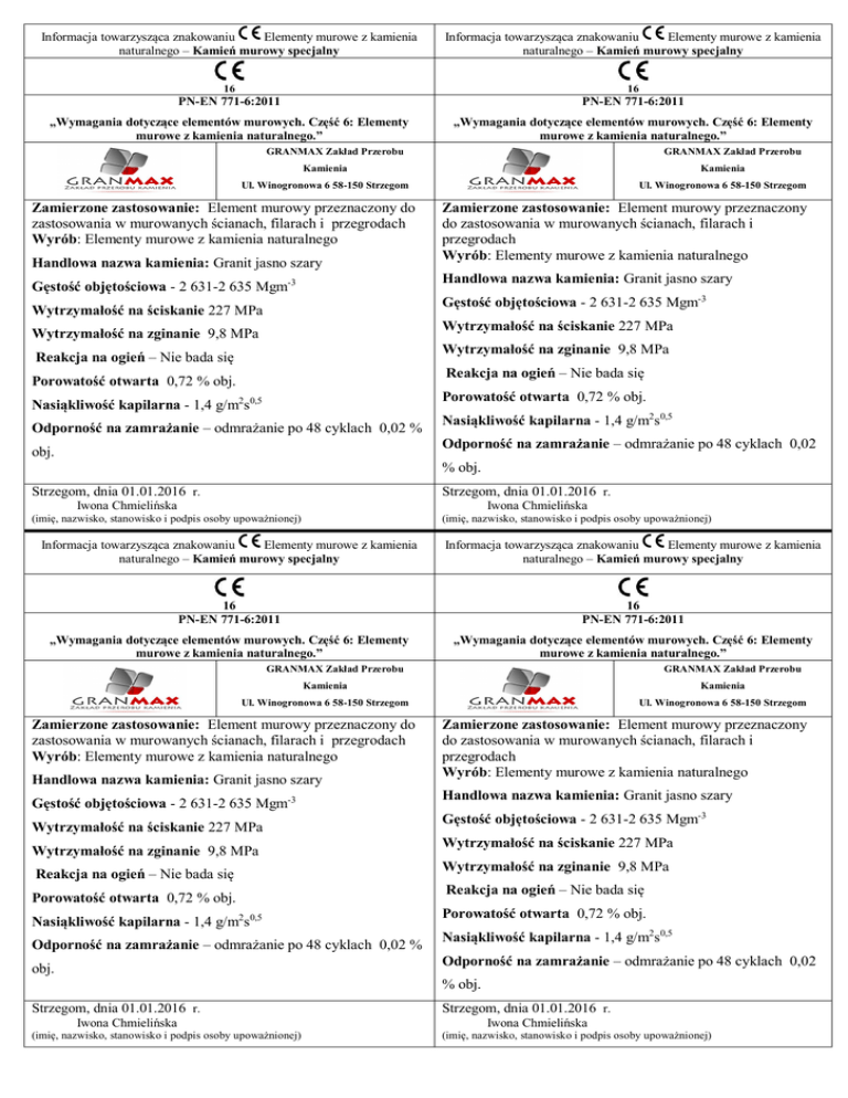 Informacja towarzysząca znakowaniu Elementy murowe z kamienia naturalnego – Kamień murowy specjalny Informacja towarzysząca znakowaniu Elementy murowe z kamienia naturalnego – Kamień murowy specjalny 16 16 PN-EN 771-6:2011 PN-EN 771-6:2011 „Wymagania dotyczące elementów murowych. Część 6: Elementy murowe z kamienia naturalnego.” „Wymagania dotyczące elementów murowych. Część 6: Elementy murowe z kamienia naturalnego.” GRANMAX Zakład Przerobu GRANMAX Zakład Przerobu Kamienia Kamienia Ul. Winogronowa 6 58-150 Strzegom Ul. Winogronowa 6 58-150 Strzegom Zamierzone zastosowanie: Element murowy przeznaczony do zastosowania w murowanych ścianach, filarach i przegrodach Wyrób: Elementy murowe z kamienia naturalnego Handlowa nazwa kamienia: Granit jasno szary Zamierzone zastosowanie: Element murowy przeznaczony do zastosowania w murowanych ścianach, filarach i przegrodach Wyrób: Elementy murowe z kamienia naturalnego Handlowa nazwa kamienia: Granit jasno szary Gęstość objętościowa - 2 631-2 635 Mgm-3 Gęstość objętościowa - 2 631-2 635 Mgm-3 Wytrzymałość na ściskanie 227 MPa Wytrzymałość na ściskanie 227 MPa Wytrzymałość na zginanie 9,8 MPa Wytrzymałość na zginanie 9,8 MPa Reakcja na ogień – Nie bada się Reakcja na ogień – Nie bada się Porowatość otwarta 0,72 % obj. Porowatość otwarta 0,72 % obj. Nasiąkliwość kapilarna - 1,4 g/m2s0,5 Odporność na zamrażanie – odmrażanie po 48 cyklach 0,02 % Nasiąkliwość kapilarna - 1,4 g/m2s0,5 Odporność na zamrażanie – odmrażanie po 48 cyklach 0,02 obj. % obj. Strzegom, dnia 01.01.2016 r. Strzegom, dnia 01.01.2016 r. Iwona Chmielińska Iwona Chmielińska (imię, nazwisko, stanowisko i podpis osoby upoważnionej) (imię, nazwisko, stanowisko i podpis osoby upoważnionej) Informacja towarzysząca znakowaniu Elementy murowe z kamienia naturalnego – Kamień murowy specjalny Informacja towarzysząca znakowaniu Elementy murowe z kamienia naturalnego – Kamień murowy specjalny 16 PN-EN 771-6:2011 16 PN-EN 771-6:2011 „Wymagania dotyczące elementów murowych. Część 6: Elementy murowe z kamienia naturalnego.” „Wymagania dotyczące elementów murowych. Część 6: Elementy murowe z kamienia naturalnego.” GRANMAX Zakład Przerobu GRANMAX Zakład Przerobu Kamienia Kamienia Ul. Winogronowa 6 58-150 Strzegom Ul. Winogronowa 6 58-150 Strzegom Zamierzone zastosowanie: Element murowy przeznaczony do zastosowania w murowanych ścianach, filarach i przegrodach Wyrób: Elementy murowe z kamienia naturalnego Handlowa nazwa kamienia: Granit jasno szary Gęstość objętościowa - 2 631-2 635 Mgm-3 Wytrzymałość na ściskanie 227 MPa Wytrzymałość na zginanie 9,8 MPa Reakcja na ogień – Nie bada się Porowatość otwarta 0,72 % obj. Nasiąkliwość kapilarna - 1,4 g/m2s0,5 Odporność na zamrażanie – odmrażanie po 48 cyklach 0,02 % Zamierzone zastosowanie: Element murowy przeznaczony do zastosowania w murowanych ścianach, filarach i przegrodach Wyrób: Elementy murowe z kamienia naturalnego Handlowa nazwa kamienia: Granit jasno szary Gęstość objętościowa - 2 631-2 635 Mgm-3 Wytrzymałość na ściskanie 227 MPa Wytrzymałość na zginanie 9,8 MPa Reakcja na ogień – Nie bada się Porowatość otwarta 0,72 % obj. Nasiąkliwość kapilarna - 1,4 g/m2s0,5 Odporność na zamrażanie – odmrażanie po 48 cyklach 0,02 obj. % obj. Strzegom, dnia 01.01.2016 r. Iwona Chmielińska (imię, nazwisko, stanowisko i podpis osoby upoważnionej) Strzegom, dnia 01.01.2016 r. Iwona Chmielińska (imię, nazwisko, stanowisko i podpis osoby upoważnionej)
