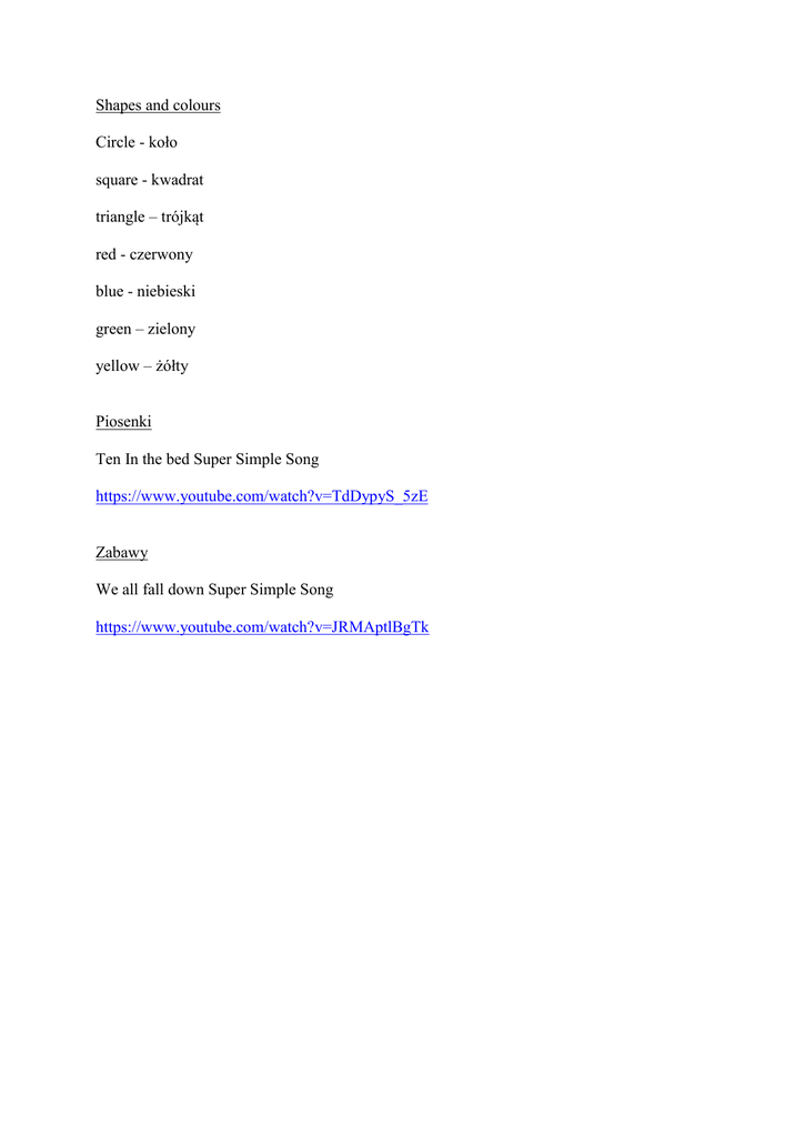 Shapes and colours Circle - koło square - kwadrat triangle – trójkąt red - czerwony blue - niebieski green – zielony yellow – żółty Piosenki Ten In the bed Super Simple Song https://www.youtube.com/watch?v=TdDypyS_5zE Zabawy We all fall down Super Simple Song https://www.youtube.com/watch?v=JRMAptlBgTk