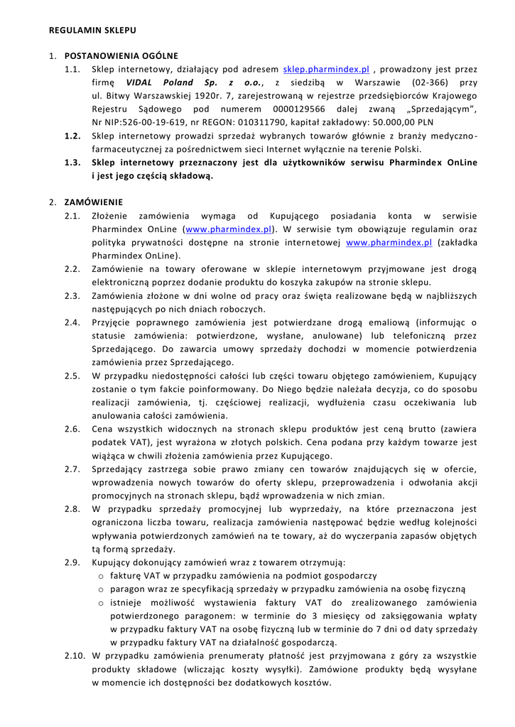 REGULAMIN SKLEPU 1. POSTANOWIENIA OGÓLNE 1.1. Sklep internetowy, działający pod adresem sklep.pharmindex.pl , prowadzony jest przez firmę VIDAL Poland Sp. z o.o., z siedzibą w Warszawie (02-366) przy ul. Bitwy Warszawskiej 1920r. 7, zarejestrowaną w rejestrze przedsiębiorców Krajowego Rejestru Sądowego pod numerem 0000129566 dalej zwaną „Sprzedającym”, Nr NIP:526-00-19-619, nr REGON: 010311790, kapitał zakładowy: 50.000,00 PLN 1.2. Sklep internetowy prowadzi sprzedaż wybranych towarów głównie z branży medyczno farmaceutycznej za pośrednictwem sieci Internet wyłącznie na terenie Polski. 1.3. Sklep internetowy przeznaczony jest dla użytkowników serwisu Pharminde x OnLine i jest jego częścią składową. 2. ZAMÓWIENIE 2.1. Złożenie zamówienia wymaga od Kupującego posiadania konta w serwisie Pharmindex OnLine (www.pharmindex.pl). W serwisie tym obowiązuje regulamin oraz polityka prywatności dostępne na stronie internetowej www.pharmindex.pl (zakładka Pharmindex OnLine). 2.2. Zamówienie na towary oferowane w sklepie internetowym przyjmowane jest drogą elektroniczną poprzez dodanie produktu do koszyka zakupów na stronie sklepu. 2.3. Zamówienia złożone w dni wolne od pracy oraz święta realizowane będą w najbliższych następujących po nich dniach roboczych. 2.4. Przyjęcie poprawnego zamówienia jest potwierdzane drogą emaliową (informując o statusie zamówienia: potwierdzone, wysłane, anulowane) lub telefoniczną przez Sprzedającego. Do zawarcia umowy sprzedaży dochodzi w momencie potwierdzenia zamówienia przez Sprzedającego. 2.5. W przypadku niedostępności całości lub części towaru objętego zamówieniem, Kupujący zostanie o tym fakcie poinformowany. Do Niego będzie należała decyzja, co do sposobu realizacji zamówienia, tj. częściowej realizacji, wydłużenia czasu oczekiwania lub anulowania całości zamówienia. 2.6. Cena wszystkich widocznych na stronach sklepu produktów jest ceną brutto (zawiera podatek VAT), jest wyrażona w złotych polskich. Cena podana przy każdym towarze jest wiążąca w chwili złożenia zamówienia przez Kupującego. 2.7. Sprzedający zastrzega sobie prawo zmiany cen towarów znajdujących się w ofercie, wprowadzenia nowych towarów do oferty sklepu, przeprowadzenia i odwołania akcji promocyjnych na stronach sklepu, bądź wprowadzenia w nich zmian. 2.8. W przypadku sprzedaży promocyjnej lub wyprzedaży, na które przeznaczona jest ograniczona liczba towaru, realizacja zamówienia następować będzie według kolejności wpływania potwierdzonych zamówień na te towary, aż do wyczerpania zapasów objętych tą formą sprzedaży. 2.9. Kupujący dokonujący zamówień wraz z towarem otrzymują: o fakturę VAT w przypadku zamówienia na podmiot gospodarczy o paragon wraz ze specyfikacją sprzedaży w przypadku zamówienia na osobę fizyczną o istnieje możliwość wystawienia faktury VAT do zrealizowanego zamówienia potwierdzonego paragonem: w terminie do 3 miesięcy od zaksięgowania wpłaty w przypadku faktury VAT na osobę fizyczną lub w terminie do 7 dni o d daty sprzedaży w przypadku faktury VAT na działalność gospodarczą. 2.10. W przypadku zamówienia prenumeraty płatność jest przyjmowana z góry za wszystkie produkty składowe (wliczając koszty wysyłki). Zamówione produkty będą wysyłane w momencie ich dostępności bez dodatkowych kosztów. 3. PŁATNOŚĆ 3.1. Płatności należy dokonać na poniższe konto Sprzedającego: VIDAL Poland Sp. z o.o., ul. Bitwy Warszawskiej 1920r. 7, 02-366 Warszawa, Bank Pekao SA, numer konta: 18 1240 6074 1111 0010 3478 4474 3.2. Kupujący mogą skorzystać z następujących form płatność za zakupiony towar: o Zwykłym przelewem na rachunek bankowy wskazany powyżej o Za pobraniem, należność płatna kurierowi gotówką przy odbiorze przesyłki o Gotówką – przy odbiorze osobistym, po wcześniejszym uzgodnieniu terminu o Kartą płatniczą - za pośrednictwem Platności.pl o Przelewem internetowym - za pośrednictwem Platności.pl 3.3. Zasady dokonywania płatności przez Kupujących za pośrednictwem Systemu Platności.pl: 3.3.1. Płatności za pośrednictwem Systemu Platności.pl mogą dokonywać wyłącznie osoby uprawnione do posługiwania się danym instrumentem, w oparciu o który następuje realizacja płatności, w szczególności daną kartą płatniczą może posługiwać się wyłącznie jej uprawniony posiadacz. 3.3.2. Sprzedający na stronie www.sklep.pharmindex.pl udostępnia Kupującym odpowiedni formularz transakcji. Dane z formularza są automatycznie przekazywane do banku (w przypadku płatności w drodze przelewu internetowego) lub centrum autoryzacyjno rozliczeniowego (w przypadku płatności dokonywanych przy użyciu karty płatniczej) współpracującego ze Spółką PayU S.A. przy obsłudze płatności w ramach Systemu Platnosci.pl 3.3.3. W celu dokonania płatności Kupujący powinien potwierdzić dokonanie płatności na stronach internetowych odpowiedniego Banku lub Centrum autoryzacyjno rozliczeniowego zgodnie z obowiązującymi w nich zasadami. W przypadku dokonywania jakichkolwiek zmian w formularzu płatności udostępnionym na tych stronach i automatycznie uzupełnionym przez System Platnosci.pl, płatność może nie zostać zrealizowana. 4. DOSTAWA 4.1. Towary dostępne w sklepie internetowym wysyłane są, w zależności od wyboru dokonanego podczas składania zamówienia poprzez: Pocztą Polską, Paczkomaty lub za pośrednictwem firmy kurierskiej. Przesyłka odbywa się wg zasad obowiązujących dla danego rodzaju przesyłki, a w szczególności jej regulaminu. 4.2. Termin realizacji zamówienia, potwierdzonego przez Sprzedającego, wynosi od 1 do 4 dni roboczych, liczonych od daty wpłynięcia na konto Sprzedające go należności za dane zamówienie lub daty potwierdzenia przyjęcia zamówienia do realizacji w przypadku dostaw w systemie za pobraniem. 4.3. Podczas składania zamówienia mog