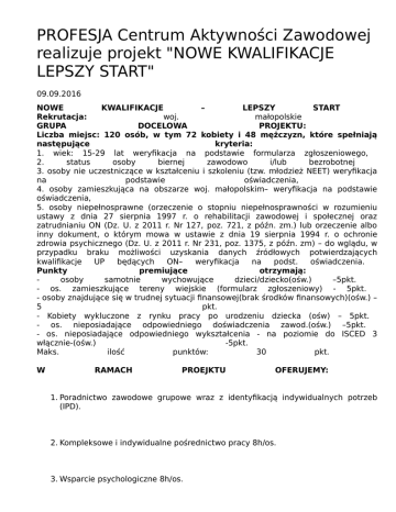 PROFESJA Centrum Aktywności Zawodowej realizuje projekt "NOWE KWALIFIKACJE LEPSZY START" 09.09.2016 NOWE KWALIFIKACJE – LEPSZY START Rekrutacja: woj. małopolskie GRUPA DOCELOWA PROJEKTU: Liczba miejsc: 120 osób, w tym 72 kobiety i 48 mężczyzn, które spełniają następujące kryteria: 1. wiek: 15-29 lat weryfikacja na podstawie formularza zgłoszeniowego, 2. status osoby biernej zawodowo i/lub bezrobotnej 3. osoby nie uczestniczące w kształceniu i szkoleniu (tzw. młodzież NEET) weryfikacja na podstawie oświadczenia, 4. osoby zamieszkująca na obszarze woj. małopolskim– weryfikacja na podstawie oświadczenia, 5. osoby niepełnosprawne (orzeczenie o stopniu niepełnosprawności w rozumieniu ustawy z dnia 27 sierpnia 1997 r. o rehabilitacji zawodowej i społecznej oraz zatrudnianiu ON (Dz. U. z 2011 r. Nr 127, poz. 721, z późn. zm.) lub orzeczenie albo inny dokument, o którym mowa w ustawie z dnia 19 sierpnia 1994 r. o ochronie zdrowia psychicznego (Dz. U. z 2011 r. Nr 231, poz. 1375, z późn. zm) – do wglądu, w przypadku braku możliwości uzyskania danych źródłowych potwierdzających kwalifikacje UP będących ON– weryfikacja na podst. oświadczenia. Punkty premiujące otrzymają: osoby samotnie wychowujące dzieci/dziecko(ośw.) –5pkt. - os. zamieszkujące tereny wiejskie (formularz zgłoszeniowy) - 5pkt. - osoby znajdujące się w trudnej sytuacji finansowej(brak środków finansowych)(ośw.) – 5 pkt. - Kobiety wykluczone z rynku pracy po urodzeniu dziecka (ośw) – 5pkt. - os. nieposiadające odpowiedniego doświadczenia zawod.(ośw.) –5pkt. - os. nieposiadające odpowiedniego wykształcenia - na poziomie do ISCED 3 włącznie-(ośw.) -5pkt. Maks. ilość punktów: 30 pkt. W RAMACH PROEJKTU OFERUJEMY: 1. Poradnictwo zawodowe grupowe wraz z identyfikacją indywidualnych potrzeb (IPD). 2. Kompleksowe i indywidualne pośrednictwo pracy 8h/os. 3. Wsparcie psychologiczne 8h/os. 4. Certyfikowane • • • • • • • • • * szkolenia zawodowe Asystent ds. księgowości Przedstawiciel handlowy Specjalista ds. transportu i logistyki Spawacz metodą Mag i Tig Kucharz Murarz-tynkarz Monter instalacji klimatyzacyjnych Stolarz I inne wg zapotrzebowania uczestnika. podczas szkoleń uczestnicy otrzymują stypendium szkoleniowe. 5. Praca metodą trenera zatrudnieniowego wspieranego (TZW). 6. Staże zawodowe Dla osób, które potrzebują takiego wsparcia, gwarantujemy opiekę osobistego asystenta. Biuro projektu mieści się w Tarnowie, natomiast wszystkie formy wsparcia będą organizowane w miejscu zebrania się grupy (min. 10 os.) w sali przystosowanej do potrzeb osób niepełnosprawnych. Formularze Zgłoszeniowe można składać osobiście na spotkaniach informacyjnych, pocztą, kurierem lub elektronicznie na adres: [email protected]