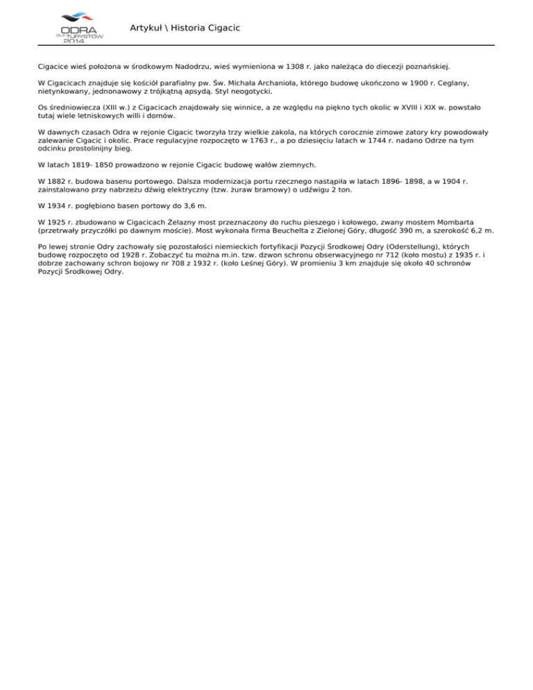 Artykuł \ Historia Cigacic Cigacice wieś położona w środkowym Nadodrzu, wieś wymieniona w 1308 r. jako należąca do diecezji poznańskiej. W Cigacicach znajduje się kościół parafialny pw. Św. Michała Archanioła, którego budowę ukończono w 1900 r. Ceglany, nietynkowany, jednonawowy z trójkątną apsydą. Styl neogotycki. Os średniowiecza (XIII w.) z Cigacicach znajdowały się winnice, a ze względu na piękno tych okolic w XVIII i XIX w. powstało tutaj wiele letniskowych willi i domów. W dawnych czasach Odra w rejonie Cigacic tworzyła trzy wielkie zakola, na których corocznie zimowe zatory kry powodowały zalewanie Cigacic i okolic. Prace regulacyjne rozpoczęto w 1763 r., a po dziesięciu latach w 1744 r. nadano Odrze na tym odcinku prostolinijny bieg. W latach 1819- 1850 prowadzono w rejonie Cigacic budowę wałów ziemnych. W 1882 r. budowa basenu portowego. Dalsza modernizacja portu rzecznego nastąpiła w latach 1896- 1898, a w 1904 r. zainstalowano przy nabrzeżu dźwig elektryczny (tzw. żuraw bramowy) o udźwigu 2 ton. W 1934 r. pogłębiono basen portowy do 3,6 m. W 1925 r. zbudowano w Cigacicach Żelazny most przeznaczony do ruchu pieszego i kołowego, zwany mostem Mombarta (przetrwały przyczółki po dawnym moście). Most wykonała firma Beuchelta z Zielonej Góry, długość 390 m, a szerokość 6,2 m. Po lewej stronie Odry zachowały się pozostałości niemieckich fortyfikacji Pozycji Środkowej Odry (Oderstellung), których budowę rozpoczęto od 1928 r. Zobaczyć tu można m.in. tzw. dzwon schronu obserwacyjnego nr 712 (koło mostu) z 1935 r. i dobrze zachowany schron bojowy nr 708 z 1932 r. (koło Leśnej Góry). W promieniu 3 km znajduje się około 40 schronów Pozycji Środkowej Odry. Powered by TCPDF (www.tcpdf.org)