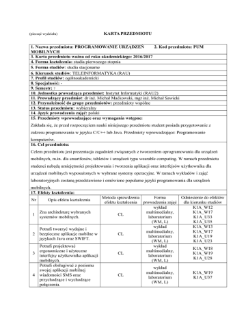 (pieczęć wydziału) KARTA PRZEDMIOTU 1. Nazwa przedmiotu: PROGRAMOWANIE URZĄDZEŃ 2. Kod przedmiotu: PUM MOBILNYCH 3. Karta przedmiotu ważna od roku akademickiego: 2016/2017 4. Forma kształcenia: studia pierwszego stopnia 5. Forma studiów: studia stacjonarne 6. Kierunek studiów: TELEINFORMATYKA (RAU) 7. Profil studiów: ogólnoakademicki 8. Specjalność: 9. Semestr: 7 10. Jednostka prowadząca przedmiot: Instytut Informatyki (RAU2) 11. Prowadzący przedmiot: dr inż. Michał Maćkowski, mgr inż. Michał Sawicki 12. Przynależność do grupy przedmiotów: przedmioty wspólne 13. Status przedmiotu: wybieralny 14. Język prowadzenia zajęć: polski 15. Przedmioty wprowadzające oraz wymagania wstępne: Zakłada się, że przed rozpoczęciem nauki niniejszego przedmiotu student posiada przygotowanie z zakresu programowania w języku C/C++ lub Java. Przedmioty wprowadzające: Programowanie komputerów. 16. Cel przedmiotu: Celem przedmiotu jest prezentacja zagadnień związanych z tworzeniem oprogramowania dla urządzeń mobilnych, m.in. dla smartfonów, tabletów i urządzeń typu wearable computing. W ramach przedmiotu studenci nabędą umiejętności projektowania i tworzenia aplikacji oraz interfejsów użytkownika dla urządzeń mobilnych wyposażonych w wybrane systemy operacyjne. W ramach wykładów i zajęć laboratoryjnych zostaną przedstawione i omówione popularne języki programowania dla urządzeń mobilnych. 17. Efekty kształcenia: Nr 1 2 3 4 Metoda sprawdzenia Forma Odniesienie do efektów efektu kształcenia prowadzenia zajęć dla kierunku studiów wykład K1A_W12 Zna architekturę wybranych multimedialny, K1A_W17 CL systemów mobilnych. laboratorium K1A_U33 (WM, L) K1A_U35 wykład K1A_W13 Potrafi tworzyć wydajne i multimedialny, K1A_W17 bezpieczne aplikacje mobilne w CL laboratorium K1A_U19 językach Java oraz SWIFT. (WM, L) K1A_U23 Potrafi projektować wykład K1A_W18 ergonomiczne i użyteczne multimedialny, CL K1A_W19 interfejsy użytkownika aplikacji laboratorium K1A_U28 mobilnych. (WM, L) Potrafi obsługiwać z poziomu wykład swojej aplikacji mobilnej multimedialny, K1A_W19 wiadomości SMS oraz CL laboratorium K1A_U37 przychodzące i wychodzące (WM, L) połączenia. Opis efektu kształcenia 5 Potrafi obsługiwać i wykorzystywać w swojej aplikacji mobilnej wybrane sensory i mechanizmy lokalizacji. 6 Potrafi tworzyć aplikacje mobilne z elementami grafiki 2D i 3D. CL 7 Potrafi przechowywać dane aplikacji mobilnej w wybranych mobilnych bazach danych. CL 8 Potrafi komunikować się za pośrednictwem interfejsów Bluetooth i NFC z poziomu swojej aplikacji mobilnej. CL CL wykład multimedialny, laboratorium (WM, L) wykład multimedialny, laboratorium (WM, L) wykład multimedialny, laboratorium (WM, L) wykład multimedialny, laboratorium (WM, L) K1A_U30 K1A_W19 K1A_U36 K1A_U37 K1A_W11 K1A_U23 K1A_W12 K1A_U28 K1A_U37 18. Formy zajęć dydaktycznych i ich wymiar (liczba godzin) W. 15 Ćw. L. 15 19. Treści kształcenia: P. - S. - Tematyka wykładów: 1. Architektura wybranych systemów mobilnych. 2. Projektowanie ergonomicznych i użytecznych interfejsów użytkownika w systemach mobilnych. 3. Elementy języka programowania SWIFT. 4. Obsługa wiadomości SMS/MMS oraz przychodzących i wychodzących połączeń. 5. Wykorzystanie mobilnych baz danych w aplikacjach. 6. Rozpoznawanie gestów w systemach mobilnych. 7. Grafika 2D i 3D w systemach mobilnych. 8. Obsługa sensorów oraz kamer, mechanizmy lokalizacji. 9. Projektowanie widgetów. 10. projektowanie aplikacji wieloplatformowych. 11. Wydajność i bezpieczeństwo aplikacji mobilnych. 12. Obsługa bezprzewodowych interfejsów komunikacyjnych Bluetooth i NFC w systemach mobilnych. Tematyka laboratorium: 1. Dedykowane środowiska programistyczne i uruchomieniowe – SDK dla systemów mobilnych. 2. Projektowanie interfejsów użytkownika aplikacji mobilnych. 3. Uruchamianie i testowanie (debugowanie) aplikacji w emulatorze i na urządzeniach mobilnych. 4. Grafika i multimedia w systemach mobilnych. 5. Projektowanie aplikacji wieloplatformowych. 6. Obsługa gestów w urządzeniach mobilnych. 7. Obsługa sensorów i mechanizmów lokalizacji w systemach mobilnych. 8. Wykorzystanie baz danych w systemach mobilnych. 9. Przesyłanie informacji przez interfejsy bezprzewodowe Bluetooth i NFC w systemach mobilnych. 20. Egzamin: nie 21. Literatura podstawowa: 1. A. Göransson: „Android. Aplikacje wielowątkowe. Techniki przetwarzania”, Helion 2015 2. J. Lehtimaki: „Android UI. Podręcznik dla projektantów”, Helion 2013 3. S. Chin, D. Iverson, O. Campesato, P. Trani: „Android Flash. Zaawansowane programowanie aplikacji mobilnych”, Helion 2012 4. H. Guihot: „Optymalizacja wydajności aplikacji na Android”, Helion 2013 5. V. Nahavandipoor: „iOS 8 Swift Programming Cookbook”, O'Reilly, 2014. 6. S. Derico: „Introducing iOS 8”, O'Reilly, 2014. 7. D. Mark, J. Nutting, K. Topley, F. Olsson, „Beginning iPhone Development with Swift”, Apress, 2014. 8. J. Bucanek: „Learn iOS 8 App Development”, Apress, 2014. 9. S. G. Kochan: „Objective-C. Vademecum profesjonalisty”, Helion, 2011 22. Literatura uzupełniająca: 23. Nakład pracy studenta potrzebny do osiągnięcia efektów kształcenia Lp. Forma zajęć 1 2 3 4 5 6 Liczba godzin kontaktowych / pracy studenta 15/15 / 15/15 / / / 30/30 Wykład Ćwiczenia Laboratorium Projekt Seminarium Inne Suma godzin 24. Suma wszystkich godzin: 60 25. Liczba punktów ECTS: 2 26. Liczba punktów ECTS uzyskanych na zajęciach z bezpośrednim udziałem nauczyciela akademickiego: 1 27. Liczba punktów ECTS uzyskanych na zajęciach o charakterze praktycznym (laboratoria, projekty): 1 26. Uwagi: ----- Zatwierdzono: ……………………………. (data i podpis prowadzącego) ………………………………………………… (data i podpis dyrektora instytutu)