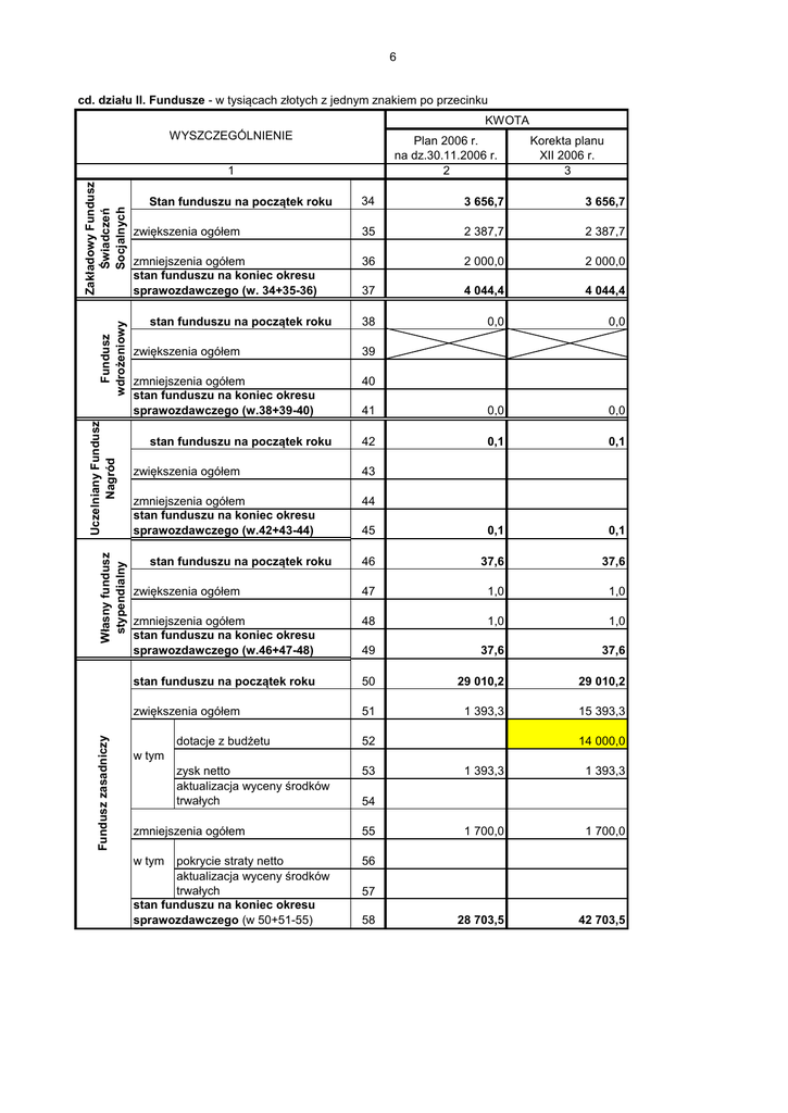 6 cd. działu II. Fundusze - w tysiącach złotych z jednym znakiem po przecinku KWOTA WYSZCZEGÓLNIENIE Plan 2006 r. na dz.30.11.2006 r. 2 Fundusz zasadniczy Własny fundusz stypendialny Uczelniany Fundusz Nagród Fundusz wdrożeniowy Zakładowy Fundusz Świadczeń Socjalnych 1 Korekta planu XII 2006 r. 3 34 3 656,7 3 656,7 zwiększenia ogółem 35 2 387,7 2 387,7 zmniejszenia ogółem stan funduszu na koniec okresu sprawozdawczego (w. 34+35-36) 36 2 000,0 2 000,0 37 4 044,4 4 044,4 38 0,0 0,0 41 0,0 0,0 42 0,1 0,1 45 0,1 0,1 46 37,6 37,6 zwiększenia ogółem 47 1,0 1,0 zmniejszenia ogółem stan funduszu na koniec okresu sprawozdawczego (w.46+47-48) 48 1,0 1,0 49 37,6 37,6 stan funduszu na początek roku 50 29 010,2 29 010,2 zwiększenia ogółem 51 1 393,3 15 393,3 Stan funduszu na początek roku stan funduszu na początek roku zwiększenia ogółem 39 zmniejszenia ogółem stan funduszu na koniec okresu sprawozdawczego (w.38+39-40) 40 stan funduszu na początek roku zwiększenia ogółem 43 zmniejszenia ogółem stan funduszu na koniec okresu sprawozdawczego (w.42+43-44) 44 stan funduszu na początek roku dotacje z budżetu 52 zysk netto aktualizacja wyceny środków trwałych 53 14 000,0 w tym 1 393,3 1 700,0 1 700,0 28 703,5 42 703,5 54 zmniejszenia ogółem 55 w tym 56 pokrycie straty netto aktualizacja wyceny środków trwałych stan funduszu na koniec okresu sprawozdawczego (w 50+51-55) 1 393,3 57 58