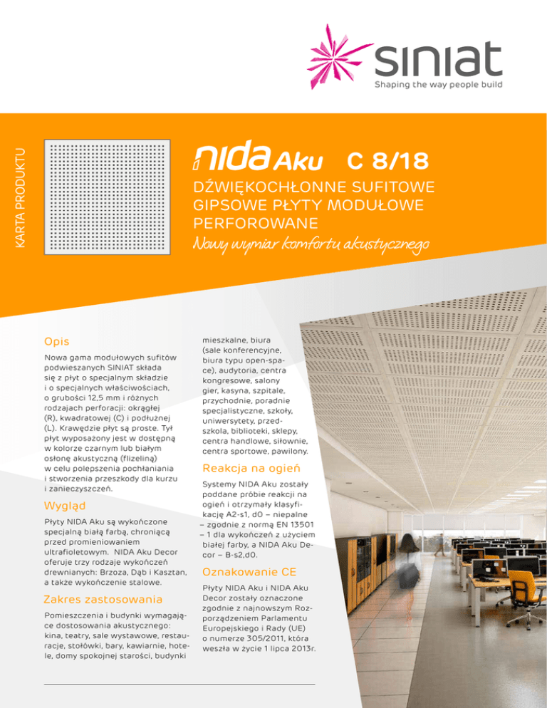 karta proDuktu C 8/18 Dźwiękochłonne sufitowe gipsowe płyty moDułowe perforowane Nowy wymiar komfortu akustycznego opis Nowa gama modułowych sufitów podwieszanych SINIAT składa się z płyt o specjalnym składzie i o specjalnych właściwościach, o grubości 12,5 mm i różnych rodzajach perforacji: okrągłej (R), kwadratowej (C) i podłużnej (L). Krawędzie płyt są proste. Tył płyt wyposażony jest w dostępną w kolorze czarnym lub białym osłonę akustyczną (flizeliną) w celu polepszenia pochłaniania i stworzenia przeszkody dla kurzu i zanieczyszczeń. wygląd Płyty NIDA Aku są wykończone specjalną białą farbą, chroniącą przed promieniowaniem ultrafioletowym. NIDA Aku Decor oferuje trzy rodzaje wykończeń drewnianych: Brzoza, Dąb i Kasztan, a także wykończenie stalowe. Zakres zastosowania Pomieszczenia i budynki wymagające dostosowania akustycznego: kina, teatry, sale wystawowe, restauracje, stołówki, bary, kawiarnie, hotele, domy spokojnej starości, budynki mieszkalne, biura (sale konferencyjne, biura typu open-space), audytoria, centra kongresowe, salony gier, kasyna, szpitale, przychodnie, poradnie specjalistyczne, szkoły, uniwersytety, przedszkola, biblioteki, sklepy, centra handlowe, siłownie, centra sportowe, pawilony. reakcja na ogień Systemy NIDA Aku zostały poddane próbie reakcji na ogień i otrzymały klasyfikację A2-s1, d0 – niepalne – zgodnie z normą EN 13501 – 1 dla wykończeń z użyciem białej farby, a NIDA Aku Decor – B-s2,d0. oznakowanie ce Płyty NIDA Aku i NIDA Aku Decor zostały oznaczone zgodnie z najnowszym Rozporządzeniem Parlamentu Europejskiego i Rady (UE) o numerze 305/2011, która weszła w życie 1 lipca 2013r. NIDA AKU, NIDA AKU DECOR - DŹWIĘKOCHŁONNE SUFITOWE GIPSOWE PŁYTY MODUŁOWE PERFOROWANE Wzór płyty Parametry akustyczne C 8/18 N1 Dane techniczne Wymiary płyt: Próba akustyczna Testy: A14-26053711/37 1,0 0,8 0,6 Krawędzie płyt: Krawędź prosta, T15 lub T24 Wykończenia: Kolor flizeliny: czarny/biały Kolor płyty: zależny od wzoru w = 0,65 L 0,4 NRC = 0,70 0,2 0 m = 0,65 125 250 500 1k 2k 4k Częstotliwość [Hz] 0,45 0,70 0,80 0,65 0,60 0,60 p % perforacji: 14,3 Reakcja na ogień: Próba akustyczna Testy: AC15-26055261-22a 1,0 0,8 0,6 w = 0,60 L 0,4 NRC = 0,65 0,2 m = 0,60 125 250 500 1k 2k 4k Częstotliwość [Hz] 0,46 0,70 0,74 0,60 0,54 0,47 p % perforacji: 12,2 Biały NIDA Aku A2-s1, d0 NIDA Aku Decor B-s2, d0 Waga w przybliżeniu: 9,8 kg/m2 Wzór perforacji: Typ perforacji: kwadratowa Wymiary: krawędzie 8 x 8 mm Odległość między otworami: 18,75 mm C 8/18 N3 0 (grubość x długość x szerokość) 12,5 x 600 x 600 mm % perforacji: zależny od wzoru Zgodność z normą PN-EN 14190:2005 Odporność na wilgoć w pomieszczeniach ≤ 70% Opór cieplny (wyrażony jako przewodność cieplna) 0,25 W (m.K) Stal Brzoza Dąb Kasztan Lazurowy niebieski Niebieski Piaskowy Jasnoszary Należy bezwzględnie przestrzegać zaleceń producenta płyt gipsowo-kartonowych SINIAT. Producent nie ponosi odpowiedzialności za skutki powstałe w wyniku użycia wyrobu niezgodnie z powyższymi zaleceniami oraz zasadami sztuki budowlanej. SINIAT SP. Z O.O. ul. Przecławska 8 03-879 Warszawa Info NIDA: 801 11 44 77 www.siniat.pl