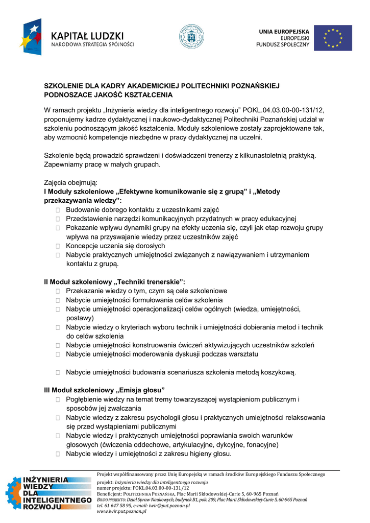 SZKOLENIE DLA KADRY AKADEMICKIEJ POLITECHNIKI POZNAŃSKIEJ PODNOSZACE JAKOŚĆ KSZTAŁCENIA W ramach projektu „Inżynieria wiedzy dla inteligentnego rozwoju” POKL.04.03.00-00-131/12, proponujemy kadrze dydaktycznej i naukowo-dydaktycznej Politechniki Poznańskiej udział w szkoleniu podnoszącym jakość kształcenia. Moduły szkoleniowe zostały zaprojektowane tak, aby wzmocnić kompetencje niezbędne w pracy dydaktycznej na uczelni. Szkolenie będą prowadzić sprawdzeni i doświadczeni trenerzy z kilkunastoletnią praktyką. Zapewniamy pracę w małych grupach. Zajęcia obejmują: I Moduły szkoleniowe „Efektywne komunikowanie się z grupą” i „Metody przekazywania wiedzy”: Budowanie dobrego kontaktu z uczestnikami zajęć Przedstawienie narzędzi komunikacyjnych przydatnych w pracy edukacyjnej Pokazanie wpływu dynamiki grupy na efekty uczenia się, czyli jak etap rozwoju grupy wpływa na przyswajanie wiedzy przez uczestników zajęć Koncepcje uczenia się dorosłych Nabycie praktycznych umiejętności związanych z nawiązywaniem i utrzymaniem kontaktu z grupą. II Moduł szkoleniowy „Techniki trenerskie”: Przekazanie wiedzy o tym, czym są cele szkoleniowe Nabycie umiejętności formułowania celów szkolenia Nabycie umiejętności operacjonalizacji celów ogólnych (wiedza, umiejętności, postawy) Nabycie wiedzy o kryteriach wyboru technik i umiejętności dobierania metod i technik do celów szkolenia Nabycie umiejętności konstruowania ćwiczeń aktywizujących uczestników szkoleń Nabycie umiejętności moderowania dyskusji podczas warsztatu Nabycie umiejętności budowania scenariusza szkolenia metodą koszykową. III Moduł szkoleniowy „Emisja głosu” Pogłębienie wiedzy na temat tremy towarzyszącej wystąpieniom publicznym i sposobów jej zwalczania Nabycie wiedzy z zakresu psychologii głosu i praktycznych umiejętności relaksowania się przed wystąpieniami publicznymi Nabycie wiedzy i praktycznych umiejętności poprawiania swoich warunków głosowych (ćwiczenia oddechowe, artykulacyjne, dykcyjne, fonacyjne) Nabycie wiedzy i umiejętności z zakresu higieny głosu. Projekt współfinansowany przez Unię Europejską w ramach środków Europejskiego Funduszu Społecznego projekt: Inżynieria wiedzy dla inteligentnego rozwoju numer projektu: POKL.04.03.00-00-131/12 Beneficjent: POLITECHNIKA POZNAŃSKA, Plac Marii Skłodowskiej-Curie 5, 60-965 Poznań BIURO PROJEKTU: Dział Spraw Naukowych, budynek B1, pok. 209, Plac Marii Skłodowskiej-Curie 5, 60-965 Poznań tel. 61 647 58 95, e-mail: [email protected] www.iwir.put.poznan.pl W ramach szkolenia uczestnicy otrzymują materiały w wersji drukowanej i elektronicznej, tutoring szkoleniowy oraz poczęstunek. Szkolenie zaplanowano w terminie 23-26 czerwca 2014 roku w Centrum Wykładowym PP (ul.Piotrowo 2). Uczestnicy szkolenia zobowiązani są do udziału we wszystkich modułach – zgodnie w Regulaminem. Zgodnie z decyzją Instytucji Pośredniczącej, uczestnikami szkolenia NIE MOGĄ BYĆ DOKTORANCI. Osoby zainteresowane prosimy o zapoznanie się ze szczegółowymi informacjami, regulaminem uczestnictwa oraz pobranie i wypełnienie dokumentów aplikacyjnych, dostępnych na stronie projektu: www.iwir.put.poznan.pl w zakładce: Szkolenia dla kadry akademickiej podnoszące jakość kształcenia finansowane z projektu Następnie, wypełnione dokumenty należy złożyć osobiście w Biurze Projektu „Inżynieria wiedzy dla inteligentnego rozwoju”, Politechnika Poznańska, Plac Marii Skłodowskiej-Curie 5, pokój 409, 60-965 Poznań lub za pośrednictwem operatora pocztowego. Rekrutacja i szczegółowe informacje: Biuro Projektu „Inżynieria wiedzy dla inteligentnego rozwoju” dr Ilona Długa - Specjalista ds.Rekrutacji i Promocji Politechnika Poznańska Plac Marii Skłodowskiej-Curie 5, pokój 409. 60-965 Poznań Telefon: 61 665-37-73 E-mail: [email protected] Od poniedziałku do czwartku w godz. 8.00-14.00 Projekt współfinansowany przez Unię Europejską w ramach środków Europejskiego Funduszu Społecznego projekt: Inżynieria wiedzy dla inteligentnego rozwoju numer projektu: POKL.04.03.00-00-131/12 Beneficjent: POLITECHNIKA POZNAŃSKA, Plac Marii Skłodowskiej-Curie 5, 60-965 Poznań BIURO PROJEKTU: Dział Spraw Naukowych, budynek B1, pok. 209, Plac Marii Skłodowskiej-Curie 5, 60-965 Poznań tel. 61 647 58 95, e-mail: [email protected] www.iwir.put.poznan.pl