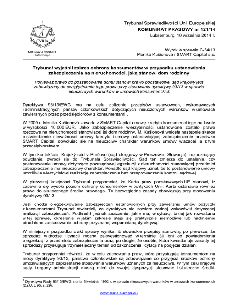 Trybunał Sprawiedliwości Unii Europejskiej KOMUNIKAT PRASOWY nr 121/14 Luksemburg, 10 września 2014 r. Kontakty z Mediami i Informacja Wyrok w sprawie C-34/13 Monika Kušionová / SMART Capital a.s. Trybunał wyjaśnił zakres ochrony konsumentów w przypadku ustanowienia zabezpieczenia na nieruchomości, jaką stanowi dom rodzinny Ponieważ prawo do poszanowania domu stanowi prawo podstawowe, sąd krajowy jest zobowiązany do uwzględnienia tego prawa przy stosowaniu dyrektywy 93/13 w sprawie nieuczciwych warunków w umowach konsumenckich Dyrektywa 93/13/EWG ma na celu zbliżenie przepisów ustawowych, wykonawczych i administracyjnych państw członkowskich dotyczących nieuczciwych warunków w umowach zawieranych przez przedsiębiorców z konsumentami1. W 2009 r. Monika Kušionová zawarła z SMART Capital umowę kredytu konsumenckiego na kwotę w wysokości 10 000 EUR. Jako zabezpieczenie wierzytelności ustanowione zostało prawo rzeczowe na nieruchomości stanowiącej jej dom rodzinny. M. Kušionová wniosła następnie skargę o stwierdzenie nieważności umowy kredytu i umowy ustanawiającej zabezpieczenie przeciwko SMART Capital, powołując się na nieuczciwy charakter warunków umowy wiążącej ją z tym przedsiębiorstwem. W tym kontekście, Krajský súd v Prešove (sąd okręgowy w Preszowie, Słowacja), rozpoznający odwołanie, zwrócił się do Trybunału Sprawiedliwości. Sąd ten zmierza do ustalenia, czy postanowienie umowy dotyczące pozasądowej egzekucji z nieruchomości stanowiącej przedmiot zabezpieczenia ma nieuczciwy charakter. Ponadto sąd krajowy uznał, że to postanowienie umowy umożliwia wierzycielowi realizację zabezpieczenia bez przeprowadzenia kontroli sądowej. W pierwszej kolejności Trybunał przypomniał, że Karta praw podstawowych UE stanowi, iż zapewnia się wysoki poziom ochrony konsumentów w politykach Unii. Karta ustanawia również prawo do skutecznego środka prawnego. Te bezwzględne zasady obowiązują przy stosowaniu dyrektywy 93/13. Jeśli chodzi o egzekwowanie zabezpieczeń ustanowionych przy zawieraniu umów pożyczki z konsumentami Trybunał stwierdził, że dyrektywa nie zawiera żadnej wskazówki dotyczącej realizacji zabezpieczeń. Podkreślił jednak znaczenie, jakie ma, w sytuacji takiej jak rozważana w tej sprawie, określenie w jakim zakresie staje się praktycznie niemożliwe lub nadmiernie utrudnione zastosowanie ochrony przyznanej wspomnianą dyrektywą. W niniejszym przypadku z akt sprawy wynika, iż słowackie przepisy stanowią, po pierwsze, że sprzedaż w drodze licytacji można zakwestionować w terminie 30 dni od powiadomienia o egzekucji z przedmiotu zabezpieczenia oraz, po drugie, że osobie, która kwestionuje zasady tej sprzedaży przysługuje trzymiesięczny termin od zakończenia licytacji na podjęcie działań. Trybunał przypomniał również, że w celu zachowania praw, które przysługują konsumentom na mocy dyrektywy 93/13, państwa członkowskie są zobowiązane do przyjęcia środków ochrony umożliwiających zaprzestanie stosowania warunków uznanych za nieuczciwe. W tym celu krajowe sądy i organy administracji muszą mieć do swojej dyspozycji stosowne i skuteczne środki. 1 Dyrektywa Rady 93/13/EWG z dnia 5 kwietnia 1993 r. w sprawie nieuczciwych warunków w umowach konsumenckich (Dz.U. L 95, s. 29). www.curia.europa.eu Zachowując swobodę wyboru sankcji za naruszenia prawa Unii, państwa członkowskie muszą czuwać w szczególności nad tym, by sankcje te były skuteczne, proporcjonalne i odstraszające. W odniesieniu do skutecznego i odstraszającego charakteru, w toku postępowania obejmującego pozasądową egzekucję z przedmiotu zabezpieczenia, właściwy sąd krajowy może podjąć wszelkie środki tymczasowe zakazujące dalszego prowadzenia takiej sprzedaży. W odniesieniu do proporcjonalnego charakteru sankcji, Trybunał podkreślił, że należy zwrócić szczególną uwagę na okoliczność, że przedmiotem zabezpieczenia w omawianej sprawie jest nieruchomość stanowiąca miejsce zamieszkania rodzinny konsumenta. W prawie Unii prawo do poszanowania domu jest prawem podstawowym zagwarantowanym w Karcie praw podstawowych, które sąd krajowy powinien uwzględnić przy stosowaniu dyrektywy 93/13. W niniejszym przypadku Trybunał uznał, że możliwość zastosowania przez właściwy sąd krajowy wszelkich środków tymczasowych wydaje się stanowić odpowiedni i skuteczny środek w celu zaprzestania stosowania nieuczciwych warunków, czego zbadanie należy do sądu krajowego. UWAGA: Odesłanie prejudycjalne pozwala sądom państw członkowskich, w ramach rozpatrywanego przez nie sporu, zwrócić się do Trybunału z pytaniem o wykładnię prawa Unii lub o ocenę ważności aktu Unii. Trybunał nie rozpoznaje sporu krajowego. Do sądu krajowego należy rozstrzygnięcie sprawy zgodnie z orzeczeniem Trybunału. Orzeczenie to wiąże w ten sam sposób inne sądy krajowe, które spotkają się z podobnym problemem. Dokument nieoficjalny, sporządzony na użytek mediów, który nie wiąże Trybunału Sprawiedliwości. Pełny tekst wyroku znajduje się na stronie internetowej CURIA w dniu ogłoszenia. Osoba odpowiedzialna za kontakty z mediami: Ireneusz Kolowca (+352) 4303 2793 www.curia.europa.eu