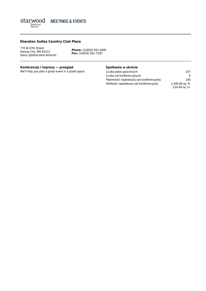 Sheraton Suites Country Club Plaza 770 W 47th Street Kansas City, MO 64112 Stany Zjednoczone Ameryki Phone: (1)(816) 931-4400 Fax: (1)(816) 561-7330 Konferencje i imprezy — przegląd Spotkania w skrócie We'll help you plan a great event in a great space. Liczba pokoi gościnnych: Liczba sal konferencyjnych: Pojemność największej sali konferencyjnej: Wielkość największej sali konferencyjnej 257 6 100 1,340.00 sq. ft. 124.49 sq. m. Sheraton Suites Country Club Plaza 770 W 47th Street Kansas City, MO 64112 Stany Zjednoczone Ameryki Phone: (1)(816) 931-4400 Fax: (1)(816) 561-7330 Specyfikacja szczegółowa Nieruchomości Typ obiektu Suburban Liczba sal konferencyjnych 6 Rok budowy 1991 Całkowita wielkość sal konferencyjnych 270.35 sq. m. 2,910.02 sq. ft. Liczba budynków 1 Wielkość największej sali konferencyjnej 124.49 sq. m. 1,340.00 sq. ft. Liczba pięter 18 Pojemność największej sali konferencyjnej 100 Pojemność najmniejszej sali konferencyjnej 29.73 sq. m. Pojemność najmniejszej sali konferencyjnej 15 320.01 sq. ft. Pokoje gościnne Data zameldowania 3:00 PM Internet w pokoju Wireless High Speed Internet Access in All Guest Rooms Data wymeldowania 12:00 PM Liczba pokoi gościnnych 257 Udogodnienia Centrum odnowy biologicznej / Centrum Fitness Sheraton Fitness Nazwa basenu Outdoor Pool (Seasonal) Indoor Whirlpool Indoor Heated Pool Basen Yes Lokalne & atrakcje Strefa czasowa C Pobliskie lotniska Kansas City International Airport Kod lotniska MCI Odległość od lotniska 28.97 Kilometers 18.00 Miles Obszar lokalny Leave time to explore the sites! Transport & parkowanie Opłaty za parkowanie Minimum Fee:16.0,Maximum Fee:20.0 Opłaty & podatki Waluta lokalna United States Dollars Kod waluty USD Opłaty za parkowanie przez obsługę 20.00 Metody płatności • DISCOVER NETWORK • CARTE BLANCHE • DINERS/SUNDIN/AMOCO • JAPAN CREDIT BUREAU • AMEX / OPTIMA • MASTER CARD • VISA Sheraton Suites Country Club Plaza 770 W 47th Street Kansas City, MO 64112 Stany Zjednoczone Ameryki Phone: (1)(816) 931-4400 Fax: (1)(816) 561-7330 Email: Capacity Charts Room Name Key Dim. (l x w) Area Height Banq. Thtr. Conference Center - 12.80 m. x 9.45 m.41.99 ft. x 31.00 ft. 124.49 sq. m. 1,340.00 sq. ft. 3.05 m. 10.01 ft. 90 100 Conference Center Salon I - 6.40 m. x 9.45 m.21.00 ft. x 31.00 ft. 62.24 sq. m. 669.95 sq. ft. 3.05 m. 10.01 ft. 50 50 Conference Center Salon II - 6.40 m. x 9.45 m.21.00 ft. x 31.00 ft. 62.24 sq. m. 669.95 sq. ft. 3.05 m. 10.01 ft. 50 50 Meeting Rooms 304 or 308 - 9.45 m. x 4.57 m.31.00 ft. x 14.99 ft. 43.20 sq. m. 465.00 sq. ft. 2.44 m. 8.01 ft. 30 20 Meeting Rooms 307 or 309 - 4.57 m. x 6.40 m.14.99 ft. x 21.00 ft. 29.73 sq. m. 320.01 sq. ft. 2.44 m. 8.01 ft. 20 15 Room Name Conf. Rec. Class U-Shp. H. Sq. Dinner Dance Meeting Rooms 307 or 309 50 100 75 50 - - Meeting Rooms 307 or 309 25 50 35 25 - - Meeting Rooms 307 or 309 25 50 35 25 - - Meeting Rooms 307 or 309 20 30 15 - - - Meeting Rooms 307 or 309 15 20 - - - -