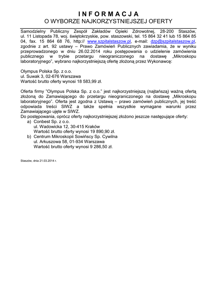 INFORMACJA O WYBORZE NAJKORZYSTNIEJSZEJ OFERTY Samodzielny Publiczny Zespół Zakładów Opieki Zdrowotnej, 28-200 Staszów, ul. 11 Listopada 78, woj. świętokrzyskie, pow. staszowski, tel. 15 864 32 41 lub 15 864 85 04, fax. 15 864 68 76, http:// www.szpitalstaszow.pl, e-mail: [email protected], zgodnie z art. 92 ustawy – Prawo Zamówień Publicznych zawiadamia, Ŝe w wyniku przeprowadzonego w dniu 26.02.2014 roku postępowania o udzielenie zamówienia publicznego w trybie przetargu nieograniczonego na dostawę „Mikroskopu laboratoryjnego”, wybrano najkorzystniejszą ofertę złoŜoną przez Wykonawcę: Olympus Polska Sp. z o.o. ul. Suwak 3, 02-676 Warszawa Wartość brutto oferty wynosi 18 583,99 zł. Oferta firmy ”Olympus Polska Sp. z o.o.” jest najkorzystniejszą (najtańszą) waŜną ofertą złoŜoną do Zamawiającego do przetargu nieograniczonego na dostawę „Mikroskopu laboratoryjnego”. Oferta jest zgodna z Ustawą – prawo zamówień publicznych, jej treść odpowiada treści SIWZ a takŜe spełnia wszystkie wymagane warunki przez Zamawiającego ujęte w SIWZ. Do postępowania, oprócz oferty najkorzystniejszej złoŜono jeszcze następujące oferty: a) Conbest Sp. z o.o. ul. Wadowicka 12, 30-415 Kraków Wartość brutto oferty wynosi 19 890,90 zł. b) Centrum Mikroskopii Sowińscy Sp. Cywilna ul. Arkuszowa 58, 01-934 Warszawa Wartość brutto oferty wynosi 9 286,50 zł. Staszów, dnia 21.03.2014 r.