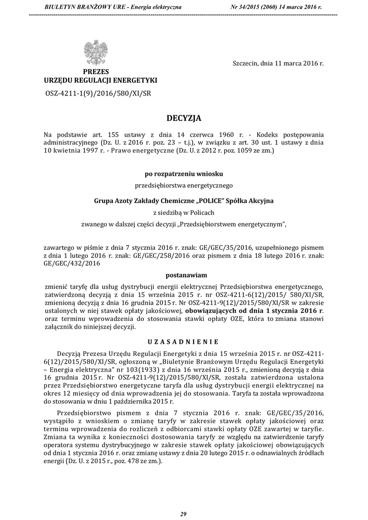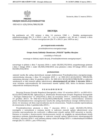 BIULETYN BRANŻOWY URE - Energia elektryczna Nr 34/2015 (2060) 14 marca 2016 r. ------------------------------------------------------------------------------------------------------------------------------------------------------ Szczecin, dnia 11 marca 2016 r. PREZES URZĘDU REGULACJI ENERGETYKI OSZ-4211-1(9)/2016/580/XI/SR DECYZJA Na podstawie art. 155 ustawy z dnia 14 czerwca 1960 r. - Kodeks postępowania administracyjnego (Dz. U. z 2016 r. poz. 23 – t.j.), w związku z art. 30 ust. 1 ustawy z dnia 10 kwietnia 1997 r. - Prawo energetyczne (Dz. U. z 2012 r. poz. 1059 ze zm.) po rozpatrzeniu wniosku przedsiębiorstwa energetycznego Grupa Azoty Zakłady Chemiczne „POLICE” Spółka Akcyjna z siedzibą w Policach zwanego w dalszej części decyzji „Przedsiębiorstwem energetycznym”, zawartego w piśmie z dnia 7 stycznia 2016 r. znak: GE/GEC/35/2016, uzupełnionego pismem z dnia 1 lutego 2016 r. znak: GE/GEC/258/2016 oraz pismem z dnia 18 lutego 2016 r. znak: GE/GEC/432/2016 postanawiam zmienić taryfę dla usług dystrybucji energii elektrycznej Przedsiębiorstwa energetycznego, zatwierdzoną decyzją z dnia 15 września 2015 r. nr OSZ-4211-6(12)/2015/ 580/XI/SR, zmienioną decyzją z dnia 16 grudnia 2015 r. Nr OSZ-4211-9(12)/2015/580/XI/SR w zakresie ustalonych w niej stawek opłaty jakościowej, obowiązujących od dnia 1 stycznia 2016 r. oraz terminu wprowadzenia do stosowania stawki opłaty OZE, która to zmiana stanowi załącznik do niniejszej decyzji. UZASADNIENIE Decyzją Prezesa Urzędu Regulacji Energetyki z dnia 15 września 2015 r. nr OSZ-42116(12)/2015/580/XI/SR, ogłoszoną w „Biuletynie Branżowym Urzędu Regulacji Energetyki – Energia elektryczna” nr 103(1933) z dnia 16 września 2015 r., zmienioną decyzją z dnia 16 grudnia 2015 r. Nr OSZ-4211-9(12)/2015/580/XI/SR, została zatwierdzona ustalona przez Przedsiębiorstwo energetyczne taryfa dla usług dystrybucji energii elektrycznej na okres 12 miesięcy od dnia wprowadzenia jej do stosowania. Taryfa ta została wprowadzona do stosowania w dniu 1 października 2015 r. Przedsiębiorstwo pismem z dnia 7 stycznia 2016 r. znak: GE/GEC/35/2016, wystąpiło z wnioskiem o zmianę taryfy w zakresie stawek opłaty jakościowej oraz terminu wprowadzenia do rozliczeń z odbiorcami stawki opłaty OZE zawartej w taryfie. Zmiana ta wynika z konieczności dostosowania taryfy ze względu na zatwierdzenie taryfy operatora systemu dystrybucyjnego w zakresie stawek opłaty jakościowej obowiązujących od dnia 1 stycznia 2016 r. oraz zmianę ustawy z dnia 20 lutego 2015 r. o odnawialnych źródłach energii (Dz. U. z 2015 r., poz. 478 ze zm.). 29 BIULETYN BRANŻOWY URE - Energia elektryczna Nr 34/2015 (2060) 14 marca 2016 r. ------------------------------------------------------------------------------------------------------------------------------------------------------ Zgodnie z art. 155 Kodeksu postępowania administracyjnego, decyzja ostateczna, na mocy której strona nabyła prawo, może być w każdym czasie za zgodą strony uchylona lub zmieniona przez organ administracji publicznej, który ją wydał, jeżeli przepisy szczególne nie sprzeciwiają się uchyleniu lub zmianie takiej decyzji i przemawia za tym interes społeczny lub słuszny interes strony. W odniesieniu do przedmiotowej sprawy uznano, że zostały spełnione przesłanki określone w powyższym przepisie, umożliwiające zmianę decyzji o zatwierdzeniu taryfy. W tym stanie rzeczy postanowiłem orzec, jak w sentencji. POUCZENIE 1. Od niniejszej decyzji przysługuje odwołanie do Sądu Okręgowego w Warszawie – Sądu Ochrony Konkurencji i Konsumentów - za pośrednictwem Prezesa URE, w terminie dwutygodniowym od dnia jej doręczenia (art. 30 ust. 2 i 3 ustawy z dnia 10 kwietnia 1997 r. - Prawo energetyczne, oraz art. 479 46 pkt 1 i art. 47947 § 1 Kodeksu postępowania cywilnego). 2. Odwołanie od decyzji powinno czynić zadość wymaganiom przepisanym dla pisma procesowego oraz zawierać oznaczenie zaskarżonej decyzji i wartości przedmiotu sporu, przytoczenie zarzutów, zwięzłe ich uzasadnienie, wskazanie dowodów, a także zawierać wniosek o uchylenie albo zmianę decyzji – w całości lub części (art. 47949 Kodeksu postępowania cywilnego). Odwołanie należy przesłać na adres Północno-Zachodniego Oddziału Terenowego Urzędu Regulacji Energetyki z siedzibą w Szczecinie - ul. Żubrów 3, 71-617 Szczecin. 3. Stosownie do art. 47 ust. 3 pkt 1 w związku z art. 31 ust. 3 pkt 2 ustawy – Prawo energetyczne, niniejsza decyzja zostanie skierowana do ogłoszenia w „Biuletynie Branżowym Urzędu Regulacji Energetyki – Energia elektryczna”. Z upoważnienia Prezesa Urzędu Regulacji Energetyki DYREKTOR Północno – Zachodniego Oddziału Terenowego Urzędu Regulacji Energetyki z siedzibą w Szczecinie /-/ Anna Bródka Niniejsza decyzja zwolniona jest z opłaty skarbowej na podstawie art. 4 ustawy z dnia 16 listopada 2006 r. o opłacie skarbowej (t.j. - Dz. U. z 2015 r., poz. 783 ze zm.) Sylwia Rosińska – starszy inspektor Otrzymuje: 1. Grupa Azoty Zakłady Chemiczne „Police” S.A. ul. Kuźnicka 1 72-010 Police 2. a/a 2 30 BIULETYN BRANŻOWY URE - Energia elektryczna Nr 34/2015 (2060) 14 marca 2016 r. ------------------------------------------------------------------------------------------------------------------------------------------------------ 31 BIULETYN BRANŻOWY URE - Energia elektryczna Nr 34/2015 (2060) 14 marca 2016 r. ------------------------------------------------------------------------------------------------------------------------------------------------------ 32