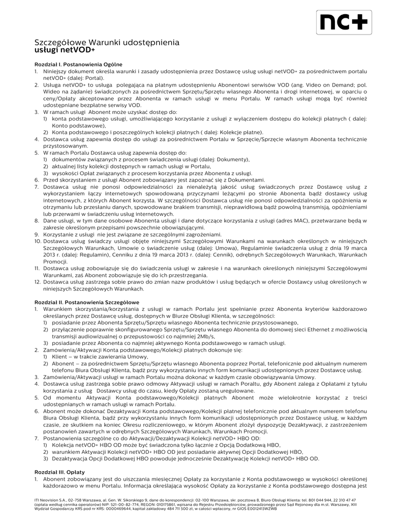 Szczegółowe Warunki udostępnienia usługi netVOD+ Rozdział I. Postanowienia Ogólne 1. Niniejszy dokument określa warunki i zasady udostępnienia przez Dostawcę usług usługi netVOD+ za pośrednictwem portalu netVOD+ (dalej: Portal). 2. Usługa netVOD+ to usługa polegająca na płatnym udostępnieniu Abonentowi serwisów VOD (ang. Video on Demand; pol. Wideo na żądanie) świadczonych za pośrednictwem Sprzętu/Sprzętu własnego Abonenta i drogi internetowej, w oparciu o ceny/Opłaty akceptowane przez Abonenta w ramach usługi w menu Portalu. W ramach usługi mogą być również udostępniane bezpłatne serwisy VOD. 3. W ramach usługi Abonent może uzyskać dostęp do: 1) konta podstawowego usługi, umożliwiającego korzystanie z usługi z wyłączeniem dostępu do kolekcji płatnych ( dalej: Konto podstawowe), 2) Konta podstawowego i poszczególnych kolekcji płatnych ( dalej: Kolekcje płatne). 4. Dostawca usług zapewnia dostęp do usługi za pośrednictwem Portalu w Sprzęcie/Sprzęcie własnym Abonenta technicznie przystosowanym. 5. W ramach Portalu Dostawca usług zapewnia dostęp do: 1) dokumentów związanych z procesem świadczenia usługi (dalej: Dokumenty), 2) aktualnej listy kolekcji dostępnych w ramach usługi w Portalu, 3) wysokości Opłat związanych z procesem korzystania przez Abonenta z usługi. 6. Przed skorzystaniem z usługi Abonent zobowiązany jest zapoznać się z Dokumentami. 7. Dostawca usług nie ponosi odpowiedzialności za nienależytą jakość usług świadczonych przez Dostawcę usług z wykorzystaniem łączy internetowych spowodowaną przyczynami leżącymi po stronie Abonenta bądź dostawcy usług internetowych, z których Abonent korzysta. W szczególności Dostawca usług nie ponosi odpowiedzialności za opóźnienia w otrzymaniu lub przesłaniu danych, spowodowane brakiem transmisji, nieprawidłową bądź powolną transmisją, opóźnieniami lub przerwami w świadczeniu usług internetowych. 8. Dane usługi, w tym dane osobowe Abonenta usługi i dane dotyczące korzystania z usługi (adres MAC), przetwarzane będą w zakresie określonym przepisami powszechnie obowiązującymi. 9. Korzystanie z usługi nie jest związane ze szczególnymi zagrożeniami. 10. Dostawca usług świadczy usługi objęte niniejszymi Szczegółowymi Warunkami na warunkach określonych w niniejszych Szczegółowych Warunkach, Umowie o świadczenie usług (dalej: Umowa), Regulaminie świadczenia usług z dnia 19 marca 2013 r. (dalej: Regulamin), Cenniku z dnia 19 marca 2013 r. (dalej: Cennik), odrębnych Szczegółowych Warunkach, Warunkach Promocji. 11. Dostawca usług zobowiązuje się do świadczenia usługi w zakresie i na warunkach określonych niniejszymi Szczegółowymi Warunkami, zaś Abonent zobowiązuje się do ich przestrzegania. 12. Dostawca usług zastrzega sobie prawo do zmian nazw produktów i usług będących w ofercie Dostawcy usług określonych w niniejszych Szczegółowych Warunkach. Rozdział II. Postanowienia Szczegółowe 1. Warunkiem skorzystania/korzystania z usługi w ramach Portalu jest spełnianie przez Abonenta kryteriów każdorazowo określanych przez Dostawcę usług, dostępnych w Biurze Obsługi Klienta, w szczególności: 1) posiadanie przez Abonenta Sprzętu/Sprzętu własnego Abonenta technicznie przystosowanego, 2) przyłączenie poprawnie skonfigurowanego Sprzętu/Sprzętu własnego Abonenta do domowej sieci Ethernet z możliwością transmisji audiowizualnej o przepustowości co najmniej 2Mb/s, 3) posiadanie przez Abonenta co najmniej aktywnego Konta podstawowego w ramach usługi. 2. Zamówienia/Aktywacji Konta podstawowego/Kolekcji płatnych dokonuje się: 1) Klient – w trakcie zawierania Umowy, 2) Abonent – za pośrednictwem Sprzętu/Sprzętu własnego Abonenta poprzez Portal, telefonicznie pod aktualnym numerem telefonu Biura Obsługi Klienta, bądź przy wykorzystaniu innych form komunikacji udostępnionych przez Dostawcę usług. 3. Zamówienia/Aktywacji usługi w ramach Portalu można dokonać w każdym czasie obowiązywania Umowy. 4. Dostawca usług zastrzega sobie prawo odmowy Aktywacji usługi w ramach Poraltu, gdy Abonent zalega z Opłatami z tytułu korzystania z usług Dostawcy usług do czasu, kiedy Opłaty zostaną uregulowane. 5. Od momentu Aktywacji Konta podstawowego/Kolekcji płatnych Abonent może wielokrotnie korzystać z treści udostępnianych w ramach usługi w ramach Portalu. 6. Abonent może dokonać Dezaktywacji Konta podstawowego/Kolekcji płatnej telefonicznie pod aktualnym numerem telefonu Biura Obsługi Klienta, bądź przy wykorzystaniu innych form komunikacji udostępnionych przez Dostawcę usług, w każdym czasie, ze skutkiem na koniec Okresu rozliczeniowego, w którym Abonent złożył dyspozycję Dezaktywacji, z zastrzeżeniem postanowień zawartych w odrębnych Szczegółowych Warunkach, Warunkach Promocji. 7. Postanowienia szczególne co do Aktywacji/Dezaktywacji Kolekcji netVOD+ HBO OD: 1) Kolekcja netVOD+ HBO OD może być świadczona tylko łącznie z Opcją Dodatkową HBO, 2) warunkiem Aktywacji Kolekcji netVOD+ HBO OD jest posiadanie aktywnej Opcji Dodatkowej HBO, 3) Dezaktywacja Opcji Dodatkowej HBO powoduje jednocześnie Dezaktywację Kolekcji netVOD+ HBO OD. Rozdział III. Opłaty 1. Abonent zobowiązany jest do uiszczania miesięcznej Opłaty za korzystanie z Konta podstawowego w wysokości określonej każdorazowo w menu Portalu. Informacja określająca wysokość Opłaty za korzystanie z Konta podstawowego dostępna jest ITI Neovision S.A., 02-758 Warszawa, al. Gen. W. Sikorskiego 9, dane do korespondencji: 02-100 Warszawa, skr. pocztowa 8, Biuro Obsługi Klienta: tel. 801 044 944, 22 310 47 47 (opłata według cennika operatorów) NIP: 521-00-82-774, REGON: 010175861, wpisana do Rejestru Przedsiębiorców, prowadzonego przez Sąd Rejonowy dla m.st. Warszawy, XIII Wydział Gospodarczy KRS pod nr KRS: 0000469644, kapitał zakładowy 484 711 500 zł, w całości wpłac