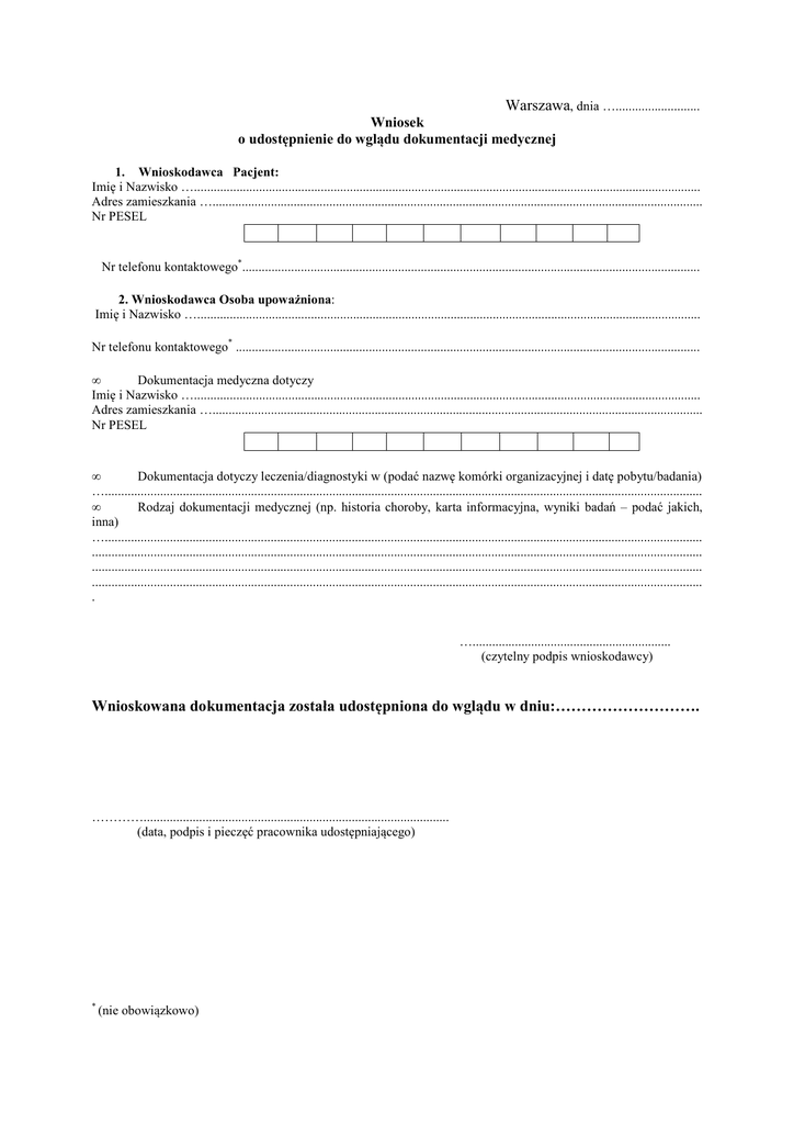 Warszawa, dnia ….......................... Wniosek o udostępnienie do wglądu dokumentacji medycznej 1. Wnioskodawca Pacjent: Imię i Nazwisko …............................................................................................................................................................ Adres zamieszkania …....................................................................................................................................................... Nr PESEL Nr telefonu kontaktowego*............................................................................................................................................. 2. Wnioskodawca Osoba upoważniona: Imię i Nazwisko …........................................................................................................................................................... Nr telefonu kontaktowego* ............................................................................................................................................... • Dokumentacja medyczna dotyczy Imię i Nazwisko …............................................................................................................................................................ Adres zamieszkania …....................................................................................................................................................... Nr PESEL • Dokumentacja dotyczy leczenia/diagnostyki w (podać nazwę komórki organizacyjnej i datę pobytu/badania) …........................................................................................................................................................................................ • Rodzaj dokumentacji medycznej (np. historia choroby, karta informacyjna, wyniki badań – podać jakich, inna) …........................................................................................................................................................................................ ............................................................................................................................................................................................ ............................................................................................................................................................................................ ............................................................................................................................................................................................ . …............................................................. (czytelny podpis wnioskodawcy) Wnioskowana dokumentacja została udostępniona do wglądu w dniu:………………………. ………….............................................................................................. (data, podpis i pieczęć pracownika udostępniającego) * (nie obowiązkowo)