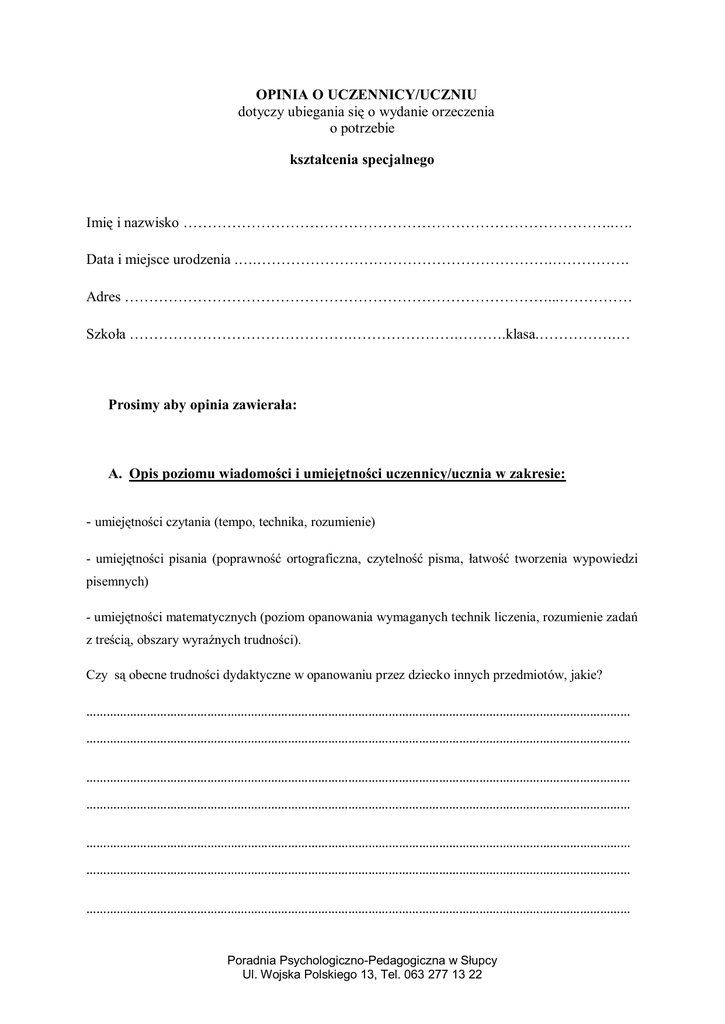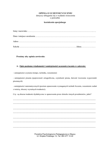 OPINIA O UCZENNICY/UCZNIU dotyczy ubiegania się o wydanie orzeczenia o potrzebie kształcenia specjalnego Imię i nazwisko ……………………………………………………………………………..…. Data i miejsce urodzenia .….…………………………………………………….……………. Adres ……………………………………………………………………………...…………… Szkoła ……………………………………….………………….……….klasa.…………….… Prosimy aby opinia zawierała: A. Opis poziomu wiadomości i umiejętności uczennicy/ucznia w zakresie: - umiejętności czytania (tempo, technika, rozumienie) - umiejętności pisania (poprawność ortograficzna, czytelność pisma, łatwość tworzenia wypowiedzi pisemnych) - umiejętności matematycznych (poziom opanowania wymaganych technik liczenia, rozumienie zadań z treścią, obszary wyraźnych trudności). Czy są obecne trudności dydaktyczne w opanowaniu przez dziecko innych przedmiotów, jakie? ……………………………………………………………………………………………………………………………………………… ……………………………………………………………………………………………………………………………………………… ……………………………………………………………………………………………………………………………………………… ……………………………………………………………………………………………………………………………………………… ……………………………………………………………………………………………………………………………………………… ……………………………………………………………………………………………………………………………………………… ……………………………………………………………………………………………………………………………………………… Poradnia Psychologiczno-Pedagogiczna w Słupcy Ul. Wojska Polskiego 13, Tel. 063 277 13 22 B. Opis zachowań dziecka: - obserwowanych podczas prowadzenia pracy dydaktyczno-wychowawczej z uczennicą/uczniem, - związanych z wpływem choroby na posiadane przez nie umiejętności współdziałania z rówieśnikami, - innych, mogących wywierać wpływ na odniesienie sukcesu edukacyjnego. ……………………………………………………………………………………………………………………………………………… ……………………………………………………………………………………………………………………………………………… ……………………………………………………………………………………………………………………………………………… ……………………………………………………………………………………………………………………………………………… …………………………………………………………………………………………………………………………………………….. ………………………………………………………………………………………………… C. Wnioski na temat wsparcia udzielanego dziecku przez rodziców w zakresie: - wywiązywania się z nauki, wychowywania i współpracy z nauczycielami prowadzącymi ucznia . ……………………………………………………………………………………………………………………………………………… ……………………………………………………………………………………………………………………………………………… ……………………………………………………………………………………………………………………………………………… ……………………………………………………………………………………………………………………………………………… ………………………………………………………………………………………………….. ……………………………………………………………………………….. Pieczęć szkoły, podpis dyrektora i osoby sporządzającej opinię Poradnia Psychologiczno-Pedagogiczna w Słupcy Ul. Wojska Polskiego 13, Tel. 063 277 13 22