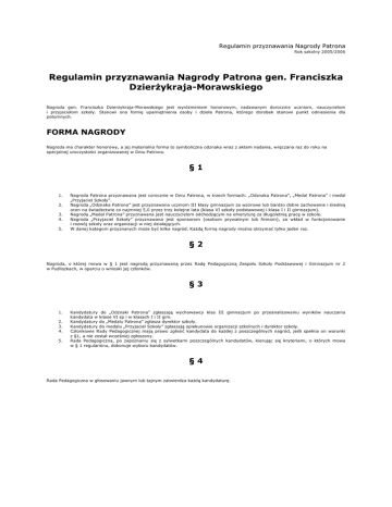 Regulamin przyznawania Nagrody Patrona Rok szkolny 2005/2006 Regulamin przyznawania Nagrody Patrona gen. Franciszka Dzierżykraja-Morawskiego Nagroda gen. Franciszka Dzierżykraja-Morawskiego jest wyróżnieniem honorowym, nadawanym dorocznie uczniom, nauczycielom i przyjaciołom szkoły. Stanowi ona formę upamiętnienia osoby i dzieła Patrona, którego dorobek stanowi punkt odniesienia dla potomnych. FORMA NAGRODY Nagroda ma charakter honorowy, a jej materialna forma to symboliczna odznaka wraz z aktem nadania, wręczana raz do roku na specjalnej uroczystości organizowanej w Dniu Patrona. §1 1. 2. 3. 4. 5. Nagroda Patrona przyznawana jest corocznie w Dniu Patrona, w trzech formach: „Odznaka Patrona”, „Medal Patrona” i medal „Przyjaciel Szkoły”. Nagroda „Odznaka Patrona” jest przyznawana uczniom III klasy gimnazjum za wzorowe lub bardzo dobre zachowanie i średnią ocen na świadectwie co najmniej 5,0 przez trzy kolejne lata (klasa VI szkoły podstawowej i klasa I i II gimnazjum). Nagroda „Medal Patrona” przyznawana jest nauczycielom odchodzącym na emeryturę za długoletnią pracę w szkole. Nagroda „Przyjaciel Szkoły” przyznawana jest sponsorom (osobom prywatnym lub firmom), za wkład w funkcjonowanie i rozwój szkoły oraz organizacji w niej działających. W danej kategorii przyznanych może być kilka nagród. Każdą formę nagrody można otrzymać tylko jeden raz. §2 Nagroda, o której mowa w § 1 jest nagrodą przyznawaną przez Radę Pedagogiczną Zespołu Szkoły Podstawowej i Gimnazjum nr 2 w Pudliszkach, w oparciu o wnioski jej członków. §3 1. 2. 3. 4. 5. Kandydatury do „Odznaki Patrona” zgłaszają wychowawcy klas III gimnazjum po przeanalizowaniu wyników nauczania kandydata w klasie VI sp i w klasach I i II gim. Kandydatury do „Medalu Patrona” zgłasza dyrektor szkoły. Kandydatury do medalu „Przyjaciel Szkoły” zgłaszają opiekunowie organizacji szkolnych i dyrektor szkoły. Członkowie Rady Pedagogicznej mają prawo zgłosić kandydata do każdej z poszczególnych nagród, jeśli spełnia on warunki z §1, a nie został wcześniej zgłoszony. Rada Pedagogiczna, po zapoznaniu się z sylwetkami poszczególnych kandydatów, kierując się kryteriami, o których mowa w § 1 regulaminu, dokonuje wyboru kandydatów. §4 Rada Pedagogiczna w głosowaniu jawnym lub tajnym zatwierdza każdą kandydaturę.