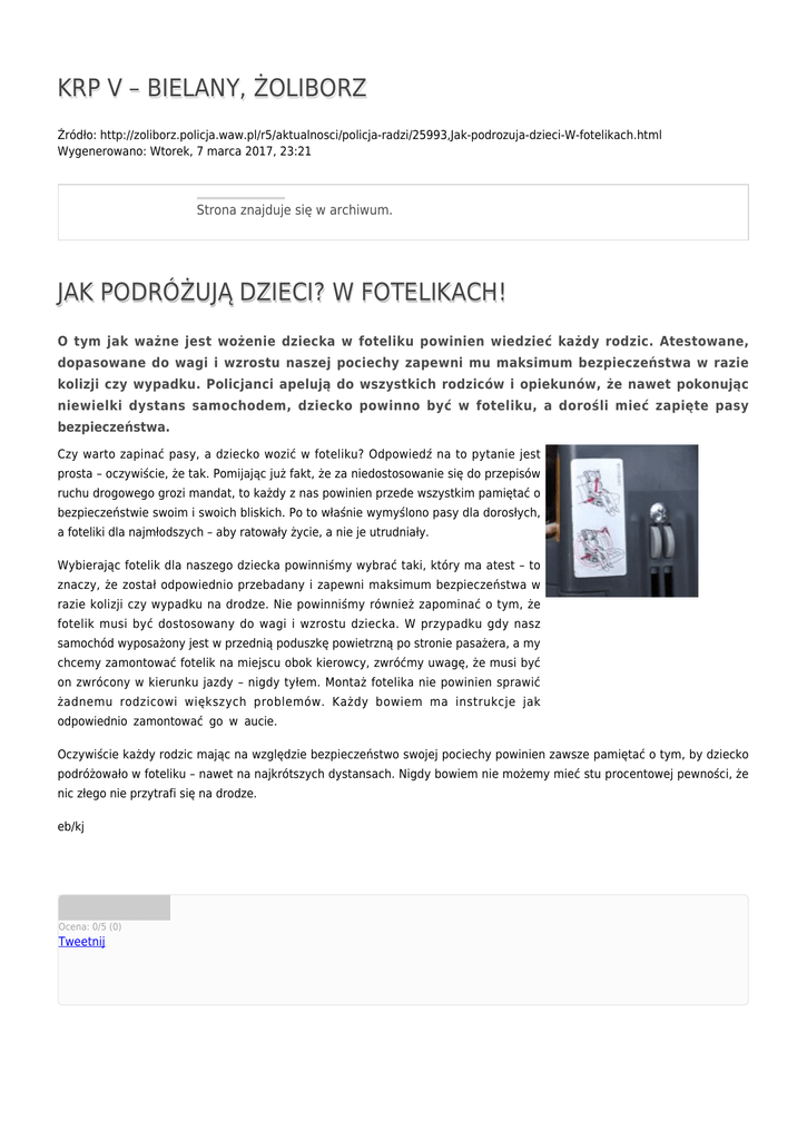 KRP V – BIELANY, ŻOLIBORZ Źródło: http://zoliborz.policja.waw.pl/r5/aktualnosci/policja-radzi/25993,Jak-podrozuja-dzieci-W-fotelikach.html Wygenerowano: Wtorek, 7 marca 2017, 23:21 Strona znajduje się w archiwum. JAK PODRÓŻUJĄ DZIECI? W FOTELIKACH! O tym jak ważne jest wożenie dziecka w foteliku powinien wiedzieć każdy rodzic. Atestowane, dopasowane do wagi i wzrostu naszej pociechy zapewni mu maksimum bezpieczeństwa w razie kolizji czy wypadku. Policjanci apelują do wszystkich rodziców i opiekunów, że nawet pokonując niewielki dystans samochodem, dziecko powinno być w foteliku, a dorośli mieć zapięte pasy bezpieczeństwa. Czy warto zapinać pasy, a dziecko wozić w foteliku? Odpowiedź na to pytanie jest prosta – oczywiście, że tak. Pomijając już fakt, że za niedostosowanie się do przepisów ruchu drogowego grozi mandat, to każdy z nas powinien przede wszystkim pamiętać o bezpieczeństwie swoim i swoich bliskich. Po to właśnie wymyślono pasy dla dorosłych, a foteliki dla najmłodszych – aby ratowały życie, a nie je utrudniały. Wybierając fotelik dla naszego dziecka powinniśmy wybrać taki, który ma atest – to znaczy, że został odpowiednio przebadany i zapewni maksimum bezpieczeństwa w razie kolizji czy wypadku na drodze. Nie powinniśmy również zapominać o tym, że fotelik musi być dostosowany do wagi i wzrostu dziecka. W przypadku gdy nasz samochód wyposażony jest w przednią poduszkę powietrzną po stronie pasażera, a my chcemy zamontować fotelik na miejscu obok kierowcy, zwróćmy uwagę, że musi być on zwrócony w kierunku jazdy – nigdy tyłem. Montaż fotelika nie powinien sprawić żadnemu rodzicowi większych problemów. Każdy bowiem ma instrukcje jak odpowiednio zamontować go w aucie. Oczywiście każdy rodzic mając na względzie bezpieczeństwo swojej pociechy powinien zawsze pamiętać o tym, by dziecko podróżowało w foteliku – nawet na najkrótszych dystansach. Nigdy bowiem nie możemy mieć stu procentowej pewności, że nic złego nie przytrafi się na drodze. eb/kj Ocena: 0/5 (0) Tweetnij