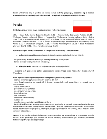 Zanim wybierzesz się w podróż ze swoją nowo nabytą przyczepą, zapoznaj się z naszym przewodnikiem po ważniejszych informacjach i przepisach drogowych w krajach Europy: Polska Dni świąteczne, w które mogą wystąpić zmiany ruchu na drodze: 1.01. – Nowy Rok, Święto Bożej Rodzicielki, 6.01. – Trzech Króli, Objawienie Pańskie, 20.04. – Wielkanoc (święto ruchome), 21.04. – Poniedziałek Wielkanocny (święto ruchome),1.05. –Święto Pracy, 3.05. – Święto Konstytucji 3 Maja, 8.06. – Zesłanie Ducha Świętego (Zielone Świątki), 19.06. – Boże Ciało (święto ruchome), 15.08. – Święto Wojska Polskiego, Wniebowzięcie Najświętszej Maryi Panny, 1.11. – Wszystkich Świętych, 11.11. – Święto Niepodległości, 25.12. – Boże Narodzenie (pierwszy dzień), 26.12. – Boże Narodzenie (drugi dzień). Wybierając się do Polski, należy mieć ze sobą ważne dokumenty i ubezpieczenie: • dokumenty podróży uprawniające do bezwizowego wjazdu i pobytu (do 90 dni): - paszport ważny minimum 3 miesiące ponad planowany okres pobytu - dowód osobisty ważny minimum 6 miesięcy. • ubezpieczenie: – wystarcza krajowe ubezpieczenie pojazdu OC - zalecane jest posiadanie polisy ubezpieczenia zdrowotnego oraz Następstw Nieszczęśliwych Wypadków. Przed wyruszeniem w podróż sprawdź niezbędne wyposażenie pojazdu: - opony o minimalnej głębokości rzeźby bieżnika 1,6 mm - pasy bezpieczeństwa na przednich i tylnych siedzeniach pod warunkiem, że pojazd ma je zamontowane - trójkąt ostrzegawczy - gaśnica z ważną legalizacją - apteczka pierwszej pomocy - linka holownicza - koło zapasowe - podnośnik samochodowy - klucz do kół - komplet zapasowych żarówek i bezpieczników - kamizelki odblaskowe używane przez wszystkich pasażerów w sytuacji opuszczenia pojazdu poza terenem zabudowanym, szczególnie na autostradach i drogach szybkiego ruchu – osoba opuszczająca pojazd jest traktowana jak pieszy, który poruszając się wieczorem lub w nocy, musi mieć na sobie elementy odblaskowe. Uwaga: W przypadku pojazdu holującego przyczepę zaleca się wyposażenie w dodatkowe lusterka boczne. Jeżeli przyczepa jest szersza niż pojazd holujący, obowiązkowe jest również posiadanie dodatkowego trójkąta ostrzegawczego. Obowiązek używania świateł mijania dotyczy: kierującego pojazdem, który ma obowiązek włączenia świateł mijania zawsze w nocy i od świtu do zmierzchu w warunkach złej widoczności przez całą dobę, przez cały rok. Zezwala się na używanie świateł pozycyjnych zamiast mijania w warunkach normalnej przejrzystości powietrza, od świtu do zmierzchu. Zespoły jezdne powinny mieć następujące wymiary: - wysokość zewnętrzna – 4,0 m - szerokość zewnętrzna – 2,55 m - długość zewnętrzna zespołu pojazdów (samochód + przyczepa) – 18,75 m. Uprawnienia do prowadzenia pojazdu mają tylko osoby pełnoletnie, które ukończyły 18 lat oraz posiadają prawo jazdy. Kategoria B dotyczy samochodów osobowych do 3,5 t oraz przyczep do 750 kg. Kierowca musi także posiadać dowód rejestracyjny pojazdu oraz obowiązkowe ubezpieczenie OC. Zasady przewozu dzieci: Dzieci do 12 lat i 150 cm wzrostu muszą być przewożone w specjalnych fotelikach lub siedziskach dostosowanych do wymiarów i wagi dziecka. Na drodze należy poruszać się zgodnie z tabelą ograniczenia prędkości, km/h: - na terenie zabudowanym – do 50 km/h, o ile znaki nie wskazują inaczej w godzinach 5:00 – 23:00 i do 60 km/h w godzinach 23:00 – 5:00; - na terenie niezabudowanym – do 90 km/h na drodze jednojezdniowej i 100 km/h na drodze dwujezdniowej, na drogach ekspresowych – do 100 km/h na drodze jednojezdniowej i do 120 km/h na drodze dwujezdniowej, na autostradach obowiązuje ograniczenie prędkości do 140 km/h. W wyznaczonych strefach zamieszkania (wewnętrznych drogach osiedlowych) maksymalna prędkość to 20 km/h. Prędkości jazdy z przyczepą w Polsce: obszar prędkość [km/h] zabudowany 5:00 – 23:00 50 23:00 – 5:00 60 autostrady 80 drogi ekspresowe 80 droga dwujezdniowa co najmniej o 2 pasach 80 przeznaczonych dla każdego kierunku ruchu pozostałe drogi 70 Kwestia opłat drogowych na terytorium Polski – Pojazdy oraz zespoły pojazdów o DMC do 3,5 t podlegają opłatom za poruszanie się po większości autostrad. Wysokość opłat uzależniona jest od przejechanego odcinka drogi i płatna jest gotówką lub kartą na bramkach. Pojazdy oraz zespoły pojazdów o DMC pow. 3,5 t podlegają opłatom w systemie elektronicznym. Więcej informacji można znaleźć na stronie: www.viatoll.pl. Zimowe wyposażenie pojazdu – używanie łańcuchów przeciwślizgowych jest dozwolone, a nawet nakazane podczas niesprzyjających warunków zimowych oraz w miejscach oznaczonych znakami drogowymi. W okresie zimowym wskazane jest korzystanie z opon zimowych. Obowiązuje bezwzględny zakaz używania opon okolcowanych. Jeśli potrzebujesz pomocy, a przebywasz obecnie w Polsce, skontaktuj się z: • • • • • pomocą drogową – świadczy usługi 24h: 9637 policją – 997 pogotowiem ratunkowym – 999 strażą pożarną – 998 zunifikowanym numerem alarmowym – 112