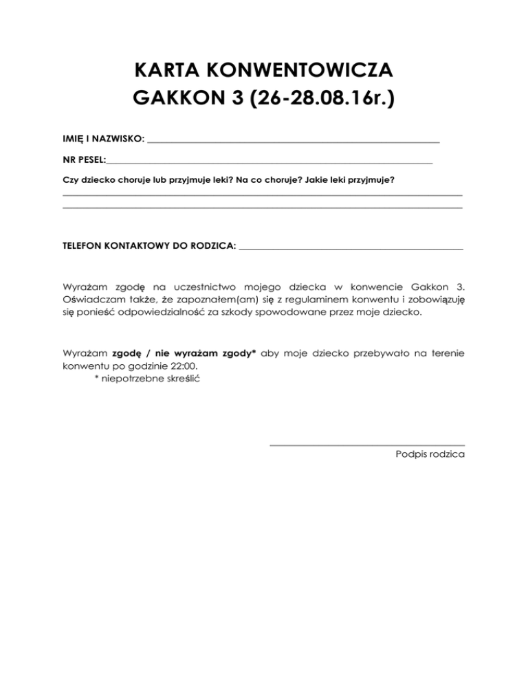 KARTA KONWENTOWICZA GAKKON 3 (26-28.08.16r.) IMIĘ I NAZWISKO: ____________________________________________________________ NR PESEL:___________________________________________________________________ Czy dziecko choruje lub przyjmuje leki? Na co choruje? Jakie leki przyjmuje? __________________________________________________________________________________ __________________________________________________________________________________ TELEFON KONTAKTOWY DO RODZICA: ______________________________________________ Wyrażam zgodę na uczestnictwo mojego dziecka w konwencie Gakkon 3. Oświadczam także, że zapoznałem(am) się z regulaminem konwentu i zobowiązuję się ponieść odpowiedzialność za szkody spowodowane przez moje dziecko. Wyrażam zgodę / nie wyrażam zgody* aby moje dziecko przebywało na terenie konwentu po godzinie 22:00. * niepotrzebne skreślić ________________________________________ Podpis rodzica