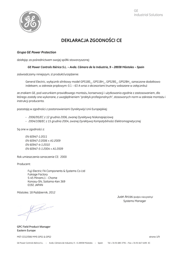 GE Industrial Solutions DEKLARACJA ZGODNOŚCI CE Grupa GE Power Protection działając za pośrednictwem swojej spółki stowarzyszonej: GE Power Controls Ibérica S.L. – Avda. Cámara de la Industria, 9 – 28938 Móstoles – Spain zaświadczamy niniejszym, iż produkt/urządzenie: General Electric, wyłącznik silnikowy model GPS1BS_, GPS1BH_, GPS2BS_, GPS2BH_ oznaczone dodatkowo indeksem, w zakresie prądowym: 0.1 – 63 A wraz z akcesoriami (numery wskazane w załączniku) ze znakiem GE, pod warunkiem prawidłowego montażu, konserwacji i użytkowania zgodnie z zastosowaniem, dla którego zostały one wykonane, z uwzględnieniem “praktyk profesjonalnych”, stosowanych norm w zakresie montażu i instrukcji producenta. pozostają w zgodności z postanowieniami Dyrektyw(y) Unii Europejskiej: - 2006/95/EC z 12 grudnia 2006, zwanej Dyrektywą Niskonapięciową - 2004/108/EC z 15 grudnia 2004, zwanej Dyrektywą Kompatybilności Elektromagnetycznej Są one w zgodności z: EN 60947-1:2011 EN 60947-2:2006 + A1:2009 EN 60947-4-1:2010 EN 60947-5-1:2004 + A1:2009 Rok umieszczenia oznaczenie CE: 2000 Producent: Fuji Electric FA Components & Systems Co Ltd Fukiage Factory 5-45 Minami,1 - Chome Konosu-Shi, Saitama-Ken 369 0192 JAPAN Móstoles: 18 Październik, 2012 Juan Arcas (podpis nieczytelny) Systems Manager GPC Field Product Manager Eastern Europe MST-CE12/006 MMS GPS1 & GPS2 GE Power Controls Ibérica S.L. – Avda. Cámara de Industria, 9 – E-28938 Móstoles strona 1/9 – Spain Tel + 34 91 685 3791 – Fax + 34 91 647 4495 EC