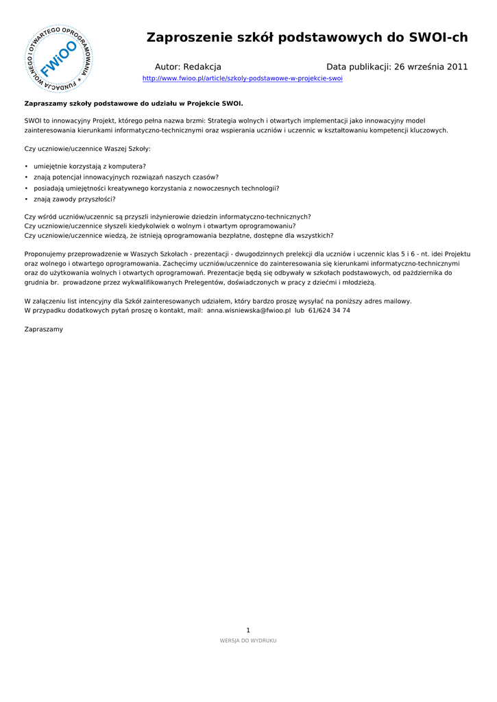 Zaproszenie szkół podstawowych do SWOI-ch Autor: Redakcja Data publikacji: 26 września 2011 http://www.fwioo.pl/article/szkoly-podstawowe-w-projekcie-swoi Zapraszamy szkoły podstawowe do udziału w Projekcie SWOI. SWOI to innowacyjny Projekt, którego pełna nazwa brzmi: Strategia wolnych i otwartych implementacji jako innowacyjny model zainteresowania kierunkami informatyczno-technicznymi oraz wspierania uczniów i uczennic w kształtowaniu kompetencji kluczowych. Czy uczniowie/uczennice Waszej Szkoły: • umiejętnie korzystają z komputera? • znają potencjał innowacyjnych rozwiązań naszych czasów? • posiadają umiejętności kreatywnego korzystania z nowoczesnych technologii? • znają zawody przyszłości? Czy wśród uczniów/uczennic są przyszli inżynierowie dziedzin informatyczno-technicznych? Czy uczniowie/uczennice słyszeli kiedykolwiek o wolnym i otwartym oprogramowaniu? Czy uczniowie/uczennice wiedzą, że istnieją oprogramowania bezpłatne, dostępne dla wszystkich? Proponujemy przeprowadzenie w Waszych Szkołach - prezentacji - dwugodzinnych prelekcji dla uczniów i uczennic klas 5 i 6 - nt. idei Projektu oraz wolnego i otwartego oprogramowania. Zachęcimy uczniów/uczennice do zainteresowania się kierunkami informatyczno-technicznymi oraz do użytkowania wolnych i otwartych oprogramowań. Prezentacje będą się odbywały w szkołach podstawowych, od pażdziernika do grudnia br. prowadzone przez wykwalifikowanych Prelegentów, doświadczonych w pracy z dziećmi i młodzieżą. W załączeniu list intencyjny dla Szkół zainteresowanych udziałem, który bardzo proszę wysyłać na poniższy adres mailowy. W przypadku dodatkowych pytań proszę o kontakt, mail: [email protected] lub 61/624 34 74 Zapraszamy 1 WERSJA DO WYDRUKU