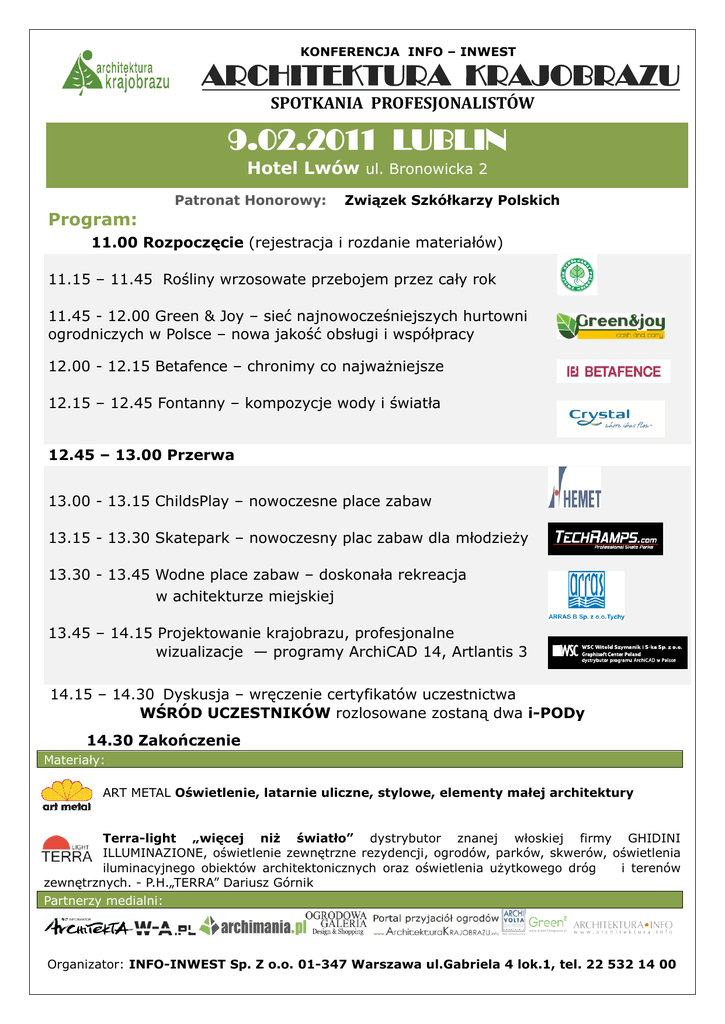 KONFERENCJA INFO – INWEST ARCHITEKTURA KRAJOBRAZU SPOTKANIA PROFESJONALISTÓW 9.02.2011 LUBLIN Hotel Lwów ul. Bronowicka 2 Program: Patronat Honorowy: Związek Szkółkarzy Polskich 11.00 Rozpoczęcie (rejestracja i rozdanie materiałów) 11.15 – 11.45 Rośliny wrzosowate przebojem przez cały rok 11.45 12.00 Green & Joy – sieć najnowocześniejszych hurtowni ogrodniczych w Polsce – nowa jakość obsługi i współpracy 12.00 12.15 Betafence – chronimy co najważniejsze 12.15 – 12.45 Fontanny – kompozycje wody i światła 12.45 – 13.00 Przerwa 13.00 13.15 ChildsPlay – nowoczesne place zabaw 13.15 13.30 Skatepark – nowoczesny plac zabaw dla młodzieży 13.30 13.45 Wodne place zabaw – doskonała rekreacja w achitekturze miejskiej 13.45 – 14.15 Projektowanie krajobrazu, profesjonalne wizualizacje — programy ArchiCAD 14, Artlantis 3 14.15 – 14.30 Dyskusja – wręczenie certyfikatów uczestnictwa WŚRÓD UCZESTNIKÓW rozlosowane zostaną dwa iPODy 14.30 Zakończenie Materiały: ART METAL Oświetlenie, latarnie uliczne, stylowe, elementy małej architektury Terralight „więcej niż światło” dystrybutor znanej włoskiej firmy GHIDINI ILLUMINAZIONE, oświetlenie zewnętrzne rezydencji, ogrodów, parków, skwerów, oświetlenia iluminacyjnego obiektów architektonicznych oraz oświetlenia użytkowego dróg i terenów zewnętrznych. P.H.„TERRA” Dariusz Górnik Partnerzy medialni: Organizator: INFOINWEST Sp. Z o.o. 01347 Warszawa ul.Gabriela 4 lok.1, tel. 22 532 14 00
